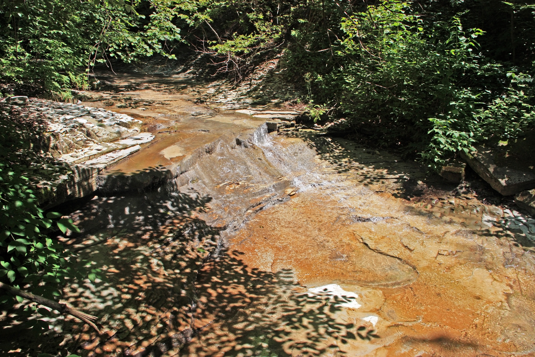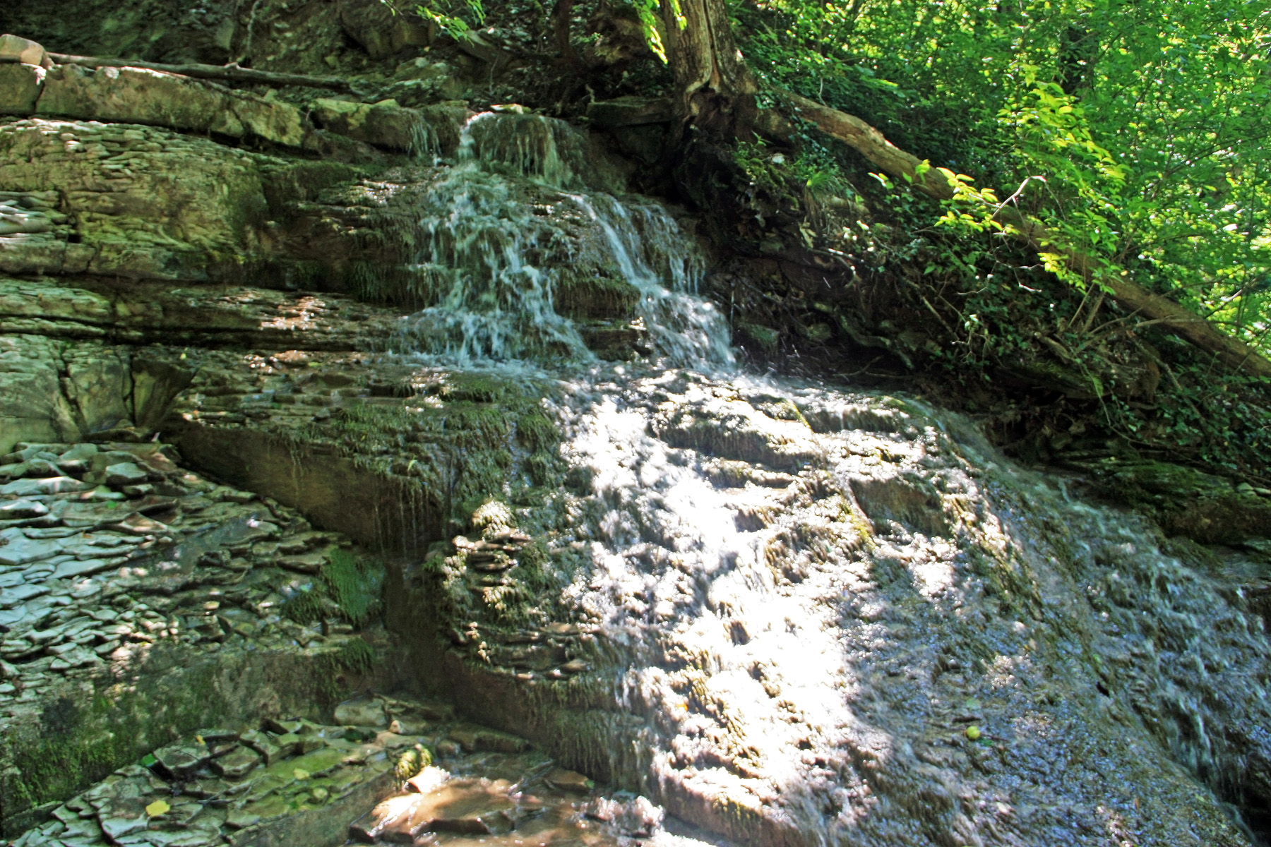 Наверху вновь плита в русле. Похоже, перед каждым водопадом потоки воды очищают русло до «коренной плиты». Походил здесь с фотоаппаратом, поснимал. Поворачиваю вверх по течению.