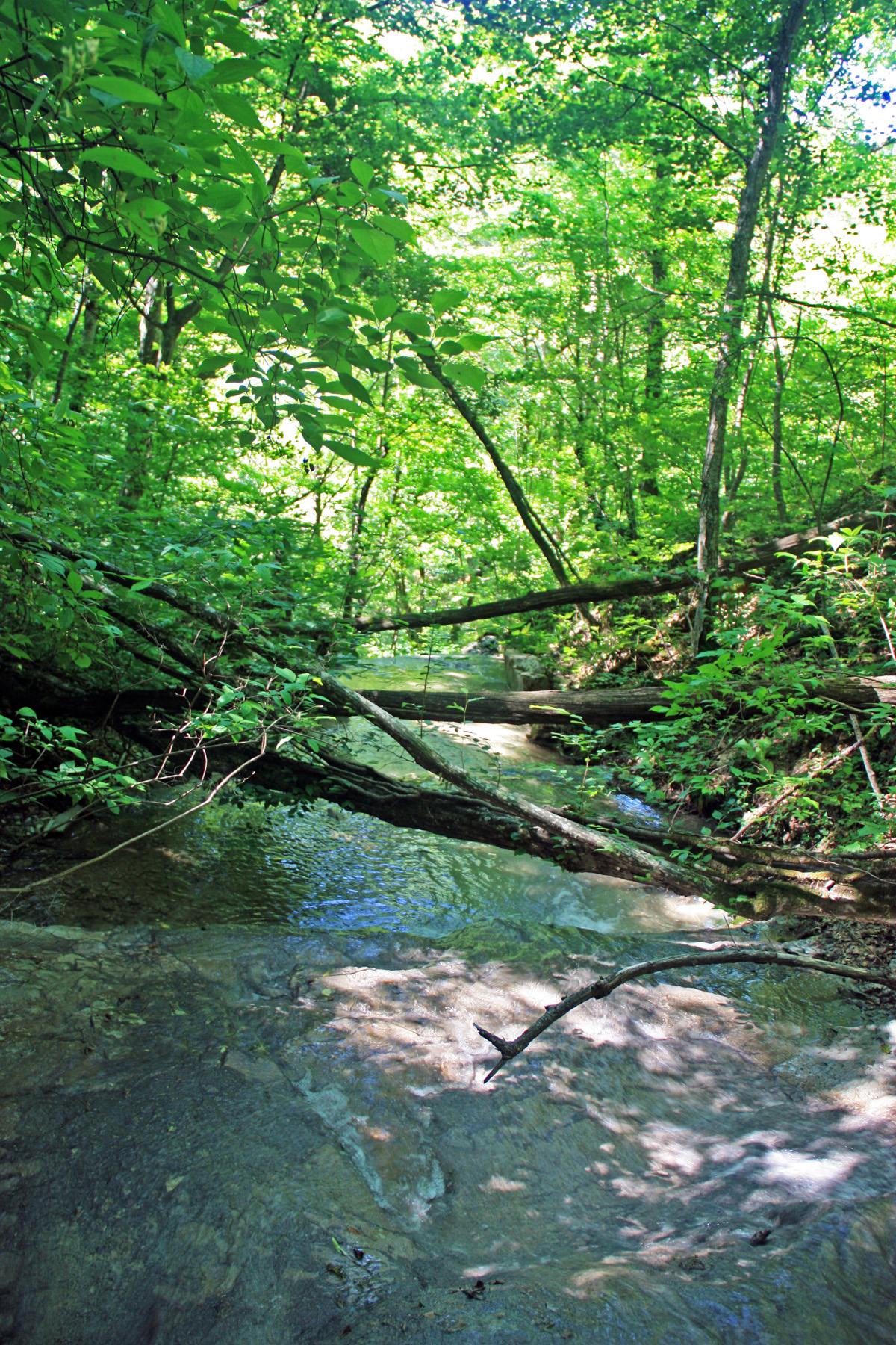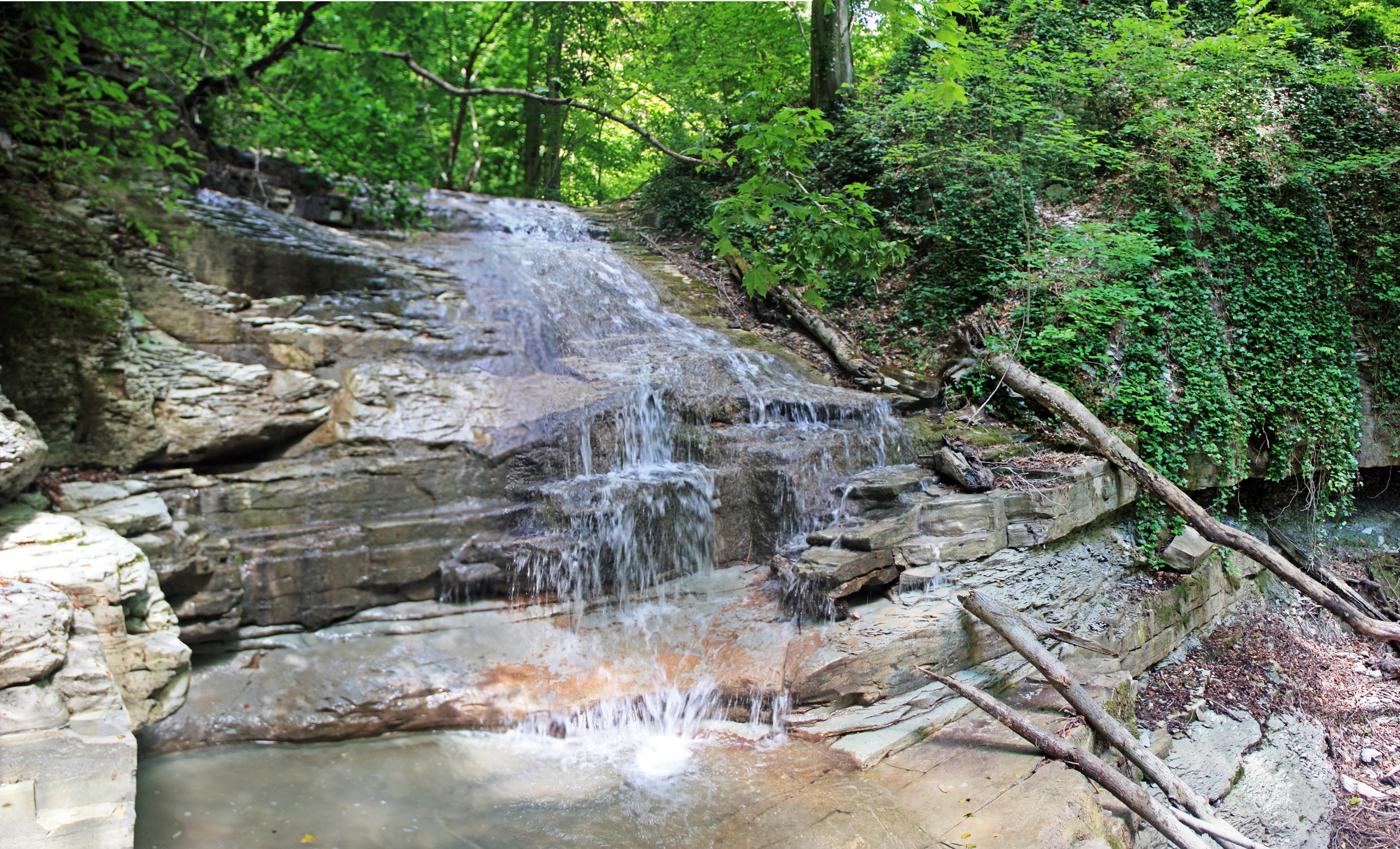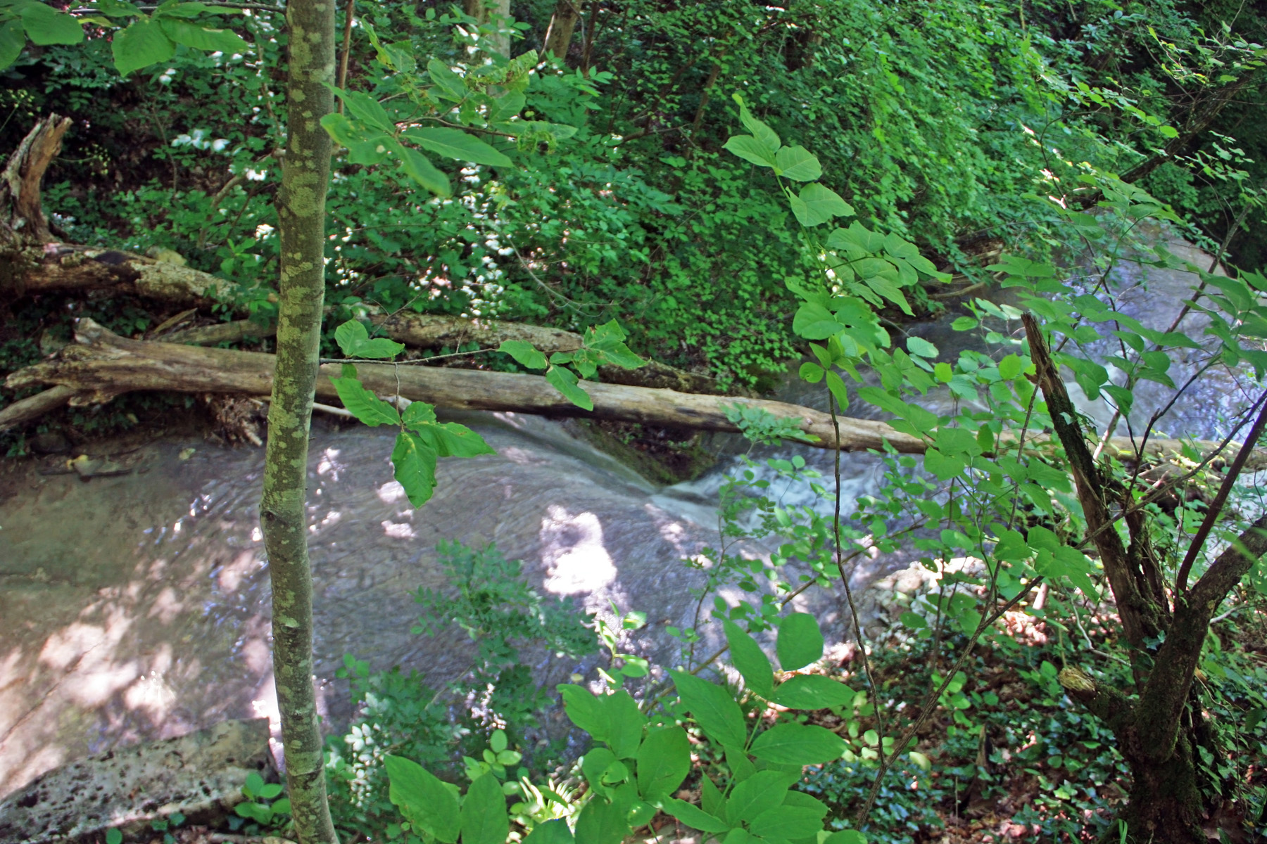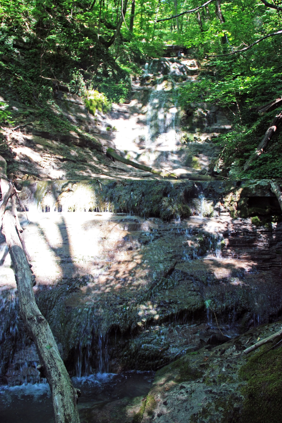 Заваленная ступень высотой метра 3. Обхожу справа, по краю ступени. Мешают низкие ветви. Выше вижу ещё небольшой каскад из нескольких ступеней. Получается, между небольшими ступенями имеются горизонтальные площадки длиной 10-50 метров. Подхожу ближе, высота нижней ступени, метра 2, обход справа, вдоль лежащего бревна.
