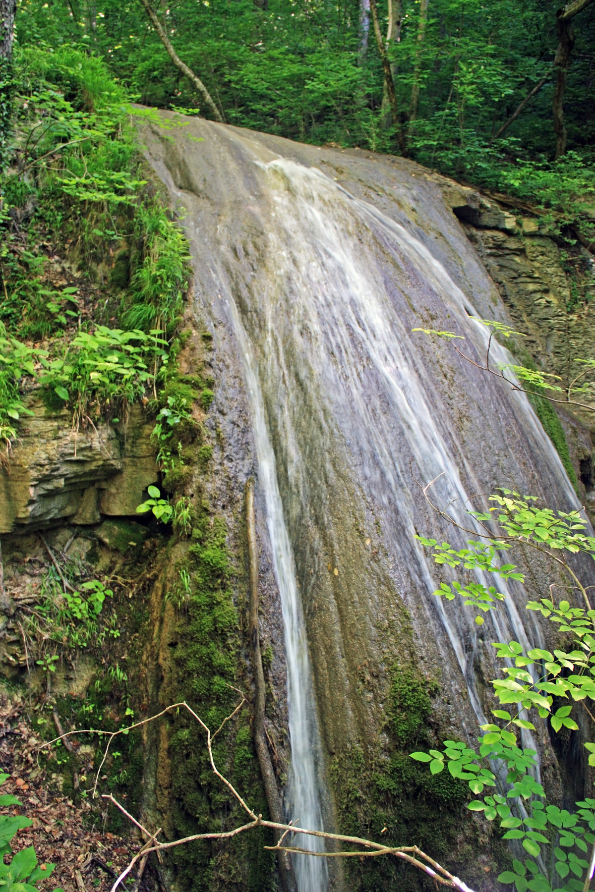 Подхожу ближе, рассматриваю, фотографирую. Особенность, вода стекает по мощному наносу (наплыву, отложениям). Ширина образования 4-5 метров, толщина-2-3 метра. Высота ступени, 4-5 метров. Обхожу справа по склону. Склон более-менее пологий, только подлесок густой.