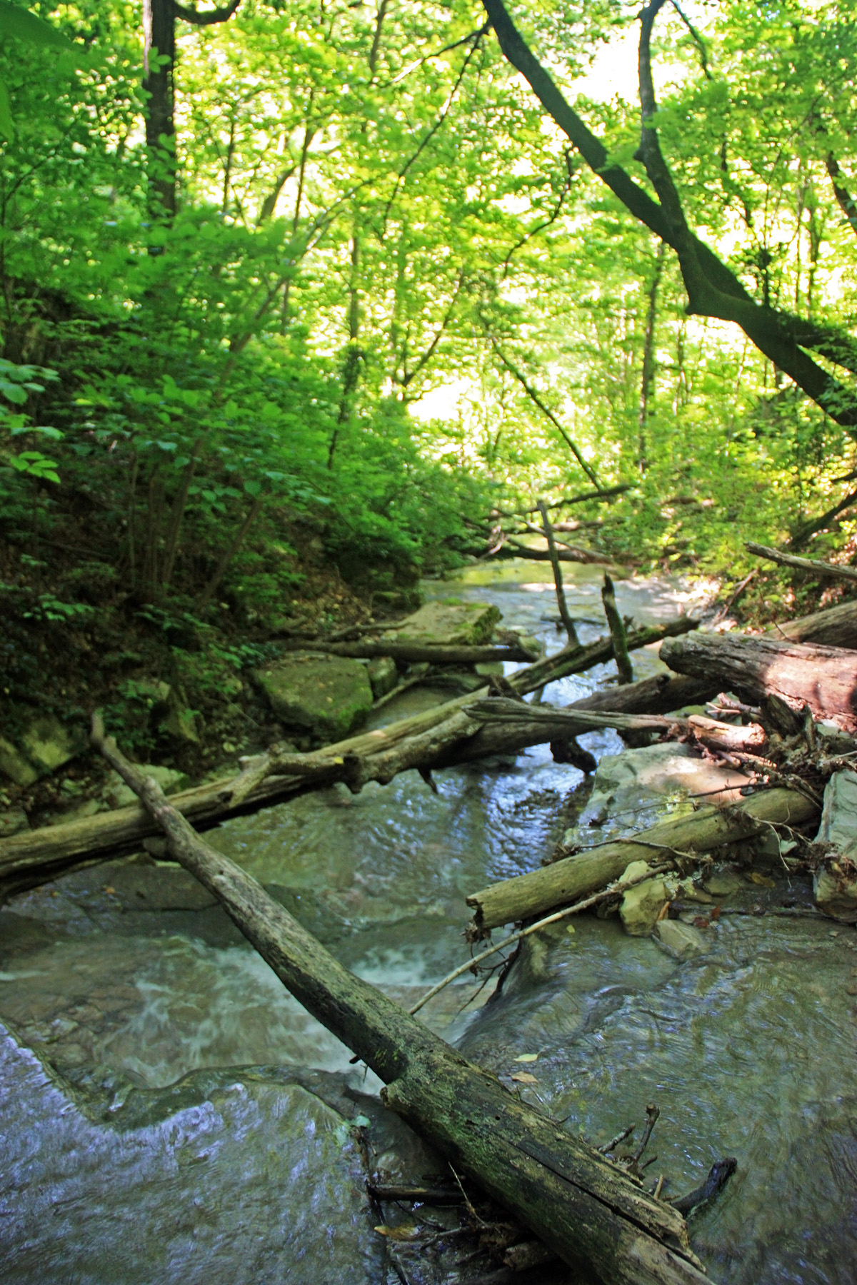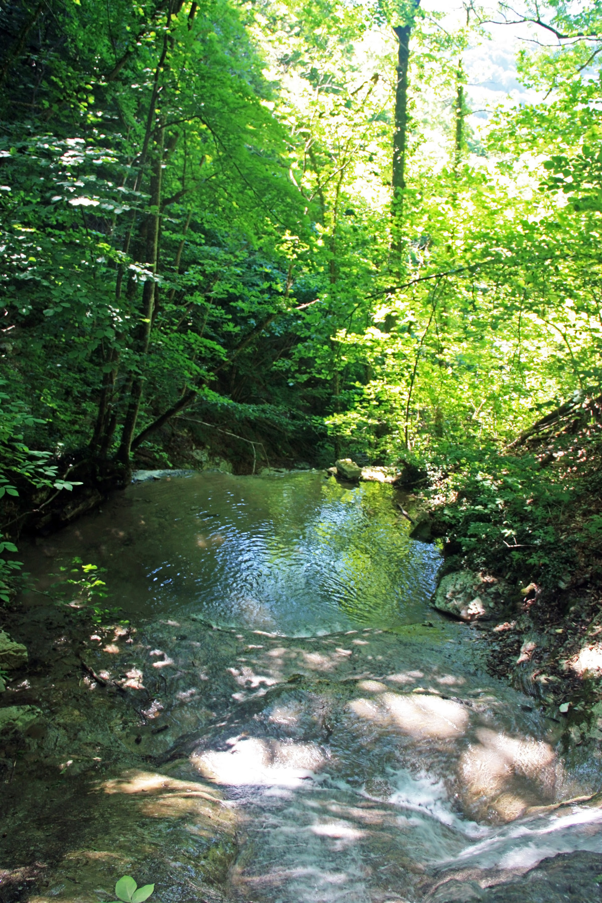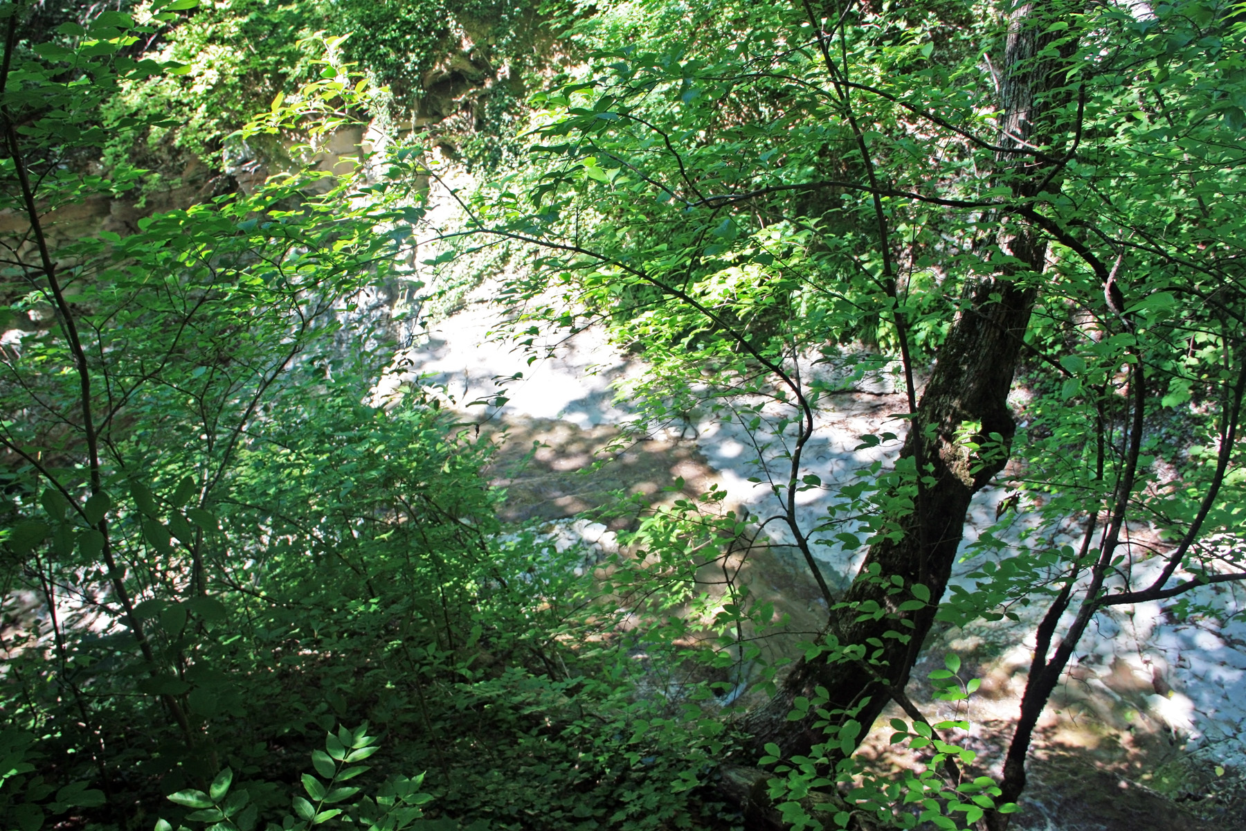 Перед ступенью вижу небольшой откос берега, покрытый зарослями подлеска. На нём делаю привал. Хоть и поднимаюсь в тени, и под ногами холодная вода, но жарко, пот ручьями. Футболка промокла насквозь, хоть выжимай. Время 9-40. Почти 30 минут «в наборе высоты». В общем, устал. Отдыхаю, «осматриваюсь» через объектив. Окрестностей вокруг не видно из-за листвы. Решаю сходить наверх «в разведку» без рюкзака, налегке. Может пора выходить из русла?