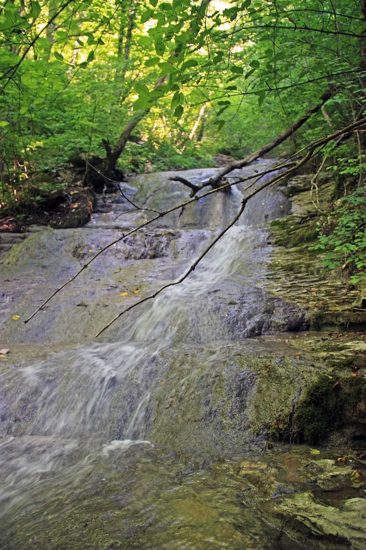 Выше водослив, а ещё выше, ещё ступенька в 1,5 метра. Заползаю выше, и там скальное русло. Крутизна общего уклона русла менее 45 градусов. Но этот уклон долго тянется. Тянется участками с уклоном то 20 градусов, то 40. Шероховатость ложа позволяет идти по нему, без обходов по склону. Это облегчает движение. Набираю высоту, метров 30-40, выхожу к очередной ступени, высотой 5-6 метров. Русло узкое, ветви деревьев с обоих бортов ущельица перед ним перекрывают небо над головой. И опускаются на уровень груди, а то и ниже. Здесь это помеха.