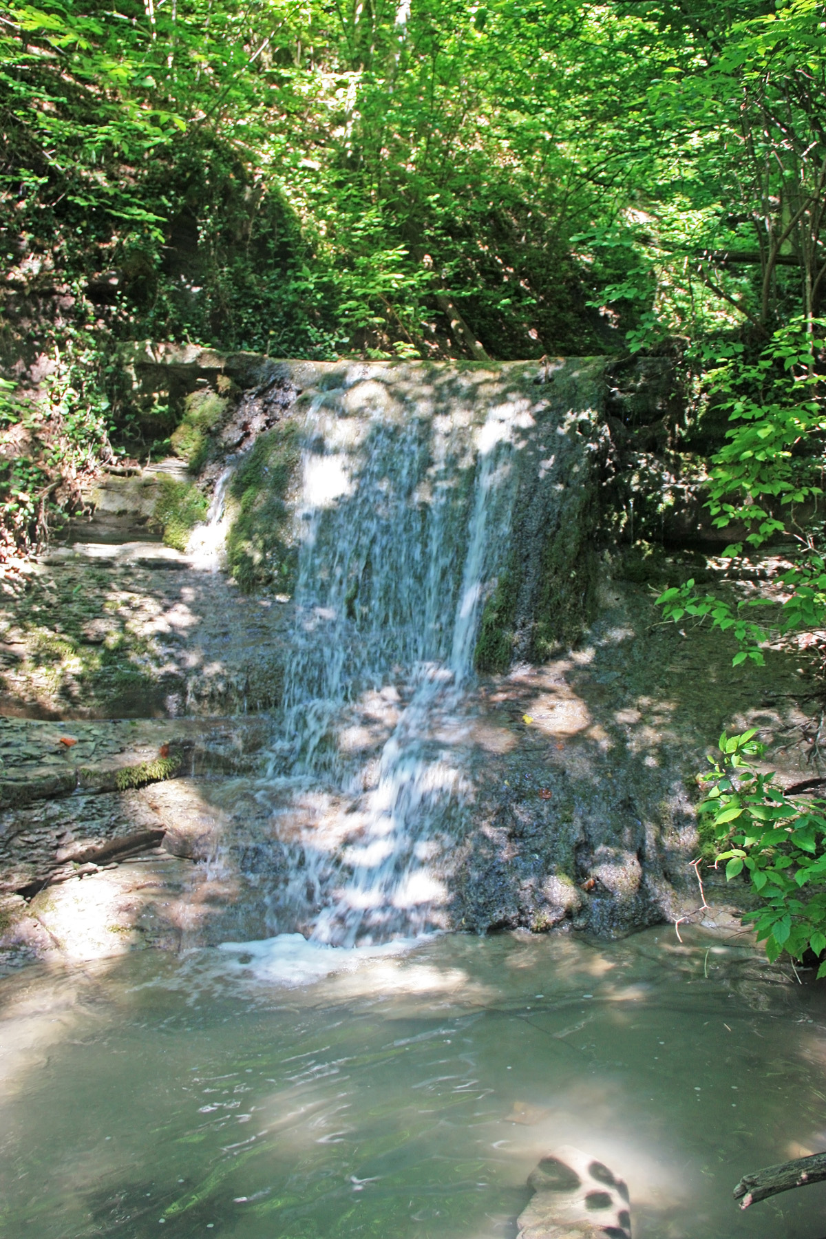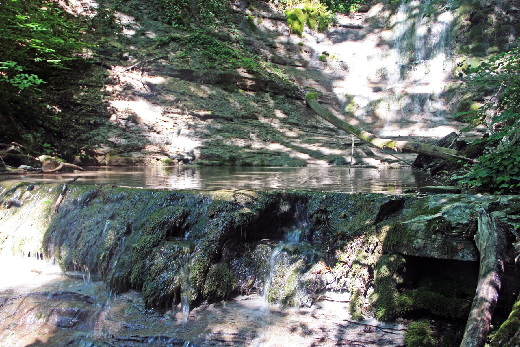 В 9-57 подхожу к каскаду, от которого вернулся назад. В каскаде две ступени. Нижняя в 1,5 метра высотой (вода в ванне над ней на уровне глаз). Верхняя ступень в 3 метра. Поднимаюсь на неё, а выше ещё одна, в те же, 3 метра. И зазоры меж ними в 5-10 метров. Третью ступень даже «отпанорамил».