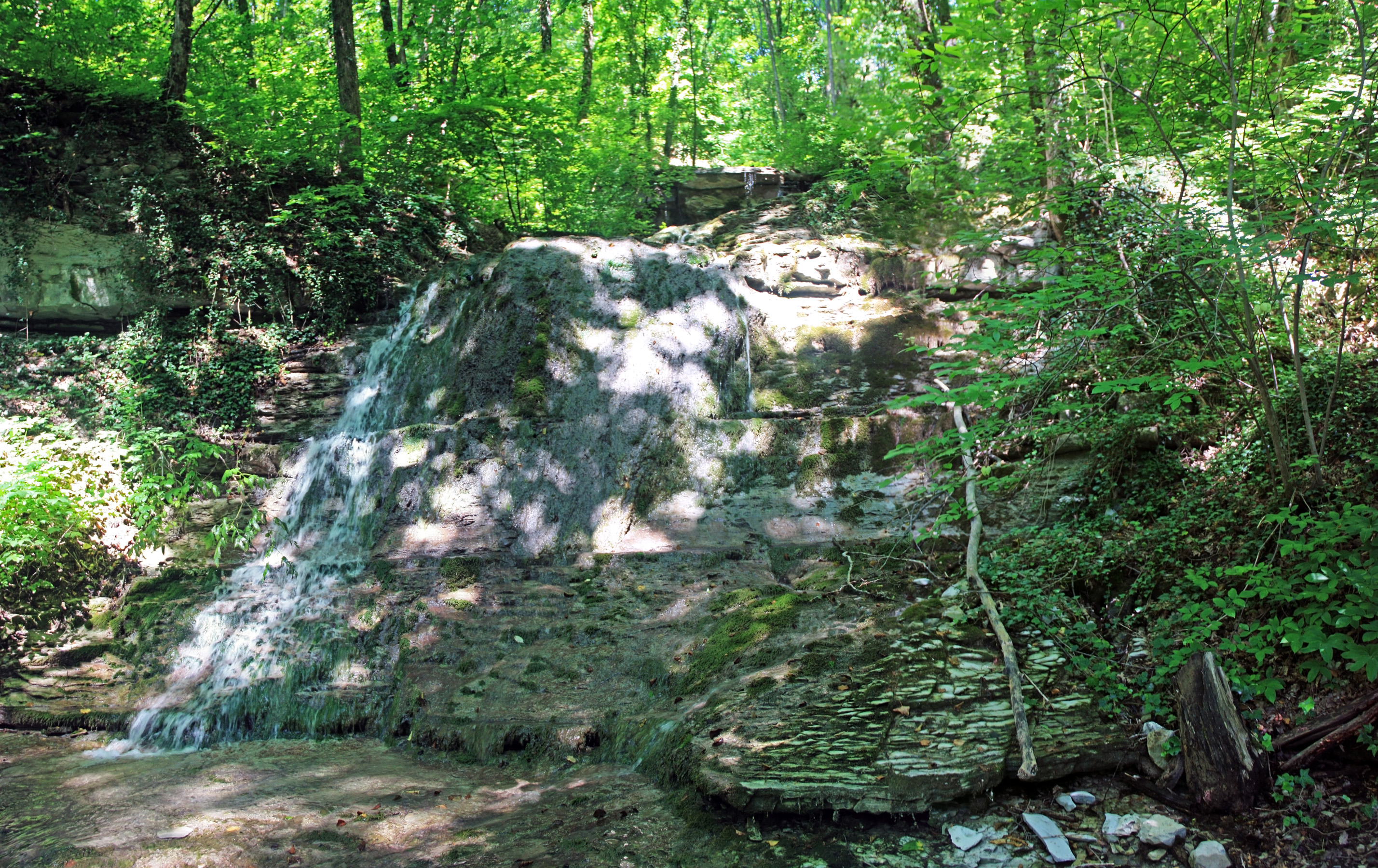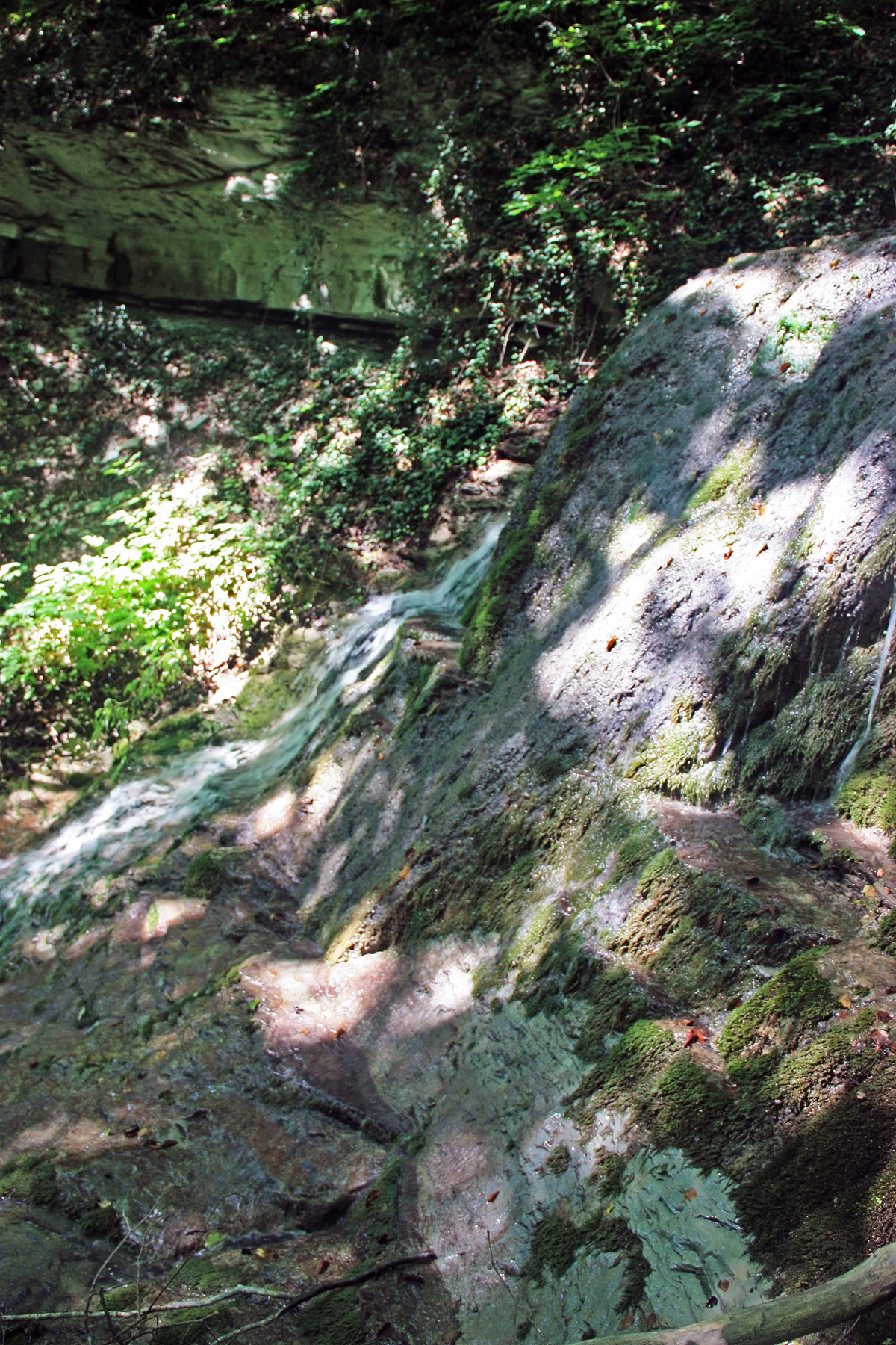 По плите прохожу в пределах 100 метров. В конце завал из камней и щебня. За ним видна скальная стенка. Правее, сквозь листу, просматривается водопад. Очередной. 4-й кажется, не считая мелких ступеней.