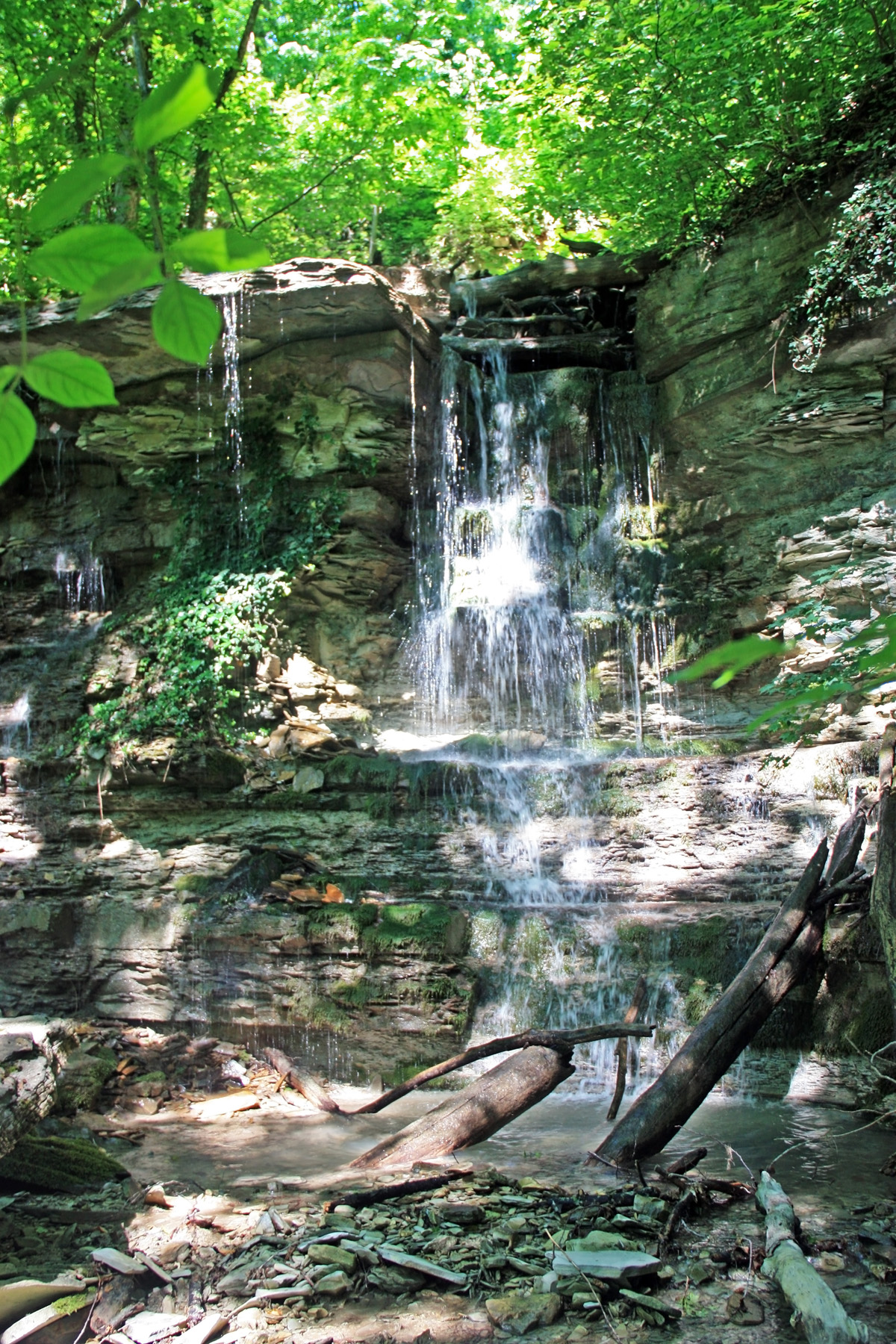 Передо мной завал из нескольких брёвен. Вниз просматриваются три ступени до Первого водопада. Посмотрел, варианты спуска не понравились. Решил не спускаться. Сразу пошёл вверх.