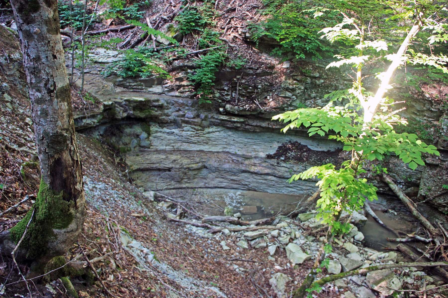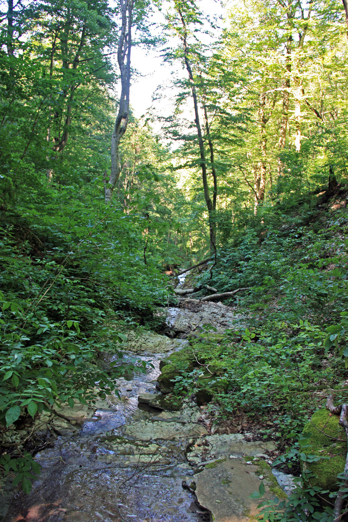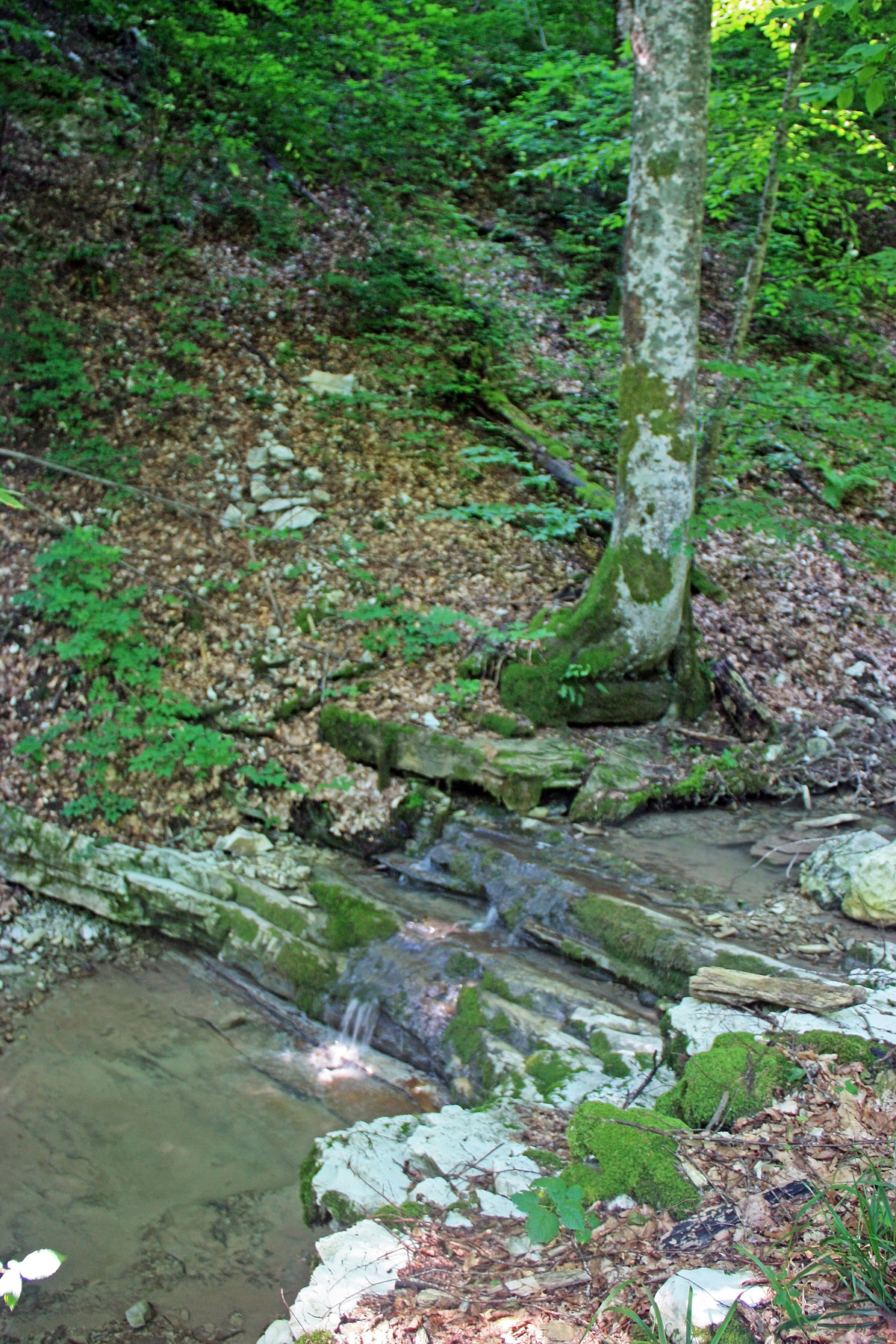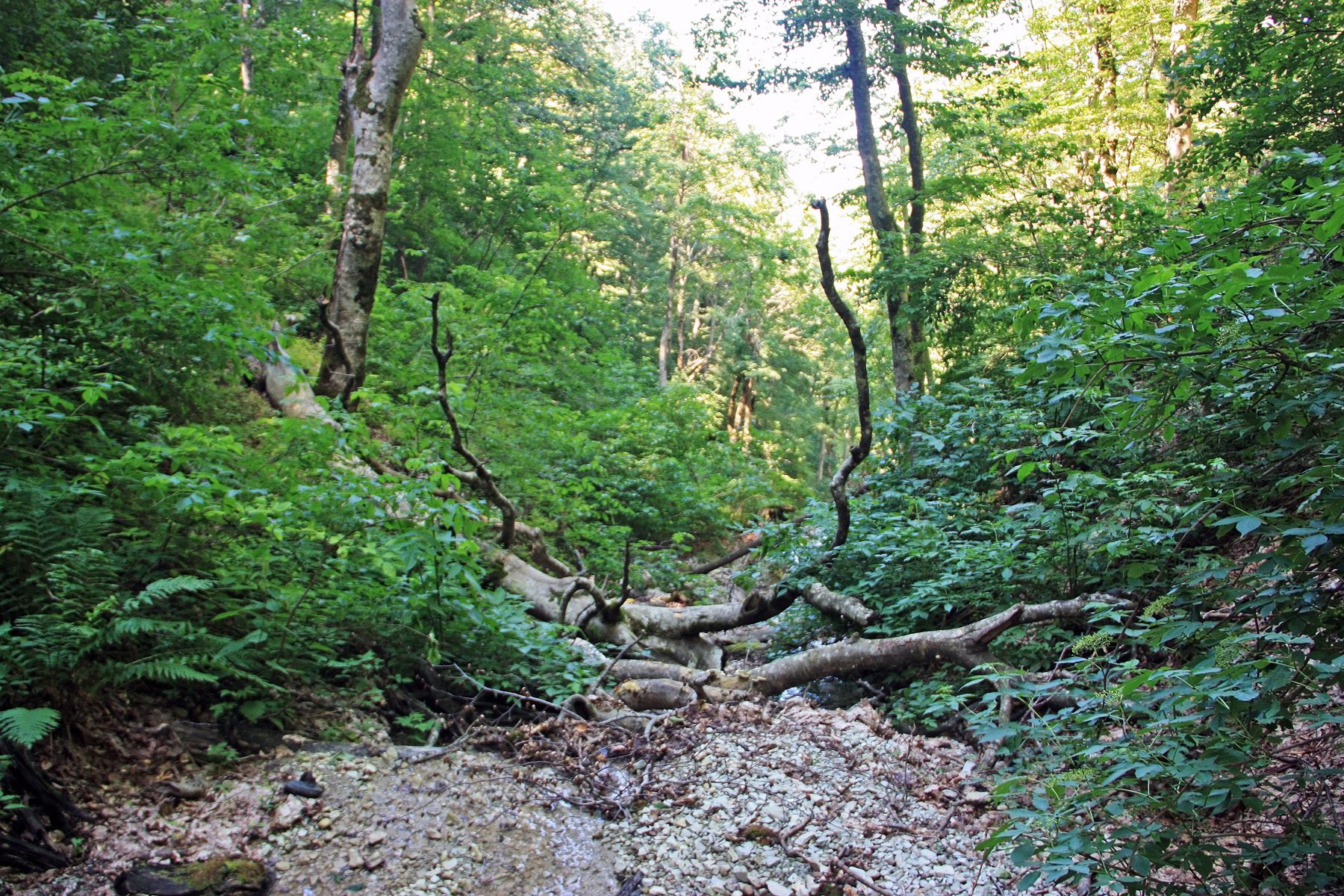 Слева подходит ручей, значительно слабее этих потоков со стены. Но туда же, влево, идёт основное ущелье этого русла. А эти потоки выглядят притоком к основному руслу. Основное русло сильно засыпано камнями, сучьями, упавшими деревьями. Ручей теряется под ногами, меж крупных камней. Прохожу по руслу в пределах 100 метров. Опять оголённые водой скальные пласты справа. Заметный основной ручей, откуда-то сверху. И несколько сочащихся из склона и щелей слабеньких струек. Останавливаюсь отдохнуть, не снимая рюкзака. Осматриваюсь. Время 10-52.