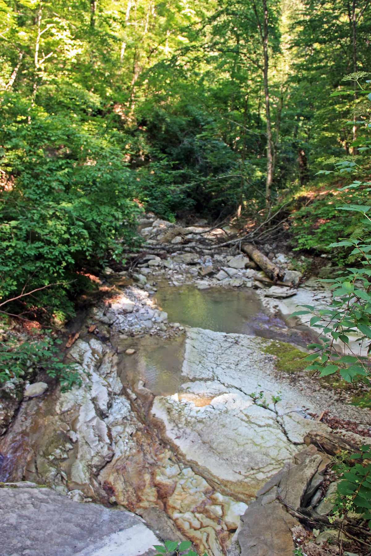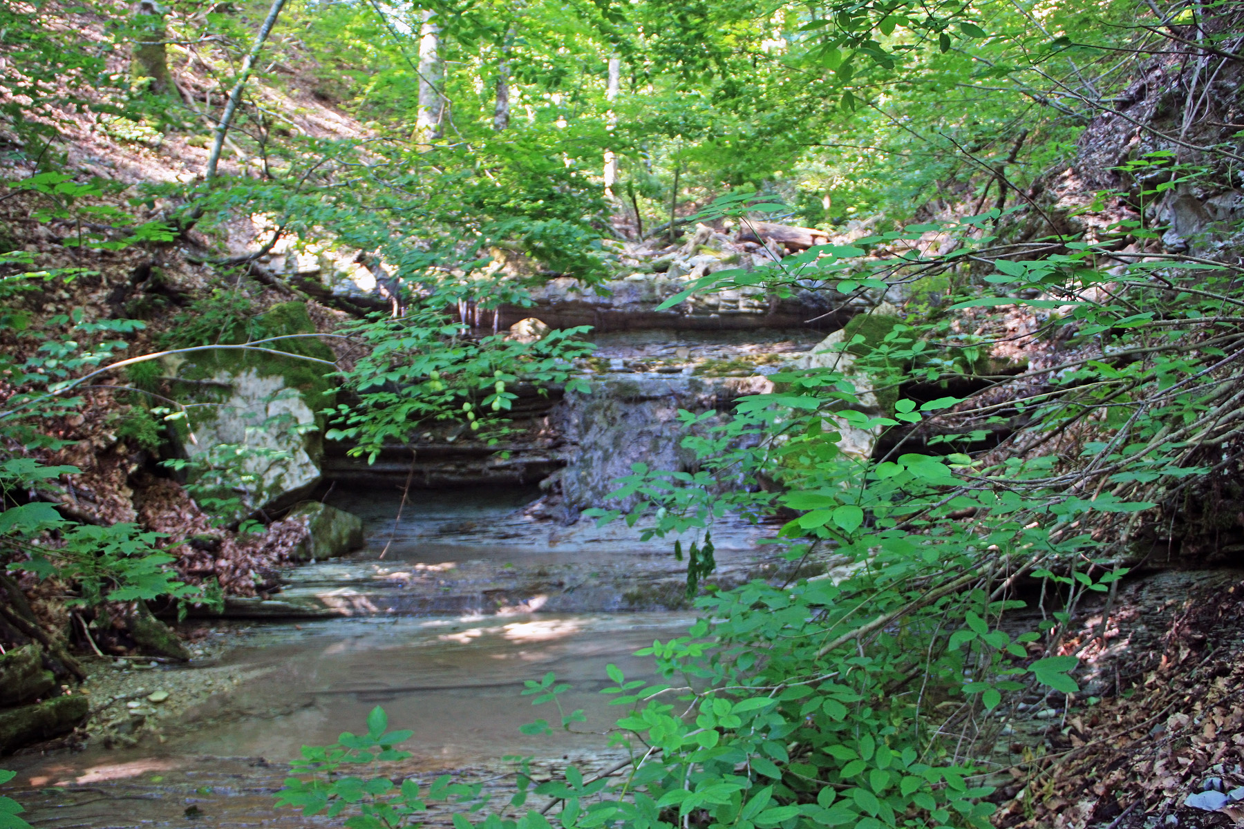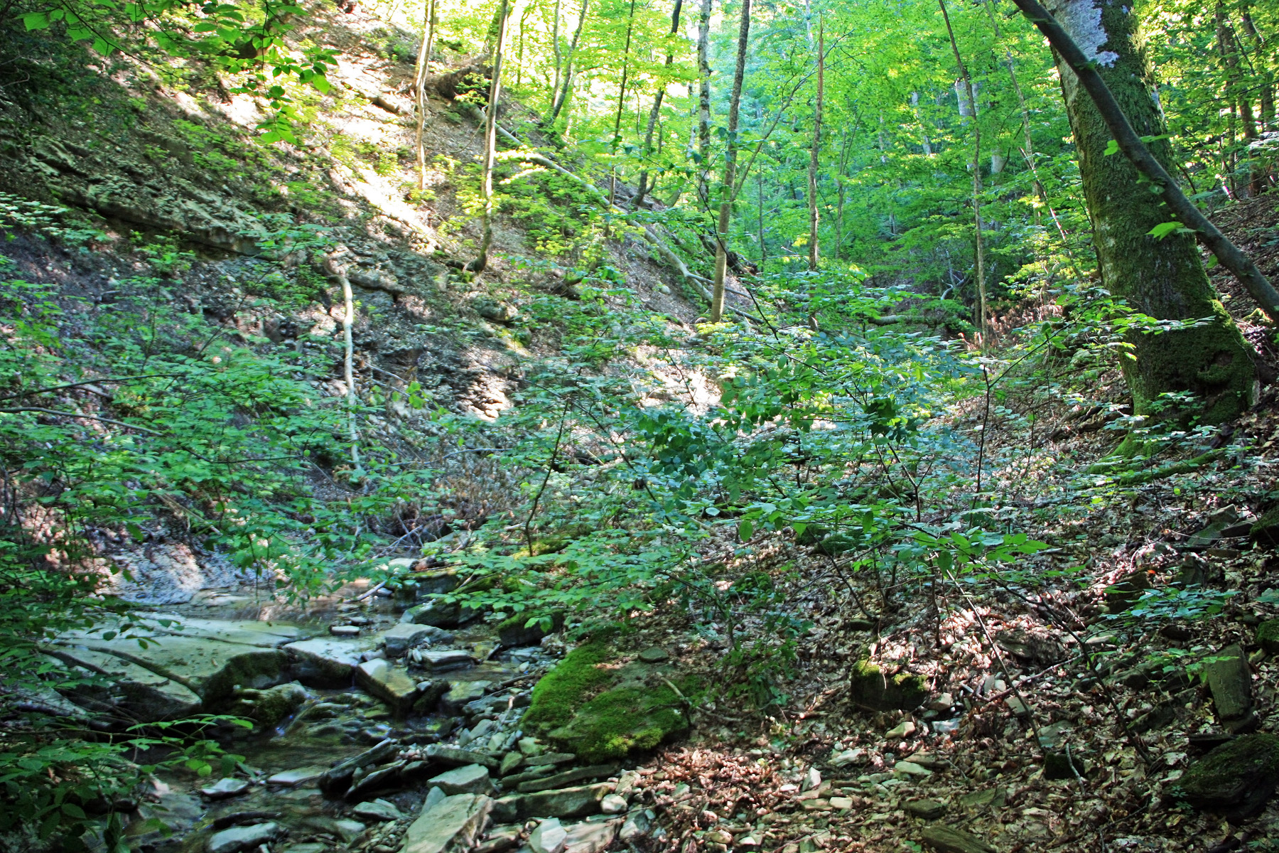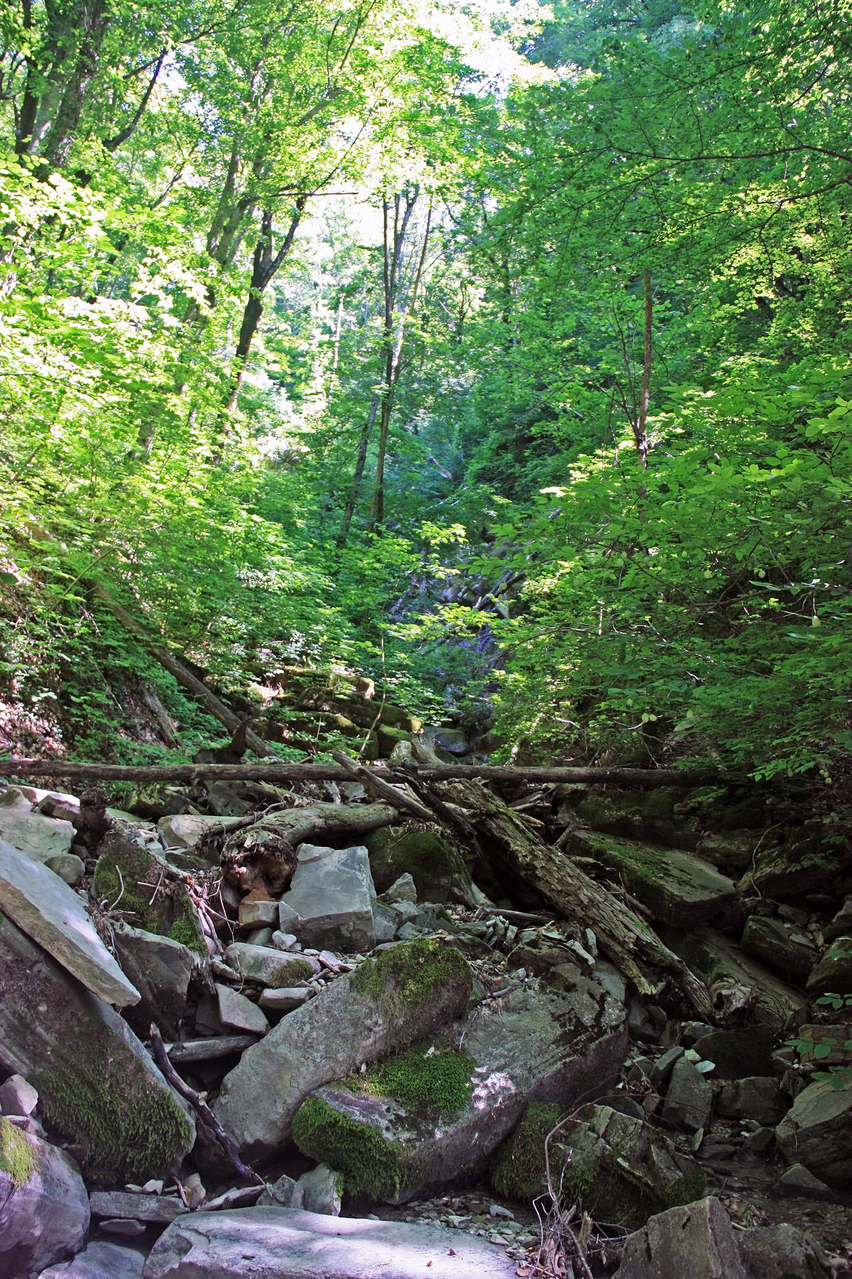 Слева подходит ручей, значительно слабее этих потоков со стены. Но туда же, влево, идёт основное ущелье этого русла. А эти потоки выглядят притоком к основному руслу. Основное русло сильно засыпано камнями, сучьями, упавшими деревьями. Ручей теряется под ногами, меж крупных камней. Прохожу по руслу в пределах 100 метров. Опять оголённые водой скальные пласты справа. Заметный основной ручей, откуда-то сверху. И несколько сочащихся из склона и щелей слабеньких струек. Останавливаюсь отдохнуть, не снимая рюкзака. Осматриваюсь. Время 10-52.