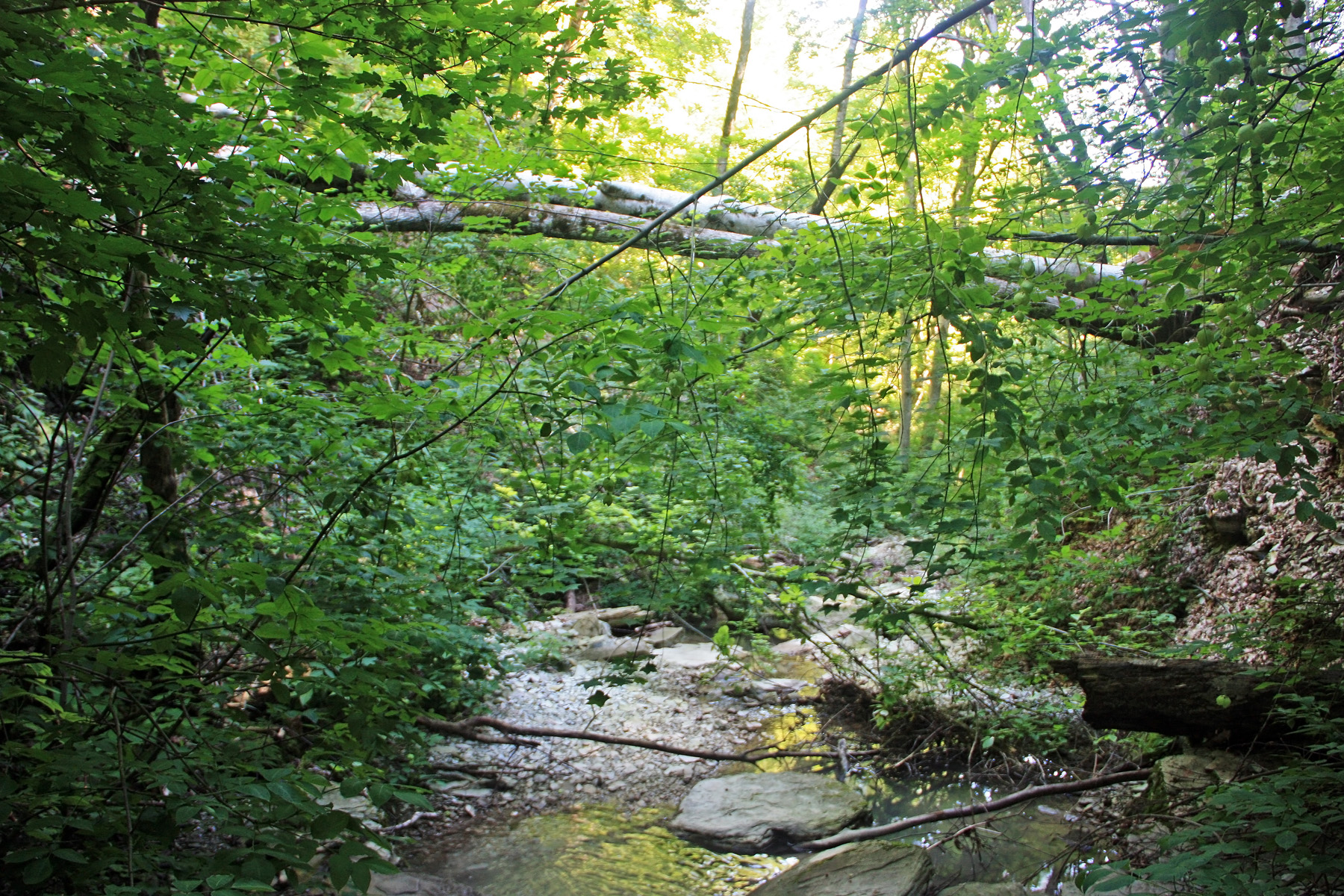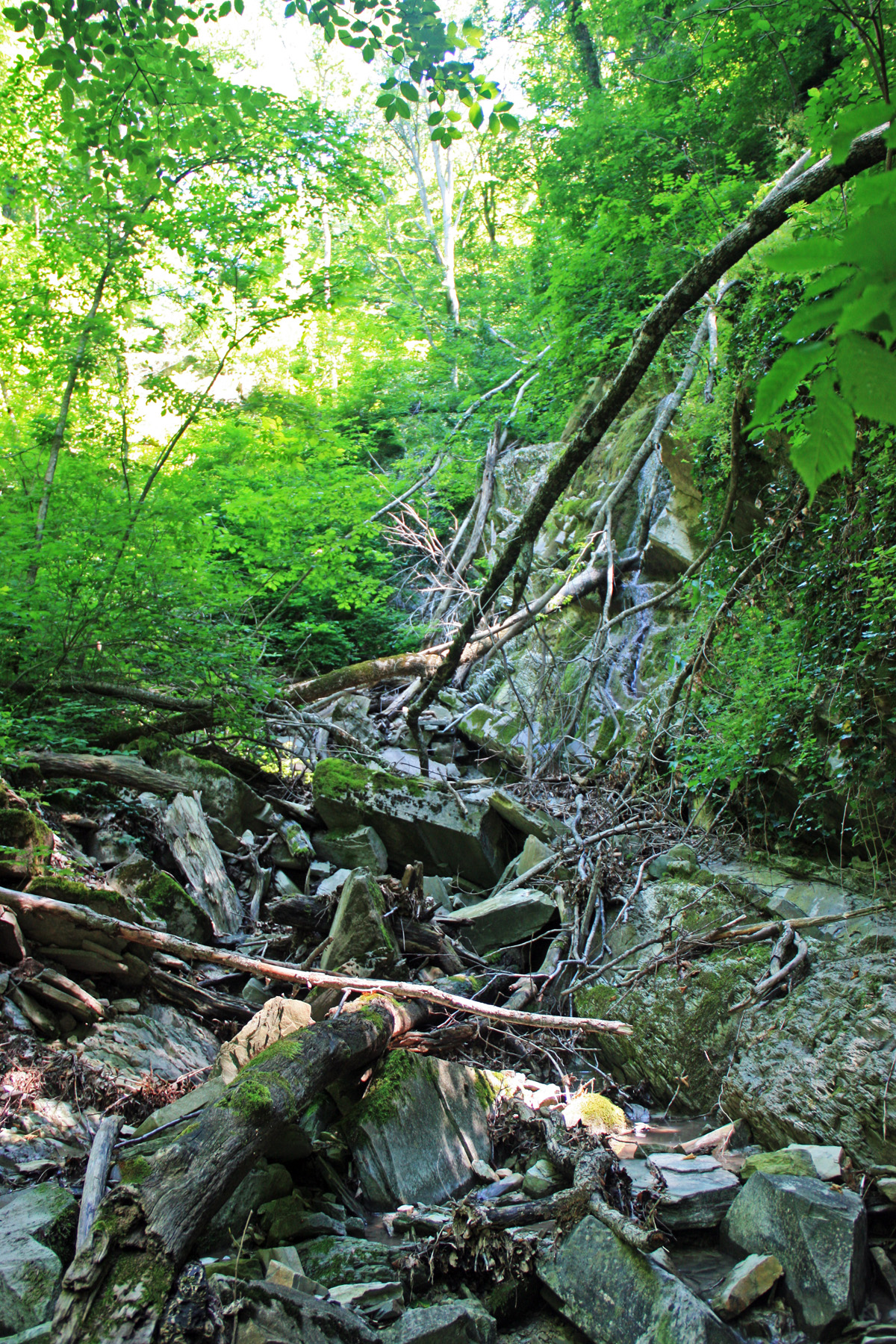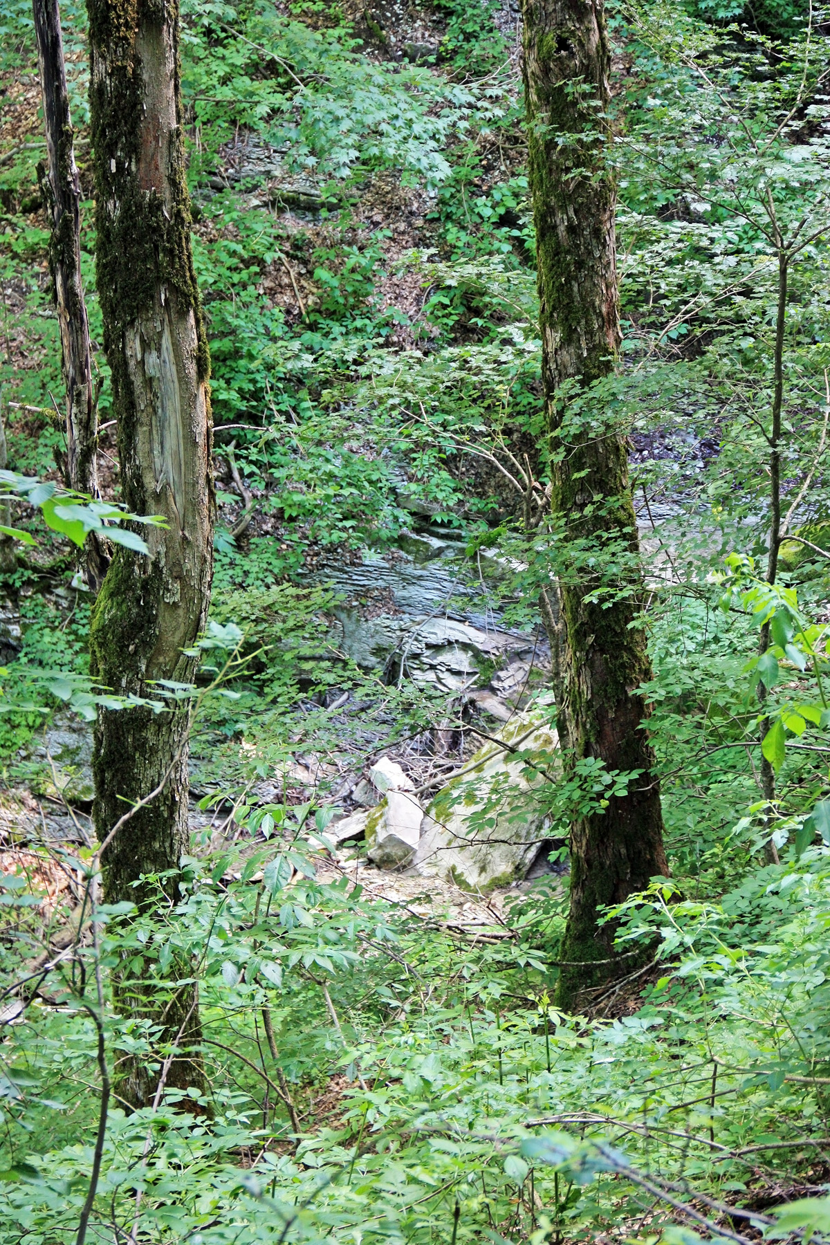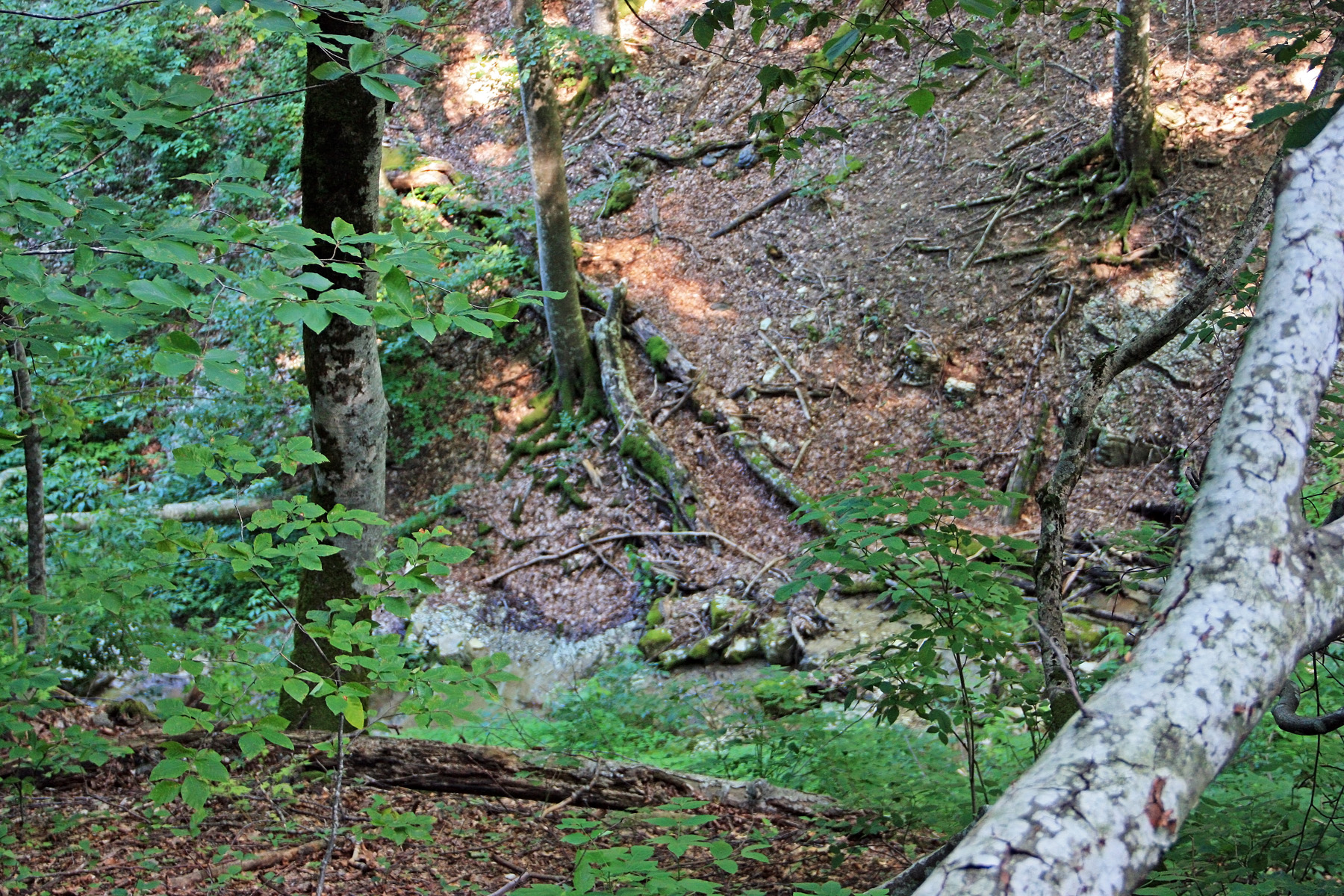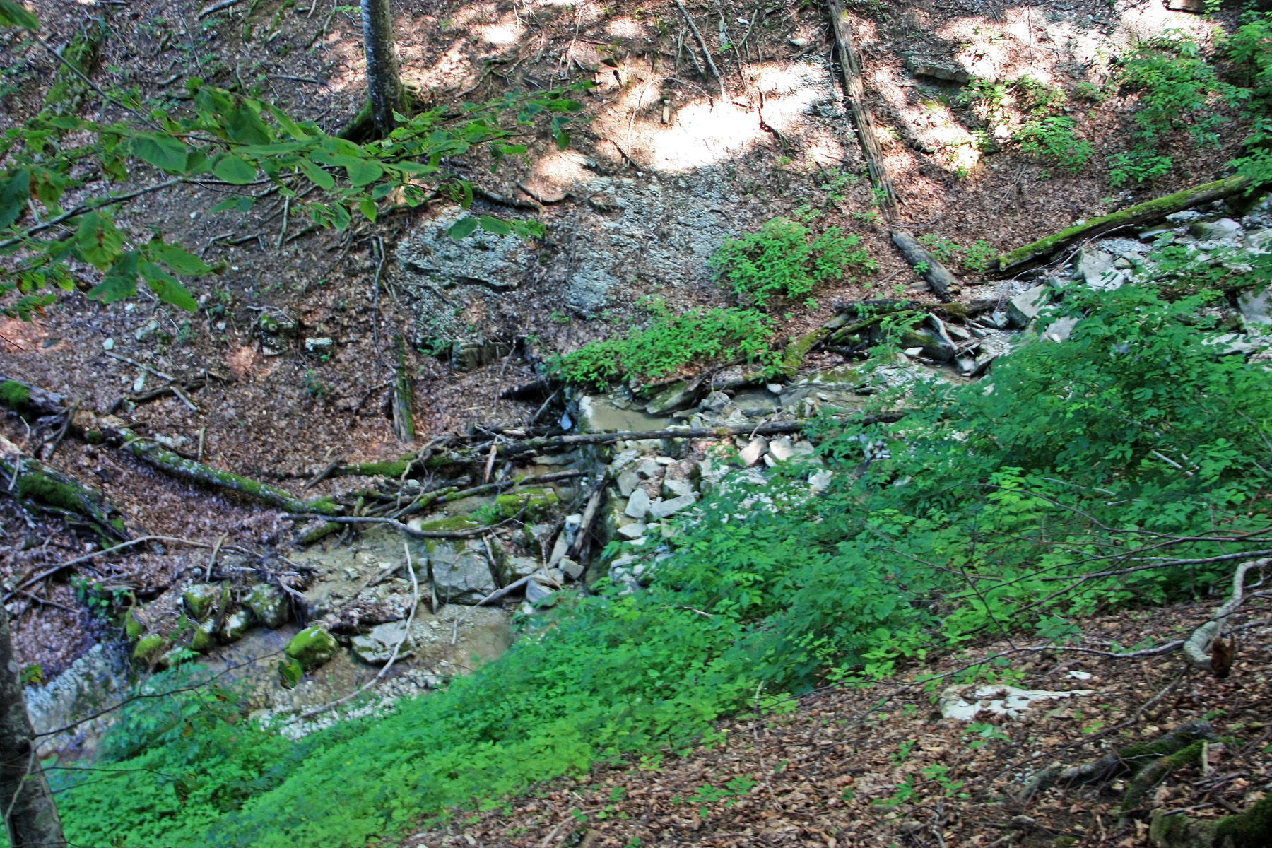 С этого склона начинает вырисовываться ступень, которую обхожу. Левее виден водопад (точнее, верхушка русла водопада) которым приток впадает в основное русло. По склону пришлось пройти дальше, чтоб найти приемлемый вариант спуска в основное русло. Спуск нахожу ниже двух упавших лесин бука метров на 40-50. Бучины большие, легли параллельно, верхушками упёрлись в противоположный склон, корневищами на этой, висят над руслом на высоте 5-7 метров.