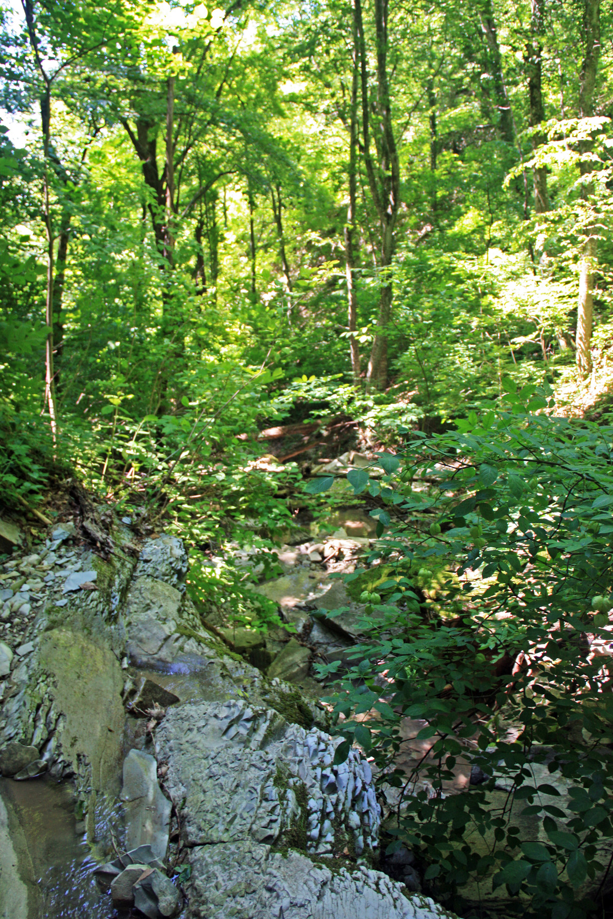 Вода в основном русле исчезает. Оно становится относительно сухим оврагом, заросшим кустарником. Дальше просматривается трансформация оврага в «амфитеатр» (в пределах 100 метров, плюс, минус ещё немного), т.е. здесь место образования русла. Может основное отвернуло отсюда туда, куда я не стал подниматься? Там, где потоки со стены? Но возвращаться, и искать место где можно обойти ту скальную стенку мне не хочется. И обхода этой, под которой остановился, так же, не вижу. Пора выходить «из ямы». Возможность выхода просматривается слева от линии моего пути (или правый борт ущелья). Умеренно крутой склон, с подлеском.