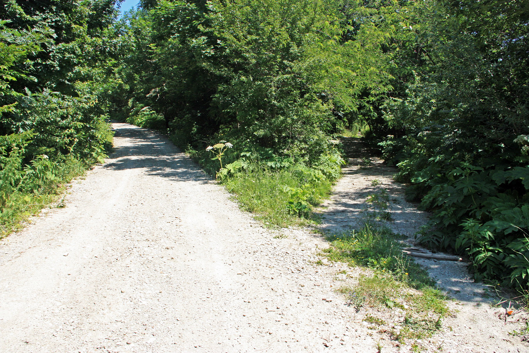 Обогнала одна машина, даже не притормозила. С верхней точки «траектории» дороги вижу радиомачты, что в районе отворота дороги к роднику и охотничьему домику. По той дороге можно быстро дойти до Возрождения. Через кафе «Афродита».