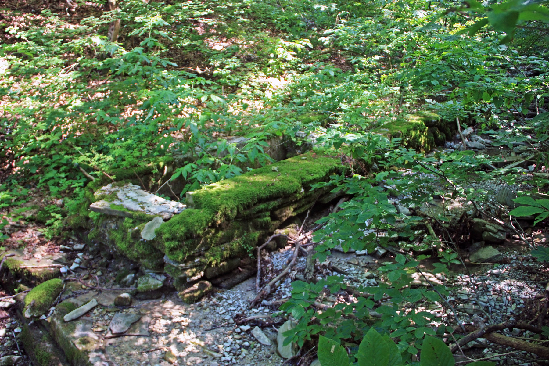 Чуть ниже обращаю внимание ещё на одно сооружение «рук человеческих». Не уверен, но похоже на поилку для скота. Сооружение старое, из «пластушки», на растворе. Тоже, обросло мхом. Уже разрушается. Внутри воды нет.