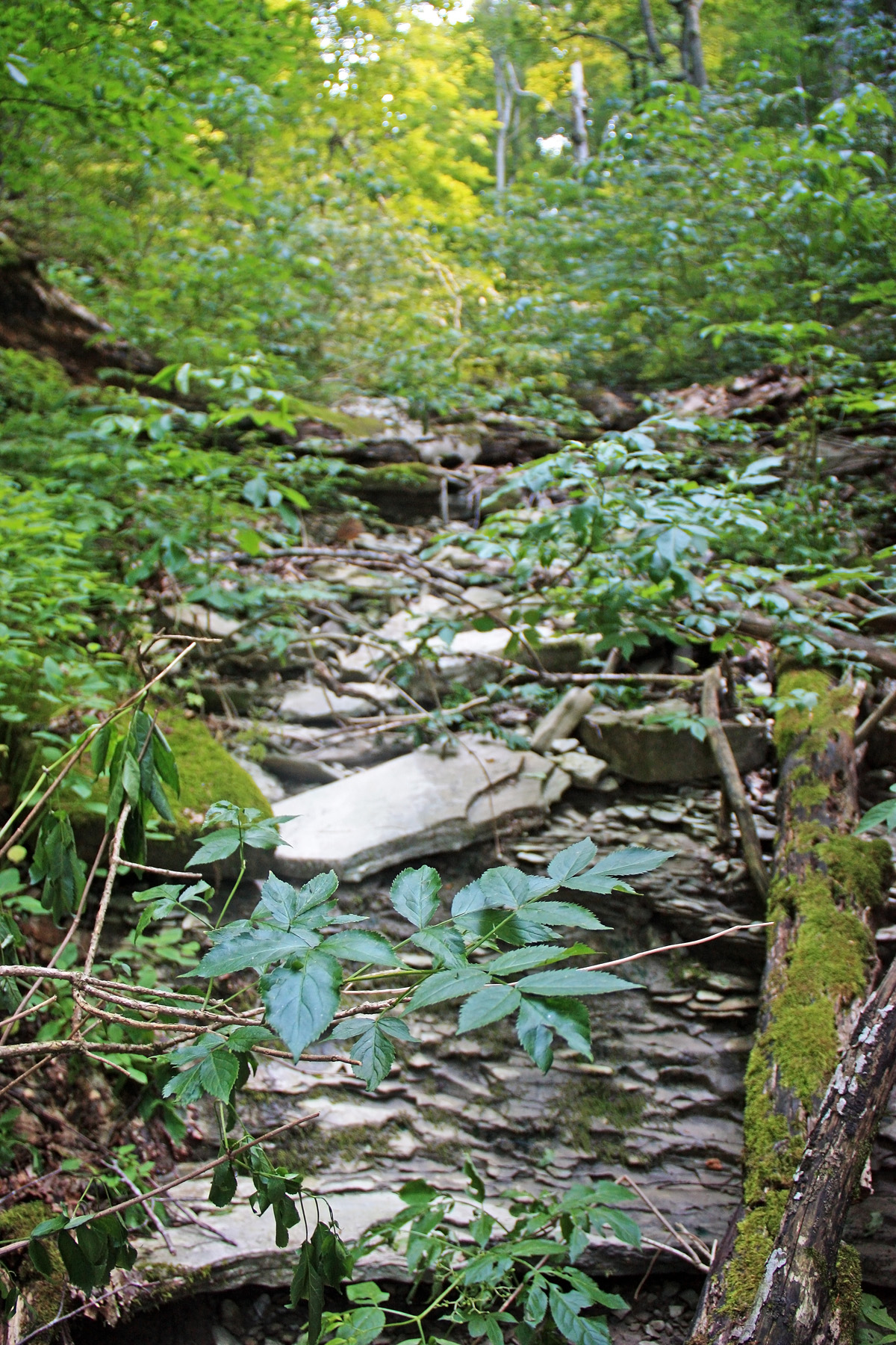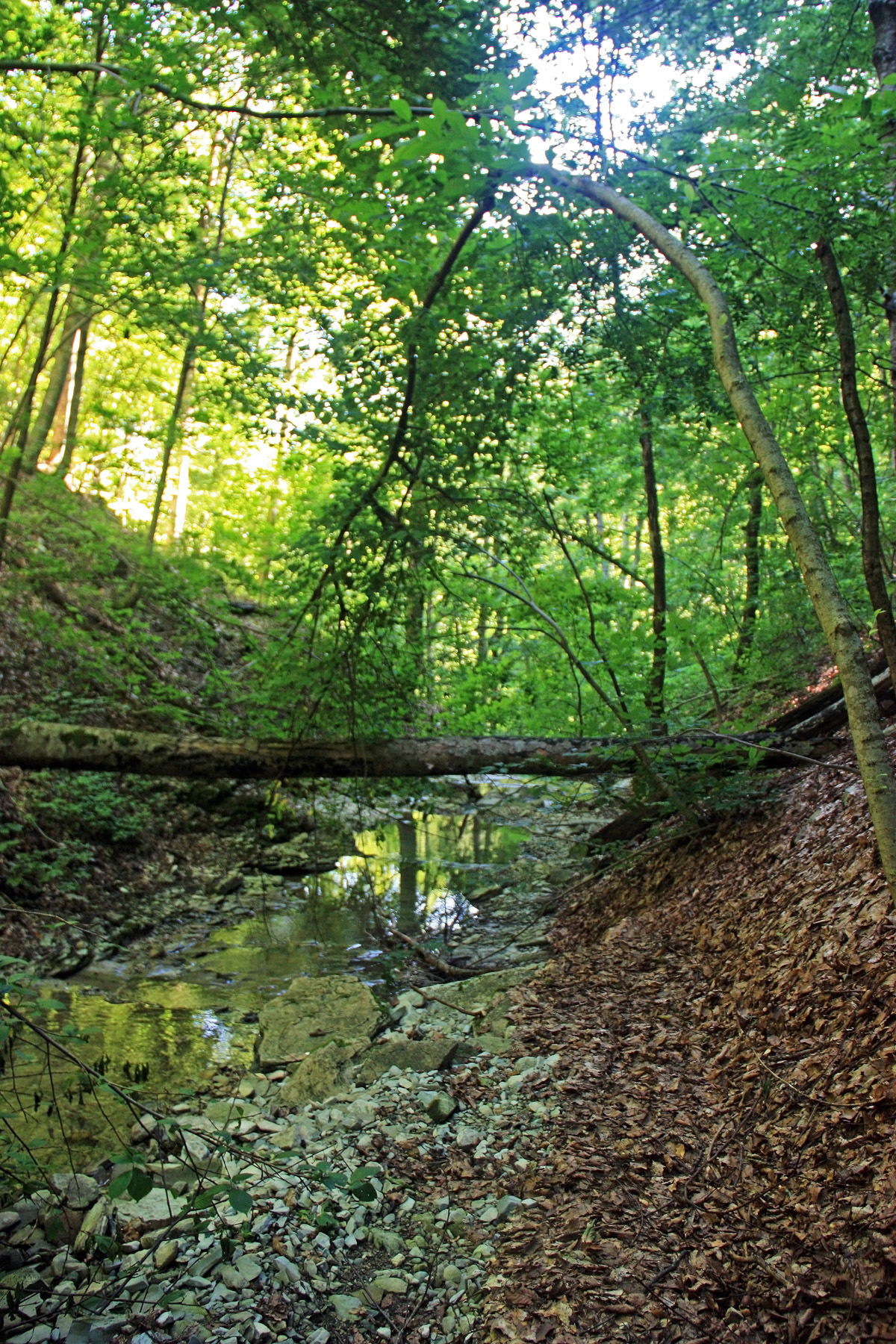 Спускаюсь к высокой ступени. Высота метров 10. Справа подходит русло притока. Большая часть вида закрыта листвой деревьев и подлеска. Трудно что-либо разглядеть внизу. Высматриваю, что ступень лучше обойти через русло этого притока. Чтоб попасть туда, надо перелезть упавшее дерево. Дерево лежит недалеко от края ступени. Вокруг есть камни, обломанные ветки. Корни выступают из земли. Справа склон моего русла, стыкуется со склоном впадающего русла. И там угадывается приемлемый проход вниз.