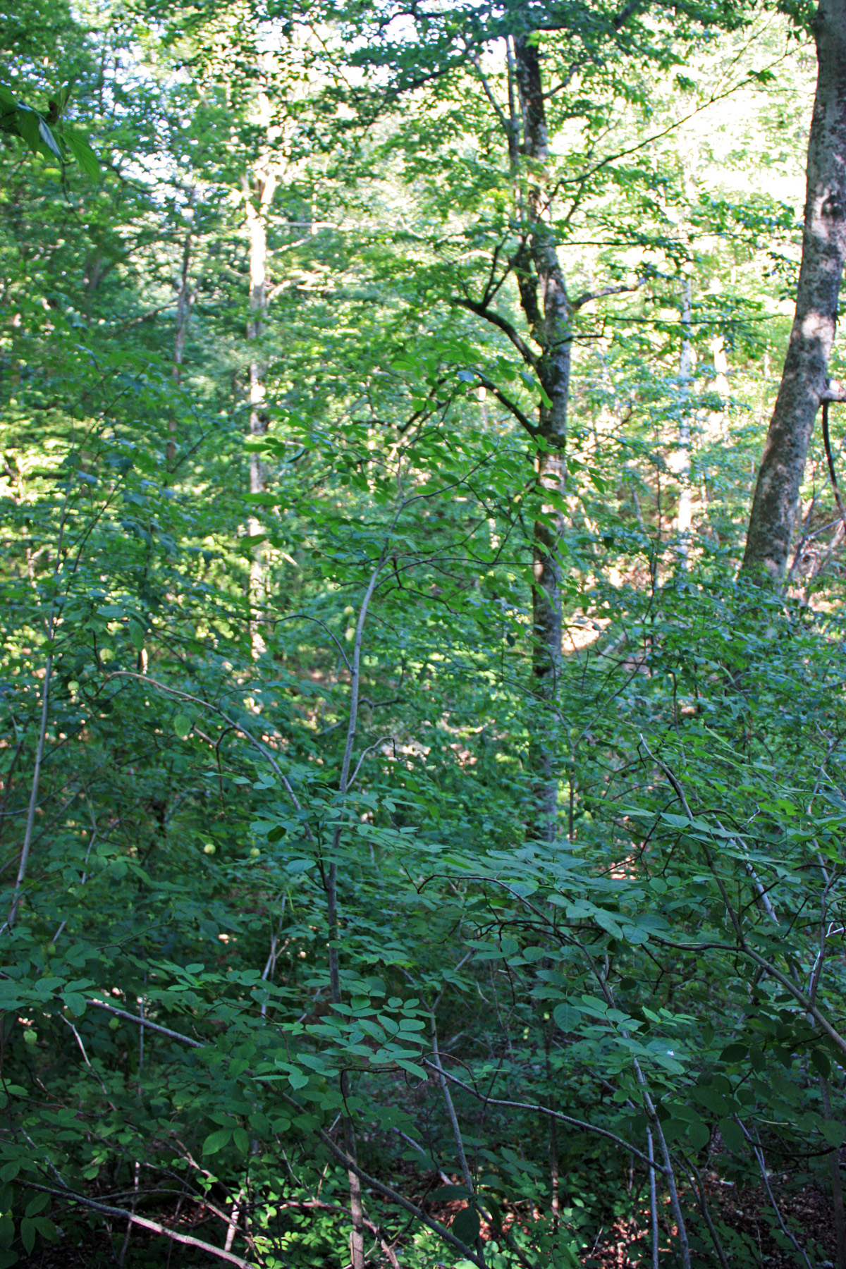 Далее неспешный подъём по лесистому склону. Здесь свои «прелести»: колючие кусты, подлесок, низкие ветви, колючие «лианы». Всё старается зацепить тебя, поцарапать, уколоть, что-нибудь порвать. Уклоняюсь рюкзаком и телом от низких ветвей, лиан, колючек, зарослей подлеска. Поднимаю, раздвигаю те же ветви, лианы, подлесок.