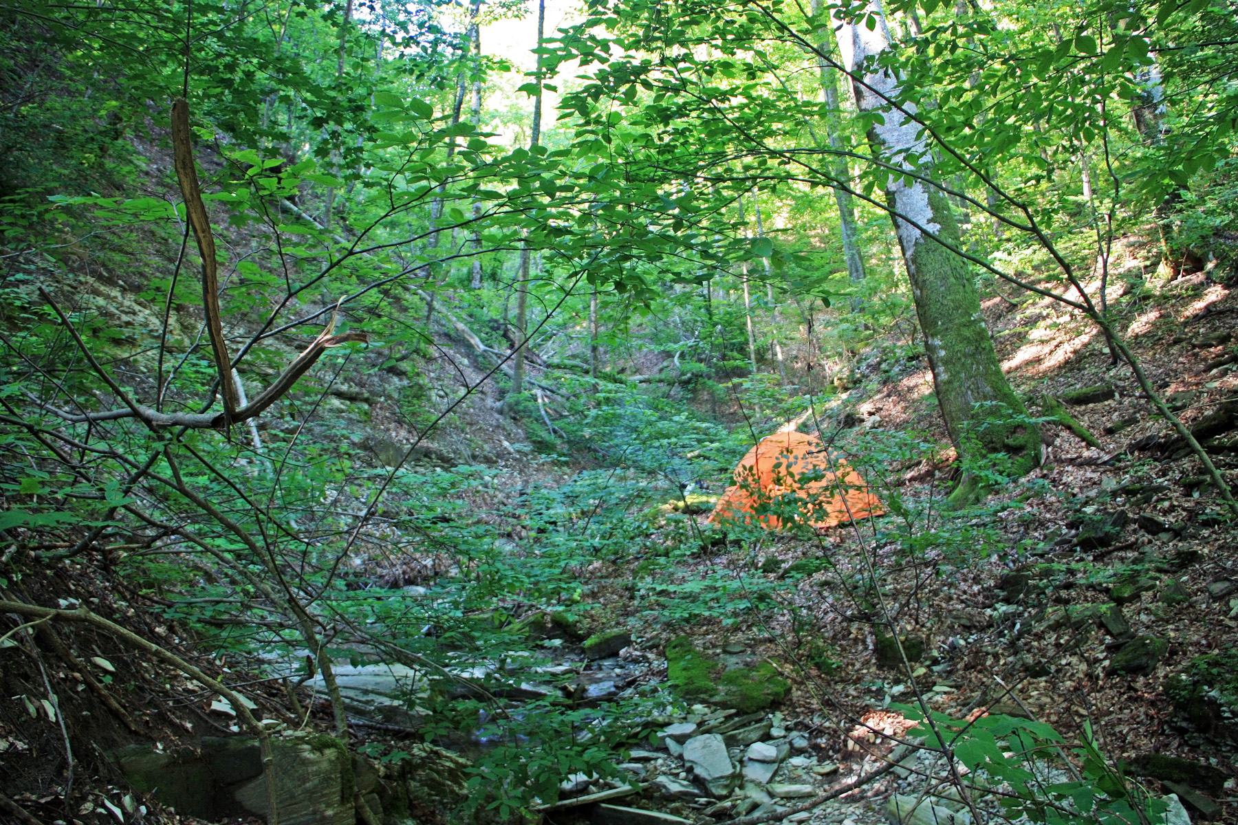 На слиянии, под правым берегом наносная терраса из щебёнки и покрыта слоем прошлогодних листьев. Шириной чуть больше метра. Можно притулить палатку. Бросаю здесь рюкзак. Но иду ниже по руслу, может, будет что получше. Преодолеваю ближний завал. За ним открывается небольшая терраса левого берега. Но она больше, чем та, у которой оставил рюкзак. Под деревом можно поставить палатку. Не ровно, но ночь перетерплю. Есть дрова. В русле цепочка ванночек. Возвращаюсь и перетаскиваю рюкзак сюда.