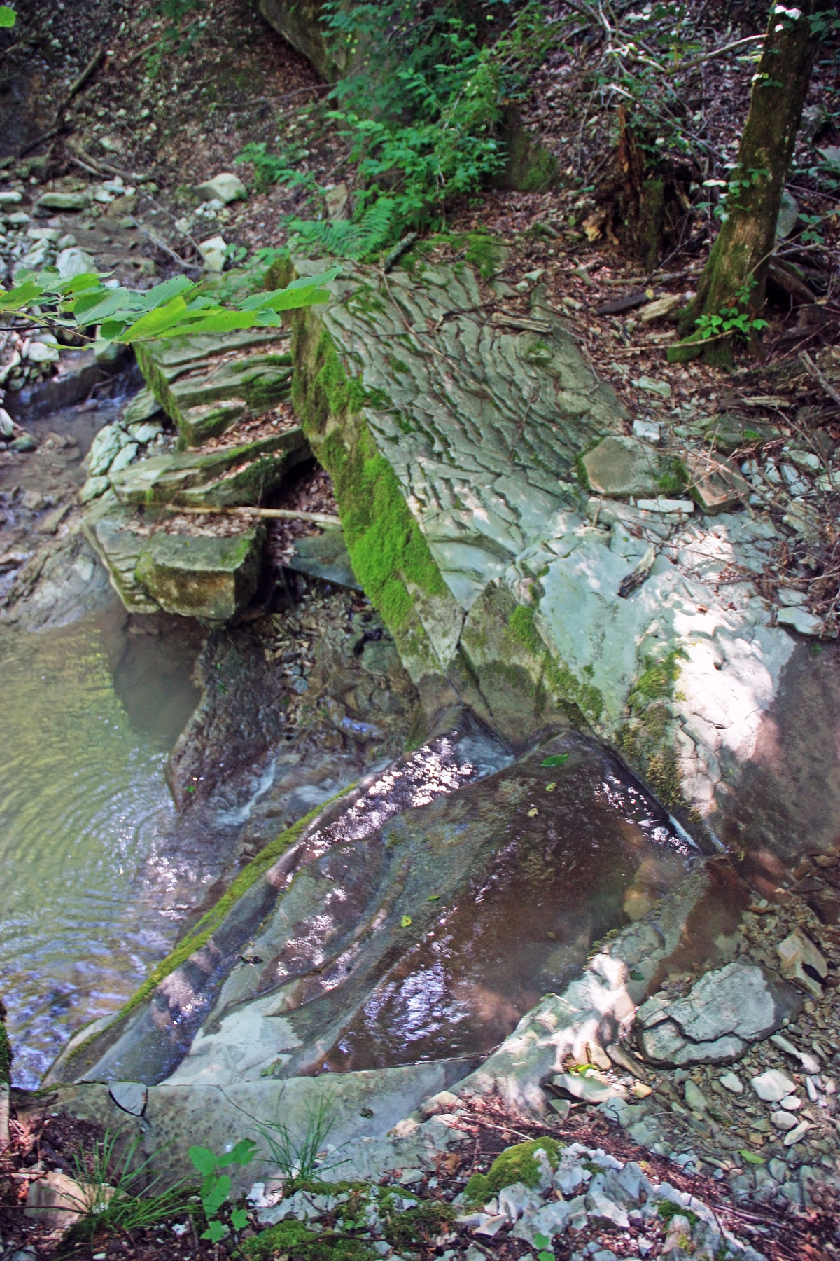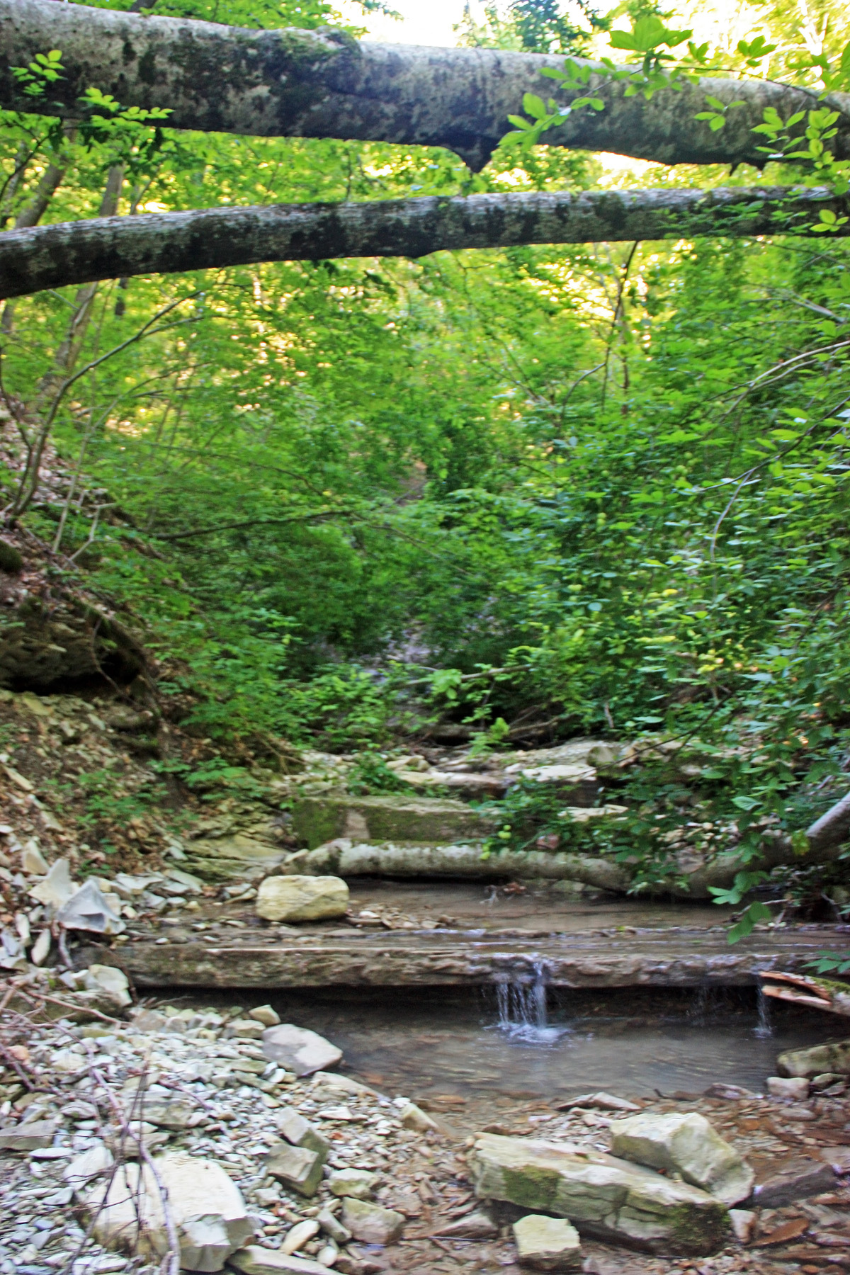 Опять прохожу под бучинами. Ниже них сразу выхожу на каскад ступеней. 4 штуки, метр-два высотой. С обломками толстого бука на нижней ступени. А вот ниже этого каскада, участок русла завален наносами мелких камней, щебня, веток, сучьев. Воды становится заметно больше.