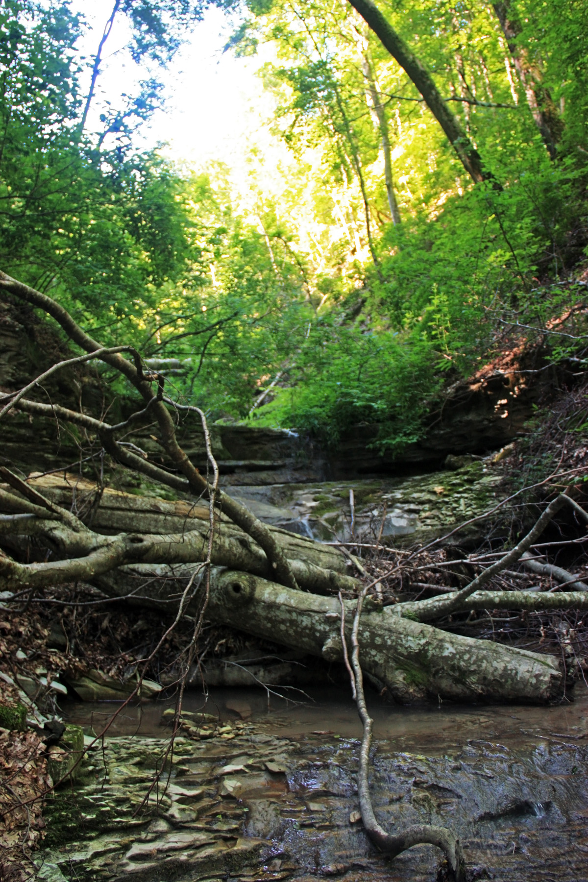 За цепочкой ванн поперёк русла лежит недавно упавшее дерево. Место излома ещё не потемнело. Чуть ниже ещё пара лесин, лежащих в русле "крестом" над метровой скальной ступенью.