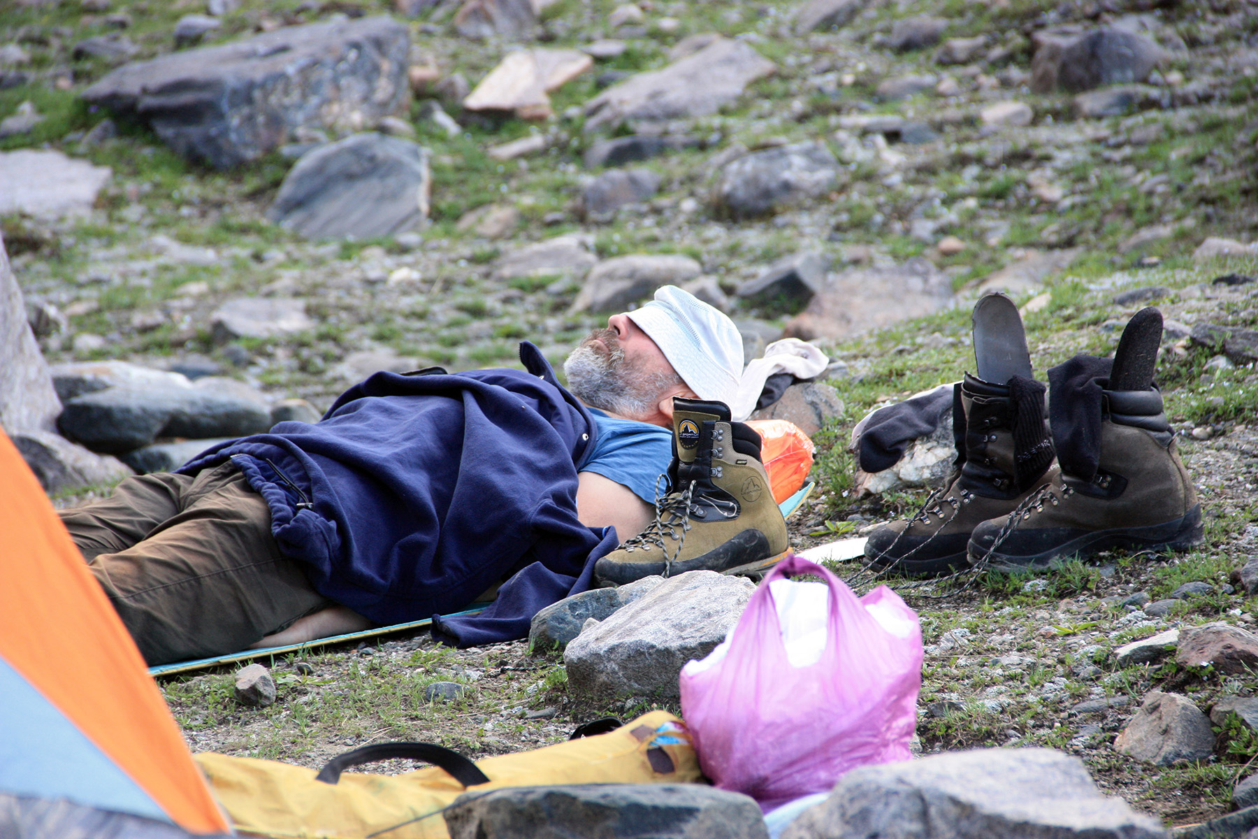 Дождь то усиливается, то ослабевает. Дрыхли до обеда. Пока не разболелись бока. По звуку слышим, что кто-то ходит снаружи. Реагируем остро, вчера, чуть ниже, паслось стадо коров. А эти «ребята» всегда готовы нагадить на стоянке, и пережевать что-нибудь. Но нет, то соседи разминаются. Время к обеду. Потихоньку выползаем и мы. Все «кучкуются» под тентом. Кто-то сходил за водой. Начинаем готовить обед.