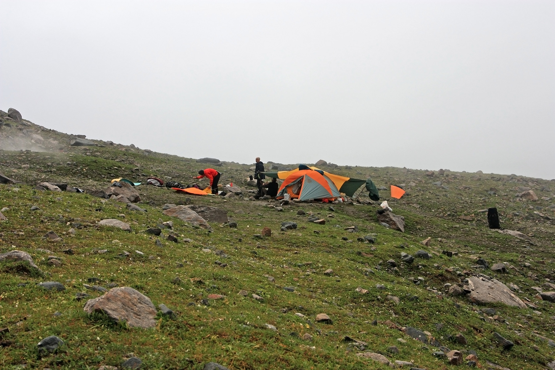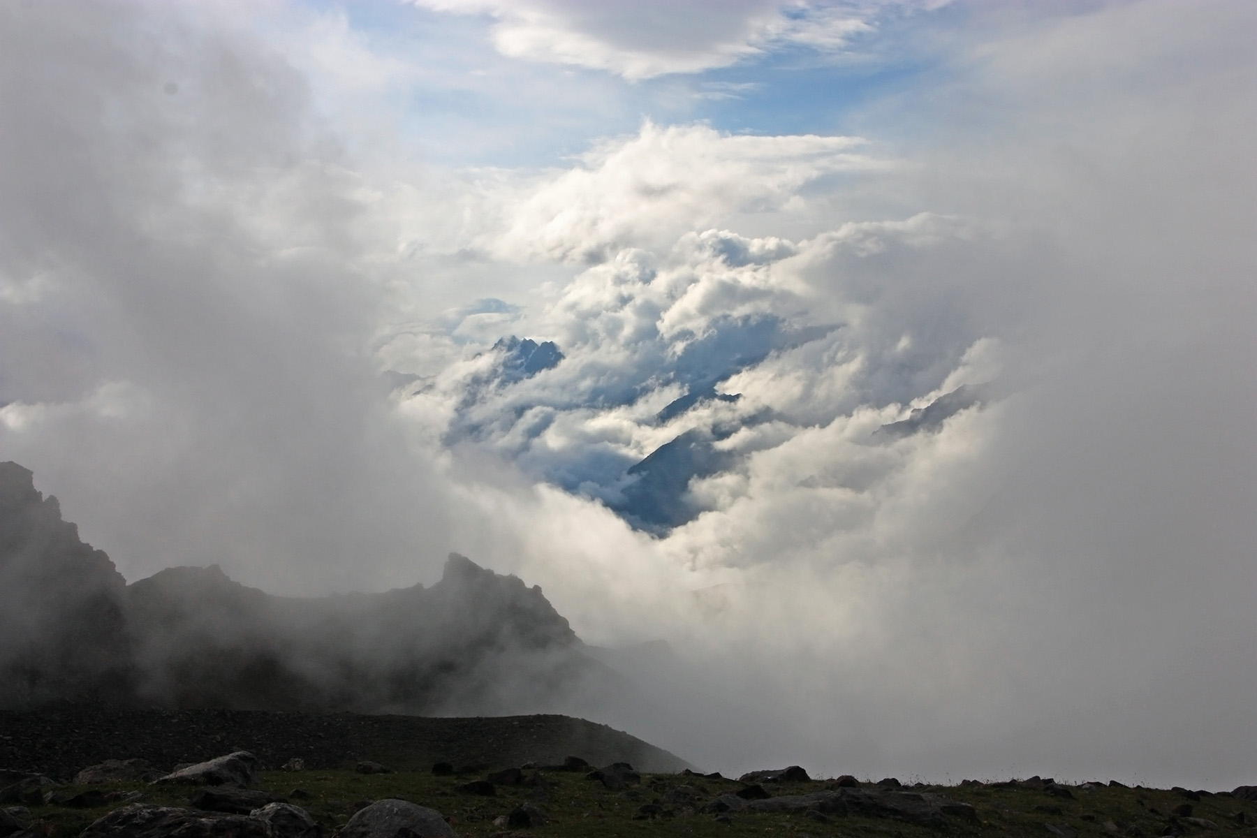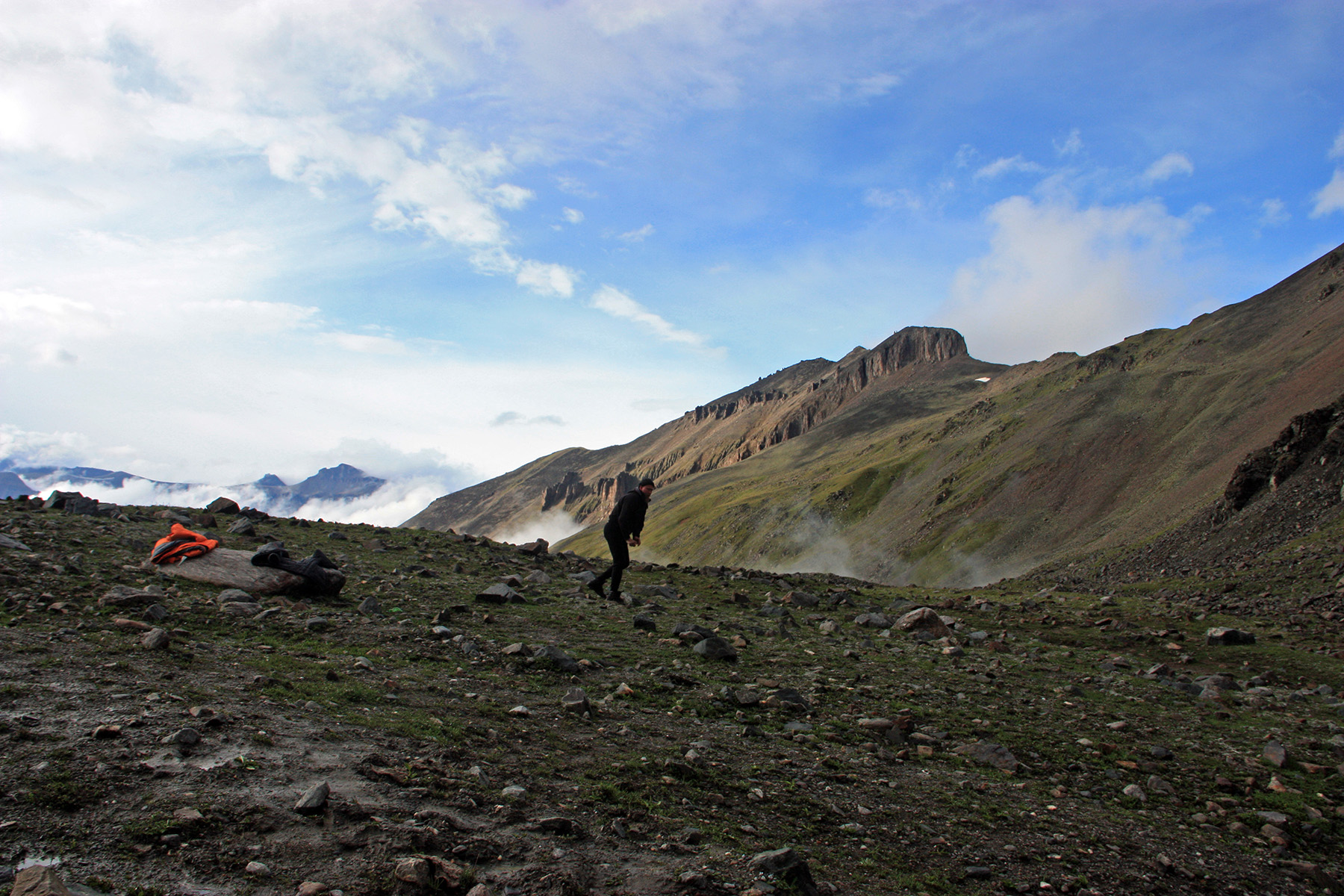К пяти часам дождь прекратился. Выползаем, а над головой «голубое окно». Соседние склоны даже солнце освещает! Как раз, хорошо видна седловина перевала Чарак Северный. Наш перевал пока не виден, он «за углом». И над ледником клубится туман. Или облако. Вытаскиваем мокрые вещи на просушку. Не знаю, успеет ли просохнуть. У меня под ковриком обнаружилась целая лужа. Даже с коврика стекает вода. И он что-то впитал в себя. Ставлю на солнце, а он парит. Спальник отсырел, раскладываю на большом камне. Каждый ищет себе большой камень. Он высыхает быстро, и на нём можно разложить много вещей. Но больших камней у палаток мало, и приходится удаляться метров на 100. Поднимается порывистый ветерок. Все начинают бегать за сдуваемыми вещами. У меня чуть не унесло коврик. Приходится всё «стопорить» камнями.
