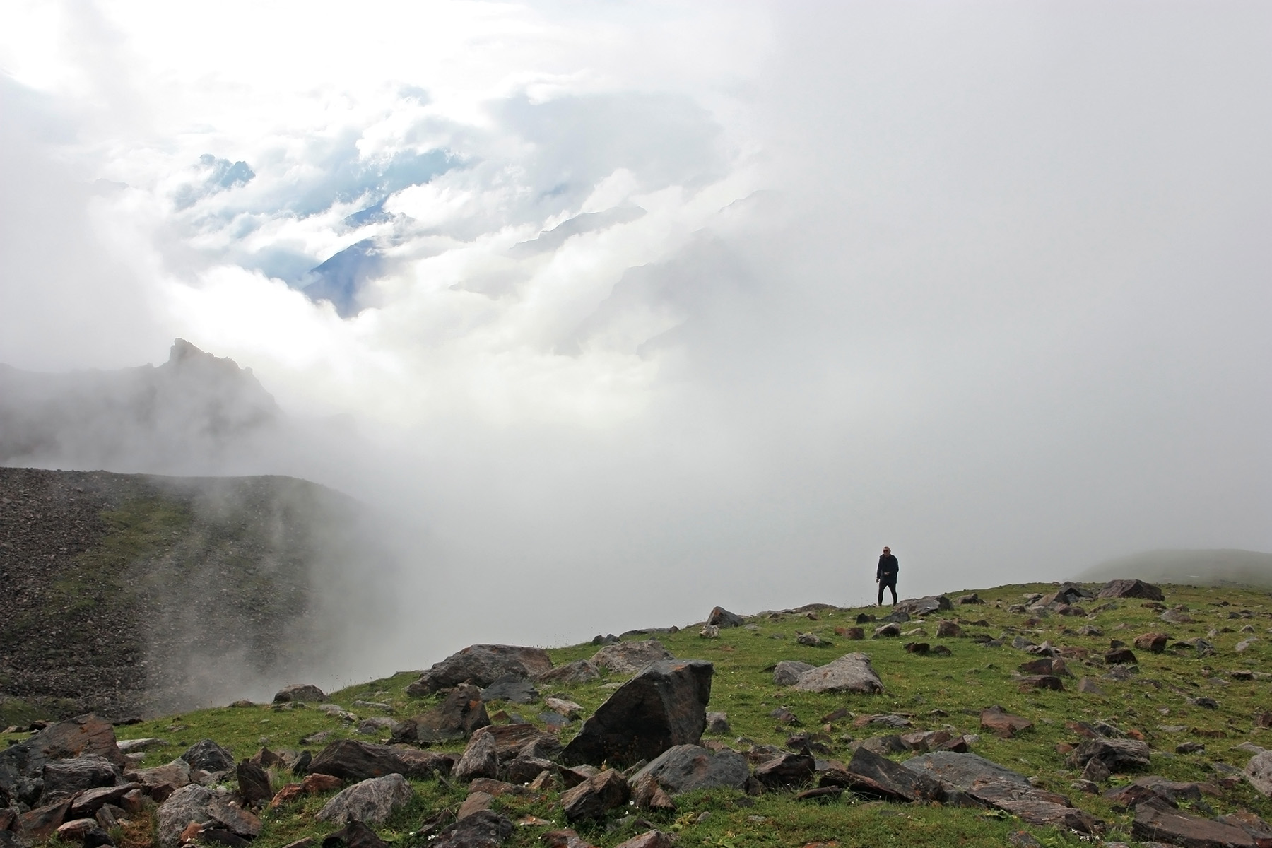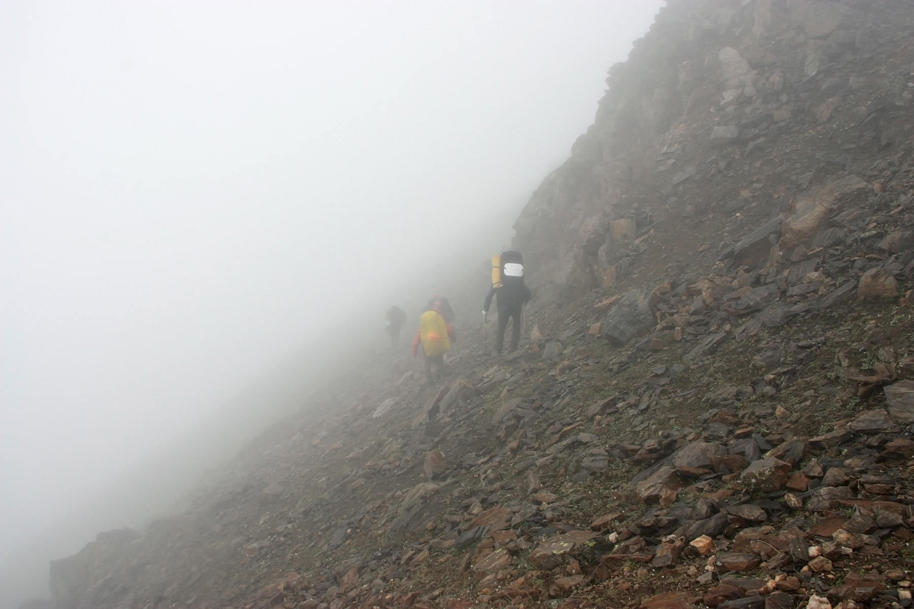 На другую сторону уходит крутой склон. В туман. Туман плотный. Дна ущелья не видно. Сидим, ждём, может, растянет. Сашка говорит, что перевал хоть и 1-А, но путь спуска надо знать, т.е. спускаться надо «правильно». Иначе попадаешь на крутяки.