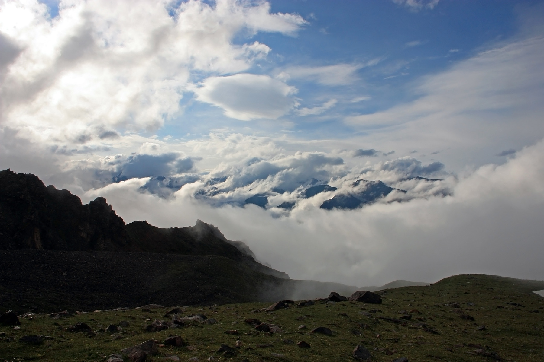 Поднимаюсь на зелёный бугор над стоянкой. Фотографирую окрестные пейзажи. С верхней точки много чего видно. Толик ушёл к подножью ступени бараньих лбов, Сашка ходит ниже по склону, вроде, чего-то ищет. Остальные внизу, у лагеря, раскладывают вещи для просушки. Снизу накатывает волна тумана. Внизу все долины забиты облаками. Только вершины торчат из белого «океана». Повыбирал интересные пейзажи.