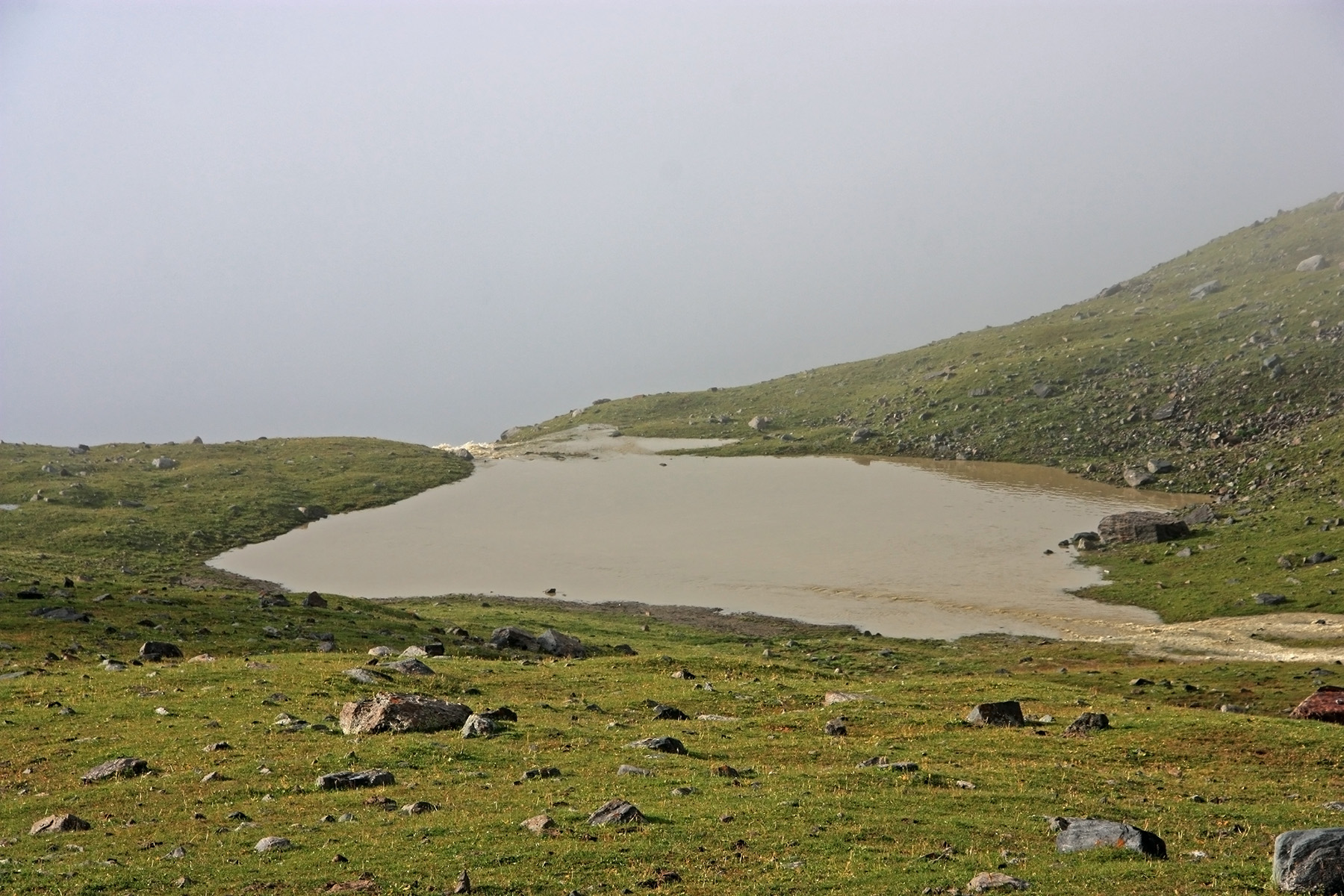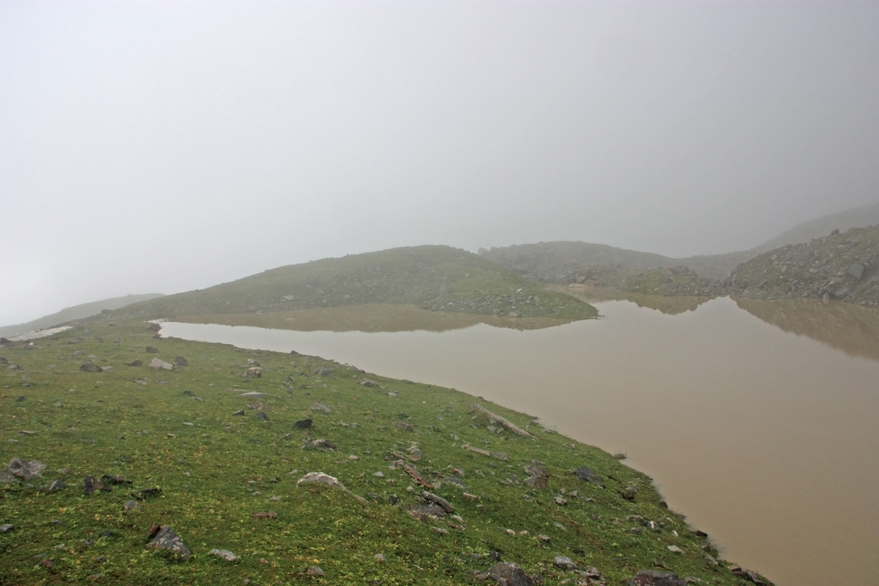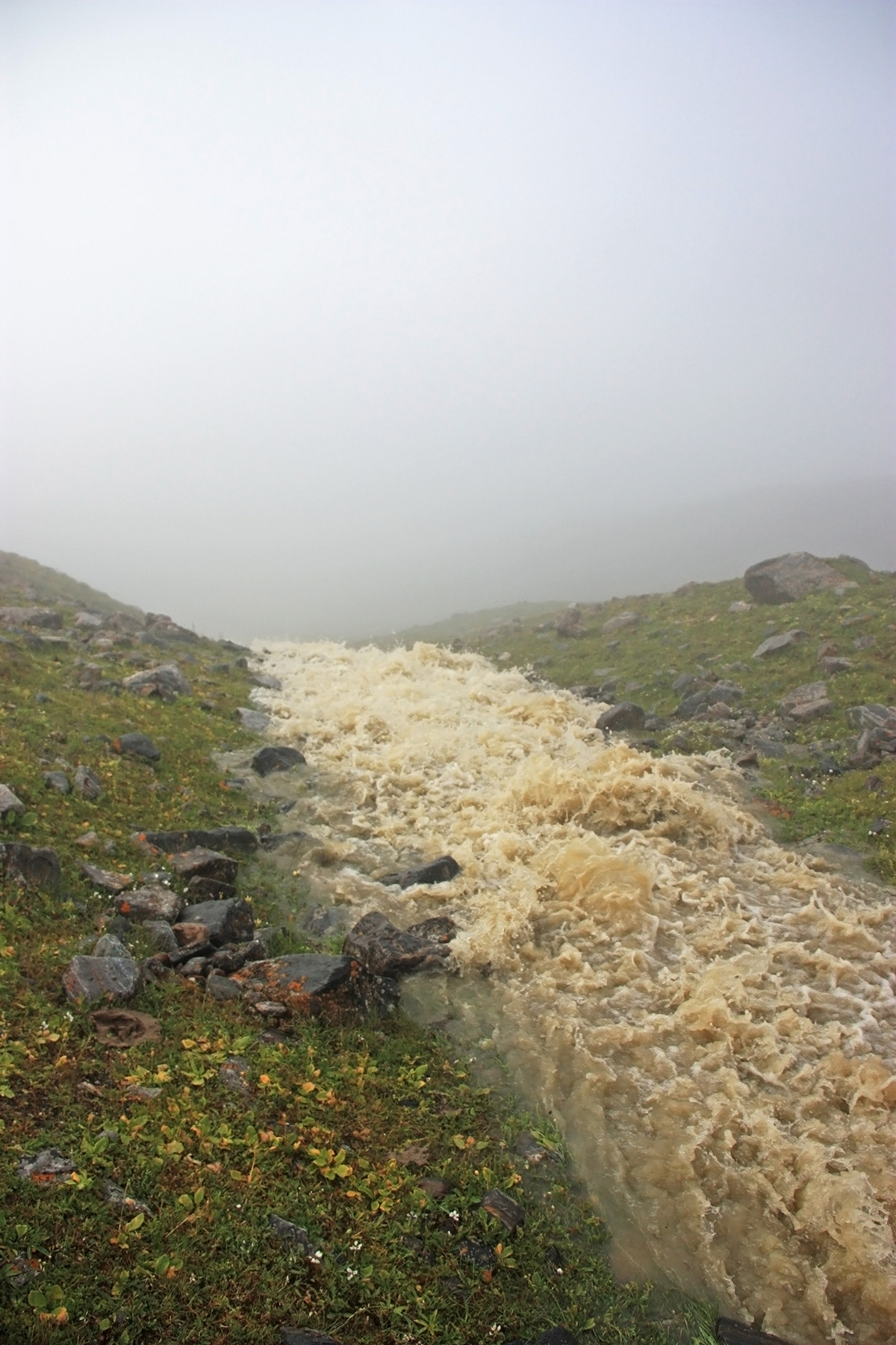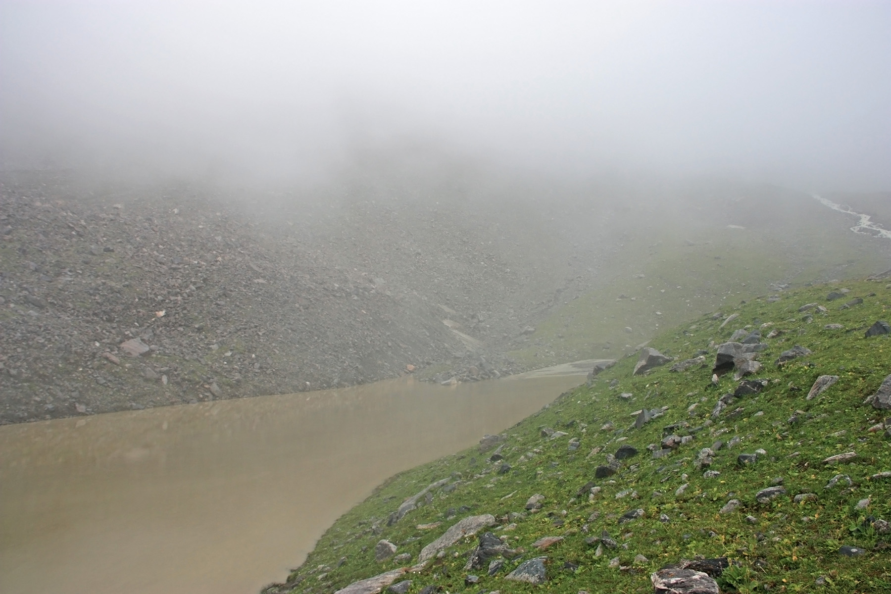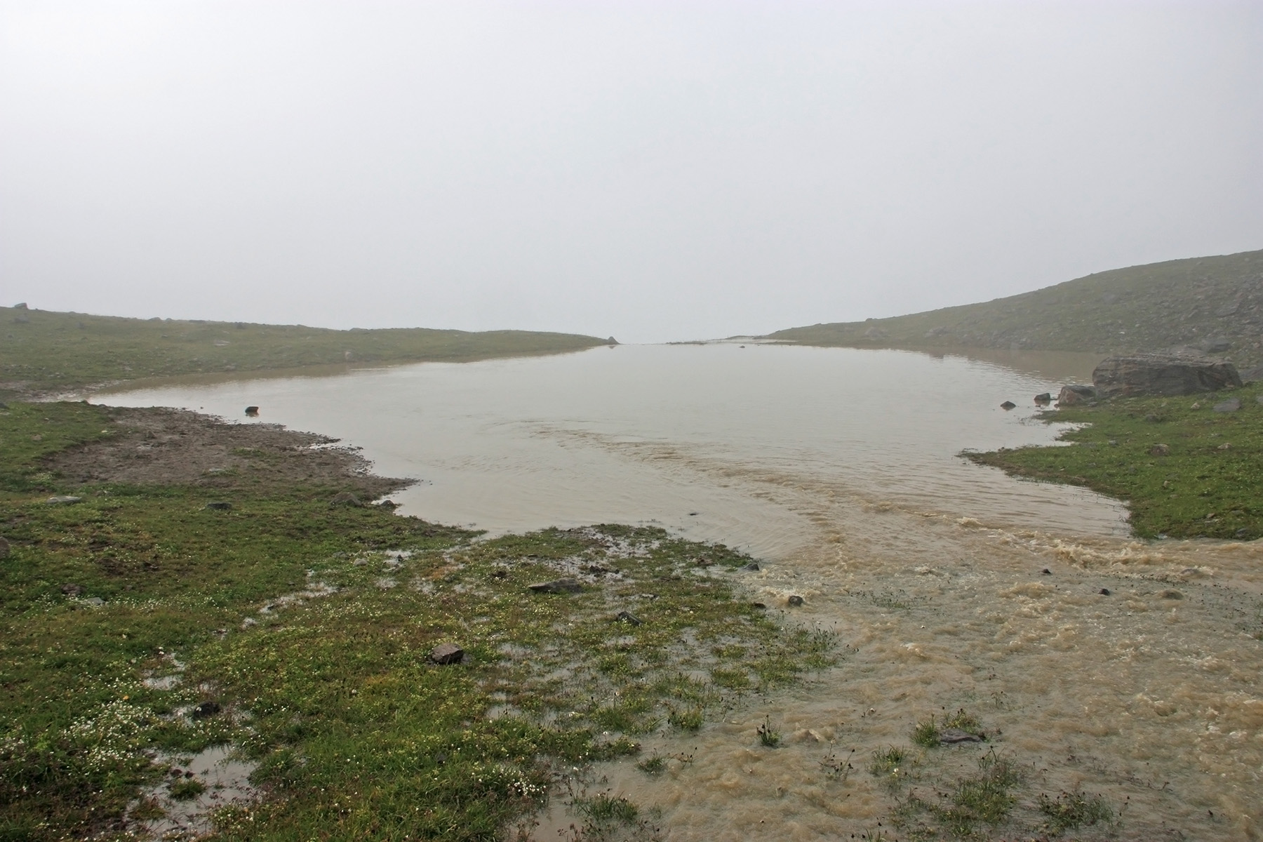 А вода-то сильно мутная. Хожу, снимаю. Похоже, что сейчас произошёл перелив озера через край котловины. Вода пошла по зелёной траве. То ли лето жаркое, и сильно тает ледник, то ли обильные дожди переполнили чашу этого озера. В целом, впечатление, что озеро возникло совсем недавно. Нет характерно подмытого берега. Берег, покрытый травой, уходит в воду.
