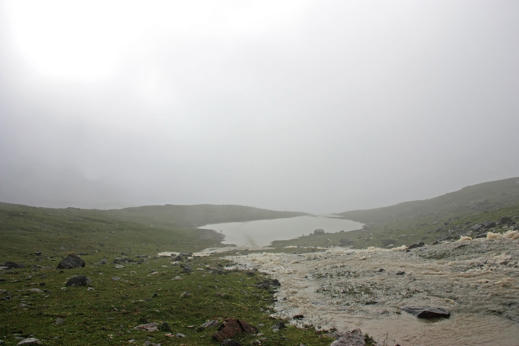 Далее пошёл к озёрам. Мой подход к ним совпал с приходом очередной волны тумана. Ну что ж, будем снимать «туманные берега» горного озера. Начал с места вытекания ручья из верхнего озера в нижнее. Вчера мы это место видели снизу.