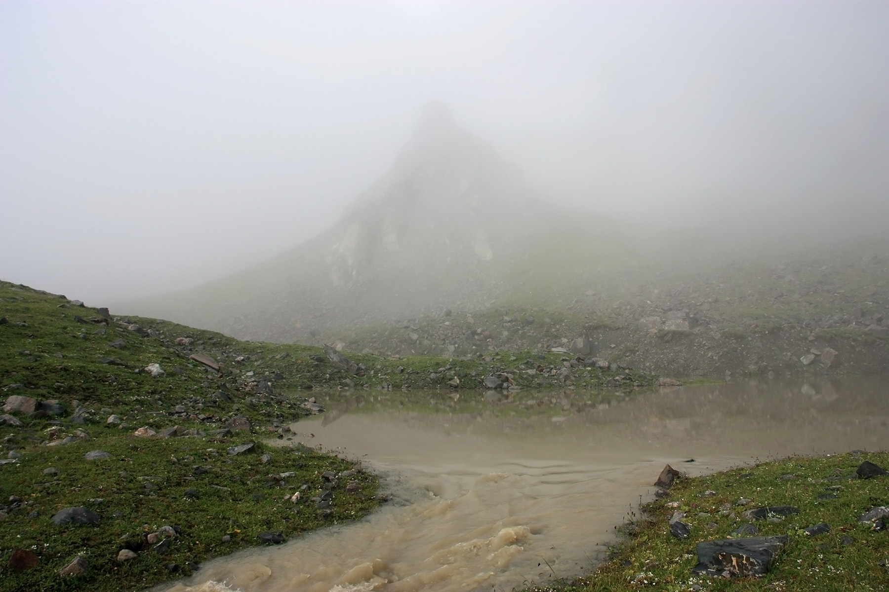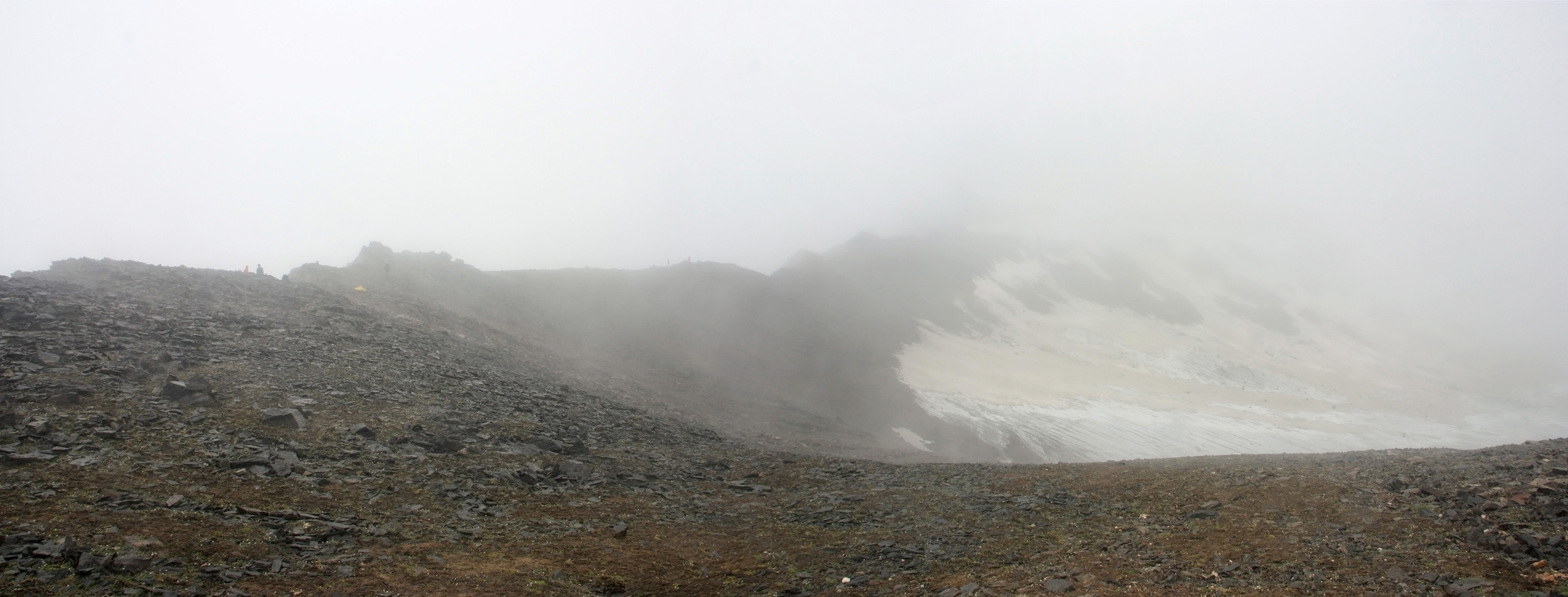 28 июля. А с утра стоит плотный туман. А у нас времени пережидать его уже нет. Собираемся. Надеемся, что пока выйдем на седловину (часам к 11), потеплеет, и туман растает.