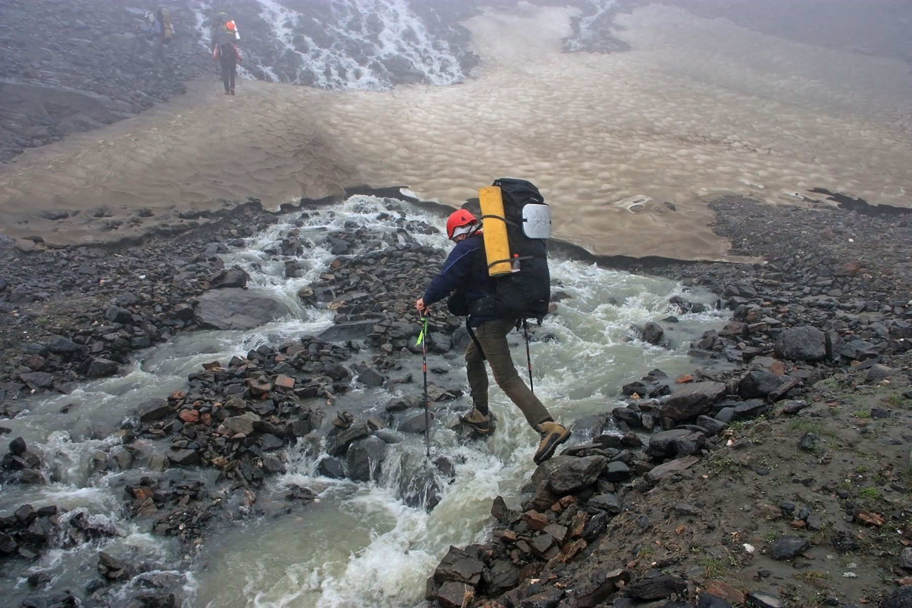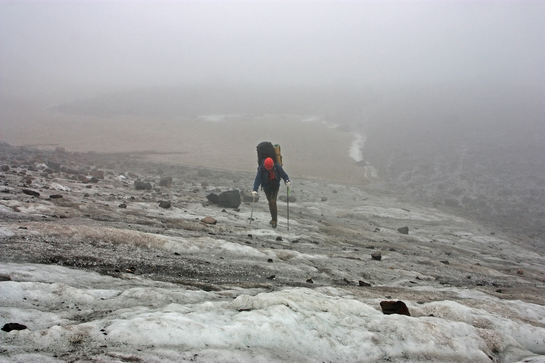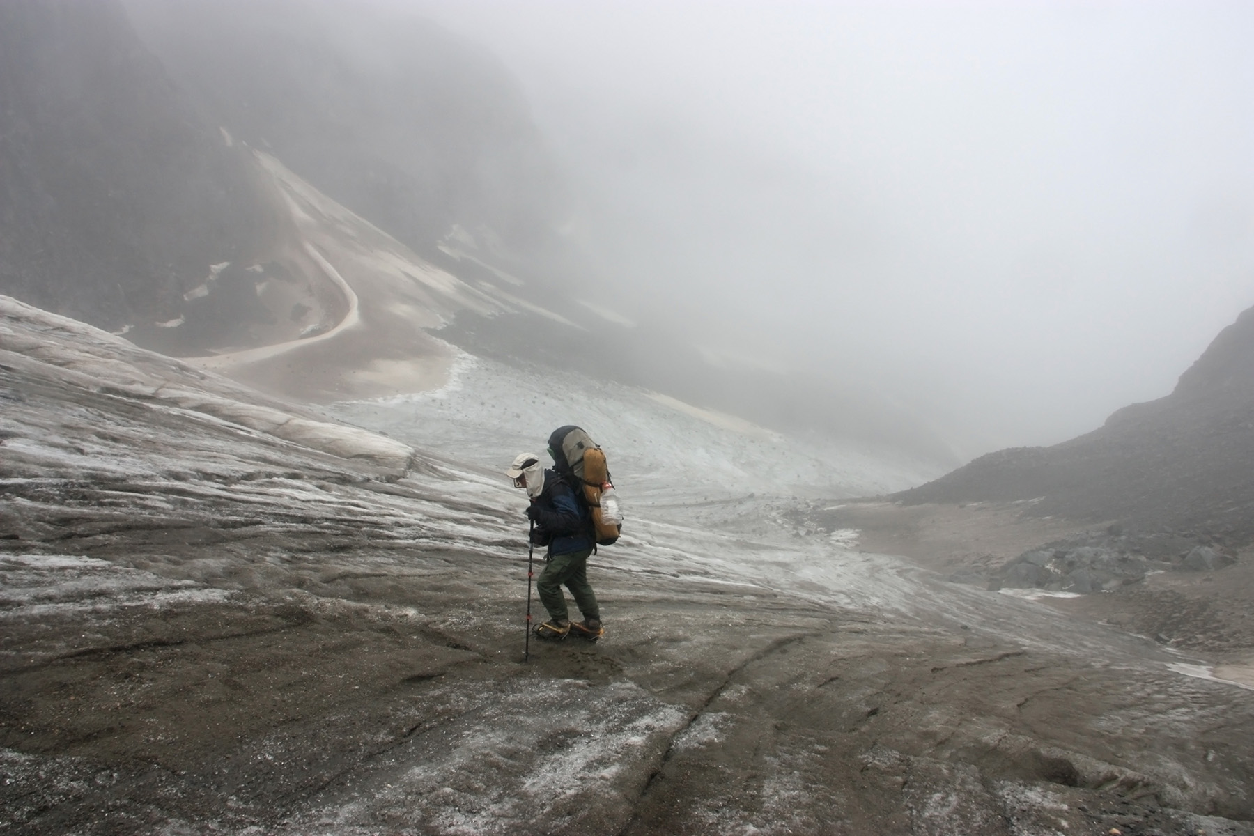 Выходим на горизонтальную террасу. Бывшее ложе ледника. Туман немного приподнялся. По другому пласту снега всё же, переходим ручей. Идём к языку ледника. Зайдя на него, садимся одевать кошки. Время 9-04. А перевала пока не видно. Понижение к перевалу, да, видим. А седловина закрывается перегибом ледника.