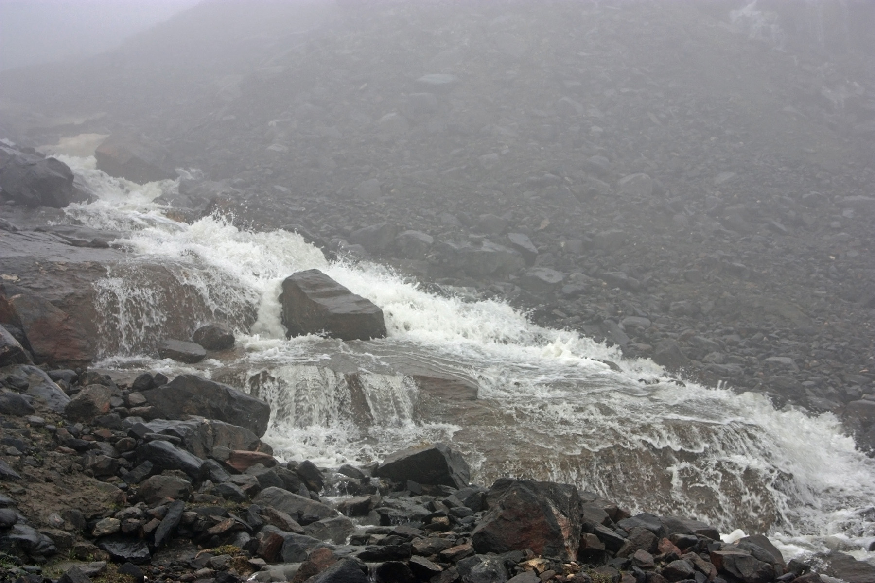 Через 10 минут выходим под водопад с гряды бараньих лбов. Проявился он в тумане метров с 50-70. Переходим поток с водопада, и слева от него начинаем подниматься на эту ступень.