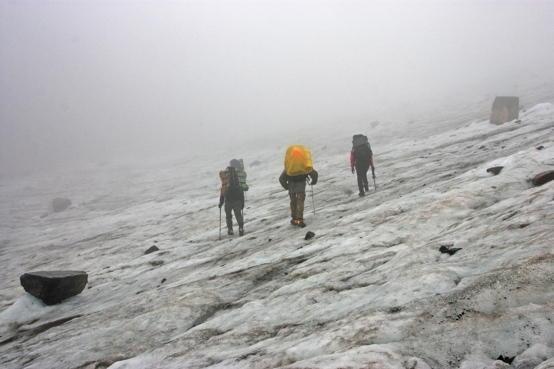 15 минут тратим на одевание кошек. Мы с Пашей вновь выходим последними. Опять вокруг плотный туман. Постепенно Паша уходит вперёд, а я догоняю Сашку. Что-то ему идётся тяжело. Преодолеваем перегиб ледника. Выше открывается выполаживание ледника, и туман немного приподнялся. Впереди проступают контуры гребня. Возможно, видим седловину перевала.