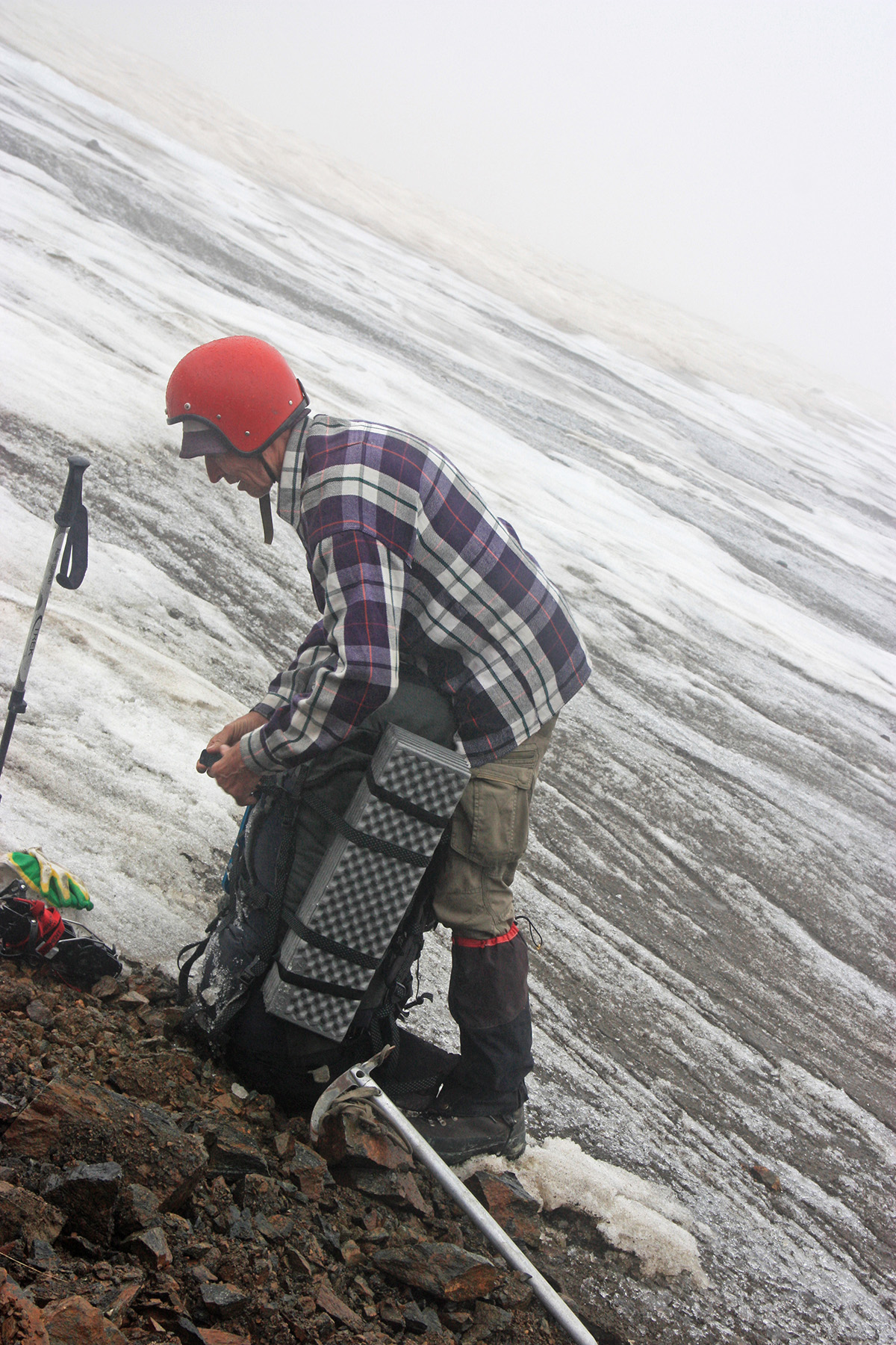 Проходим выполаживание ледника, проходим участок, который «заходит» на склон, ведущий к седловине. При выходе на склон, останавливаемся снять кошки. Время 10-30. А Сашка сильно отстал…