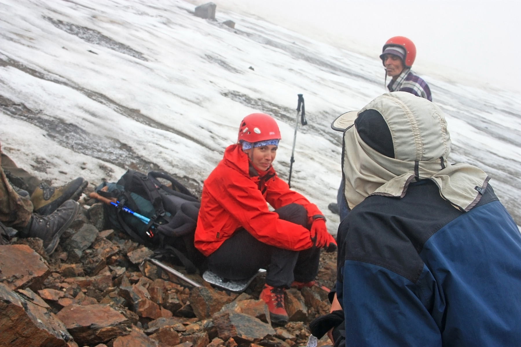 Минут через 15 немного туман растягивает. Появляется горизонтальная видимость, метров на 300. Немного просматривается верхняя часть ледника, по которому поднимались на перевал. Но в ущелье, куда нам надо, так и «клубится» «молоко». Через 10 минут вновь сидим в плотном «молоке». Делаем групповое фото на перевале.