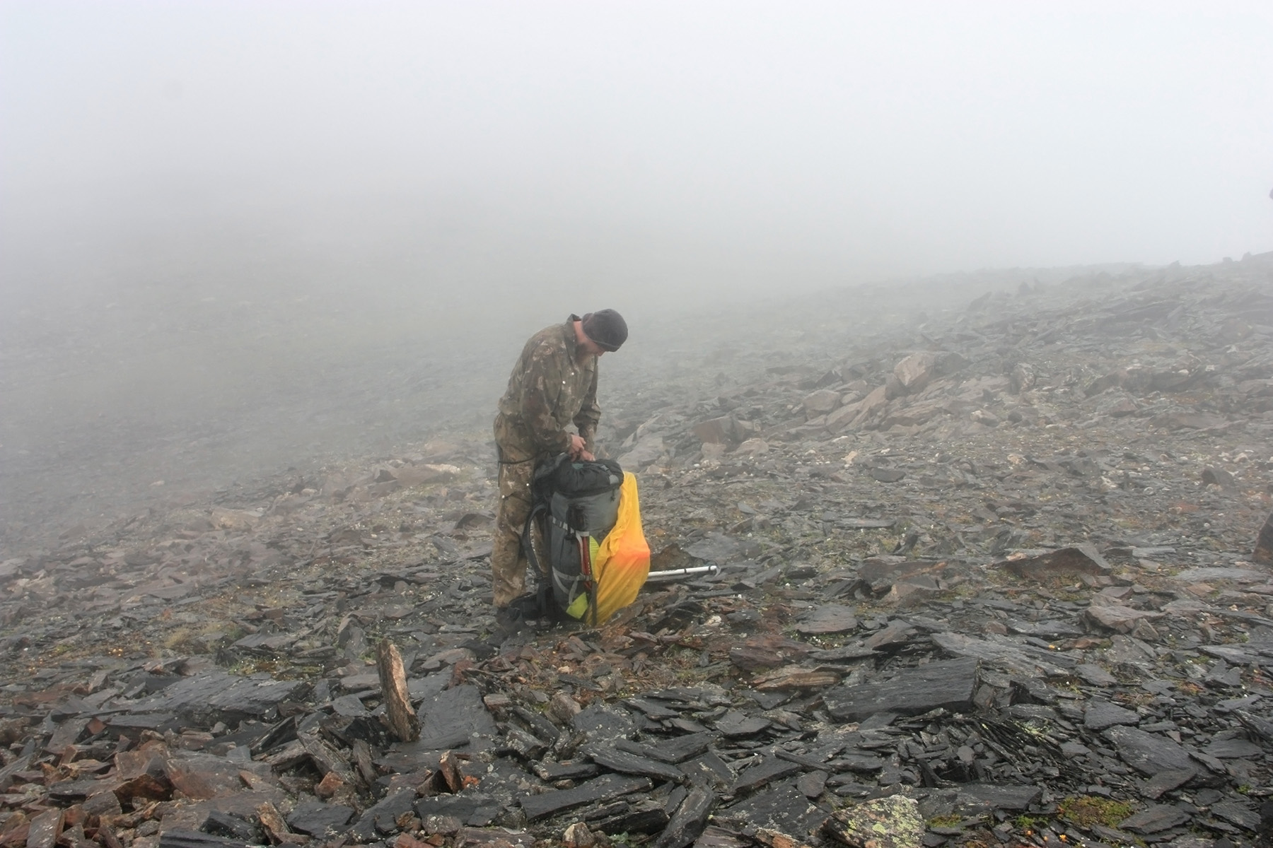 За перегибом, пройдя ещё немного, вижу, что Сашка садится на привал. Подхожу, и сам усаживаюсь рядом. Время 8-47. 25 минут шли. Холодно, туман, морось. Фотоаппарат держу за пазухой, в полиэтиленовом пакете. Каждый раз для снимка, приходится доставать, снимать пакет, делать фото, и в обратном порядке…