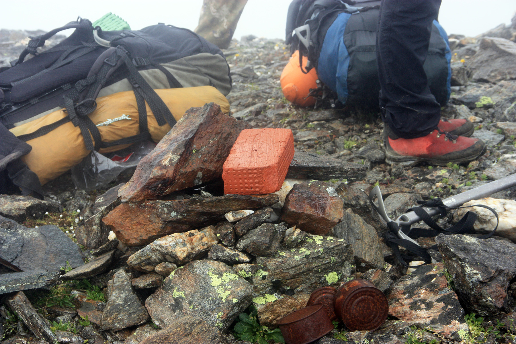 Тур «маркирован» красным кирпичом. Впечатляет! И как-то становится жалко того, кто его нёс на перевал.