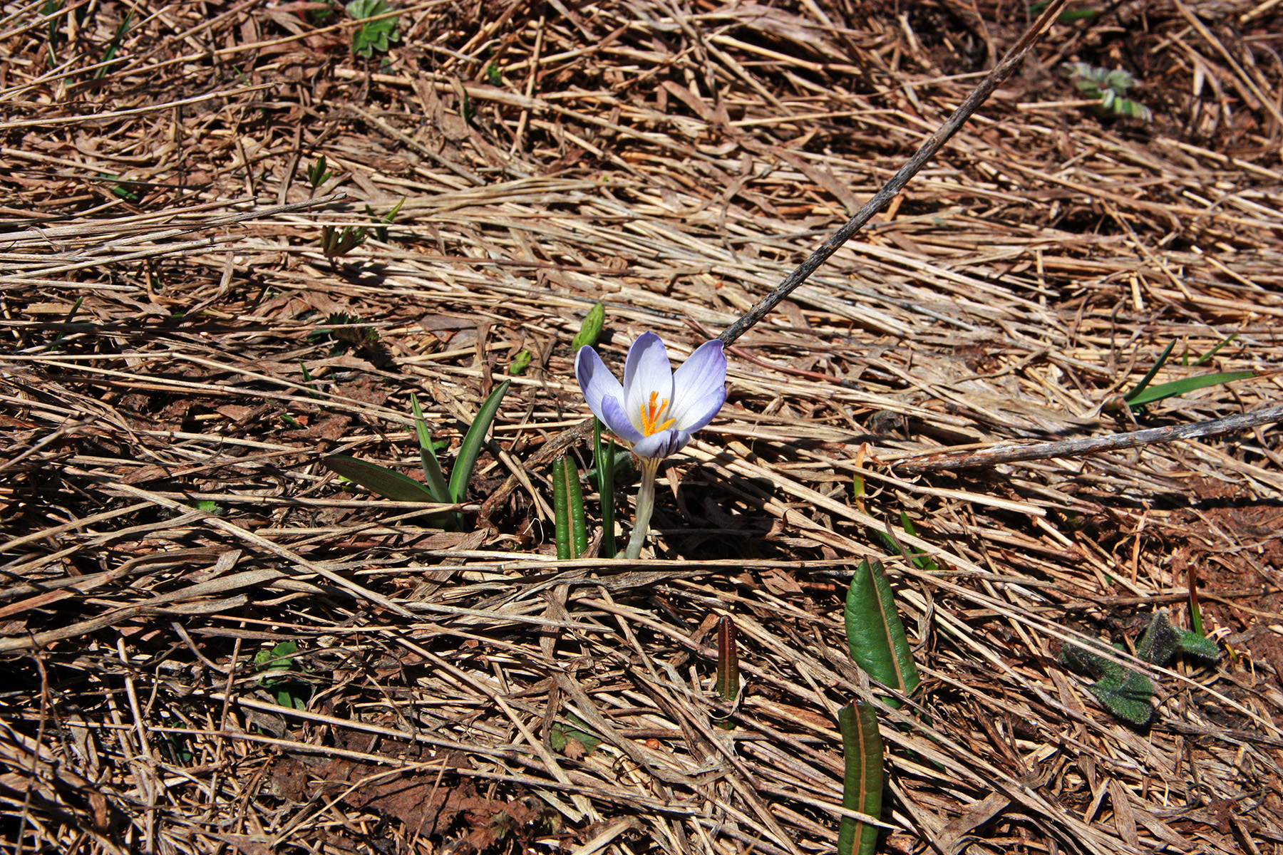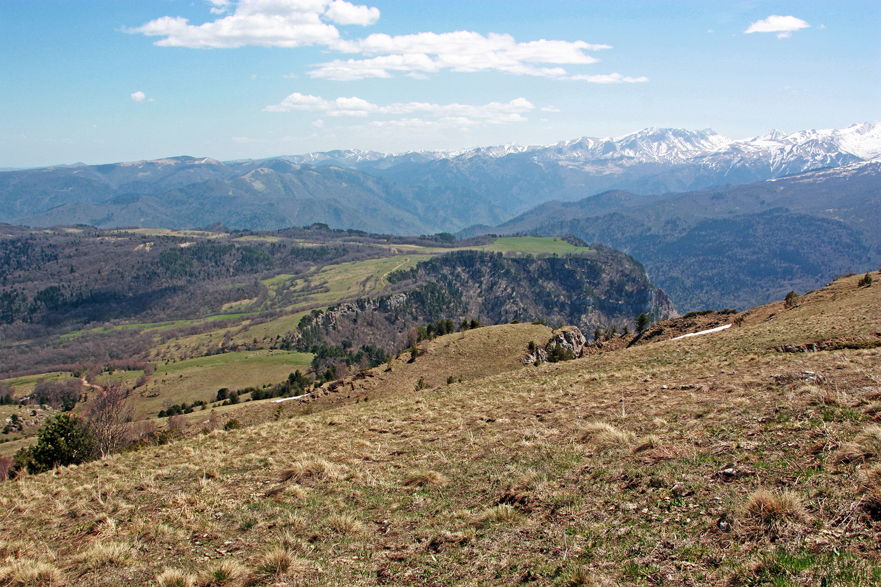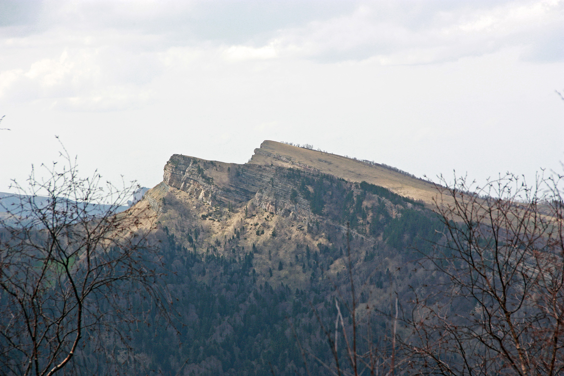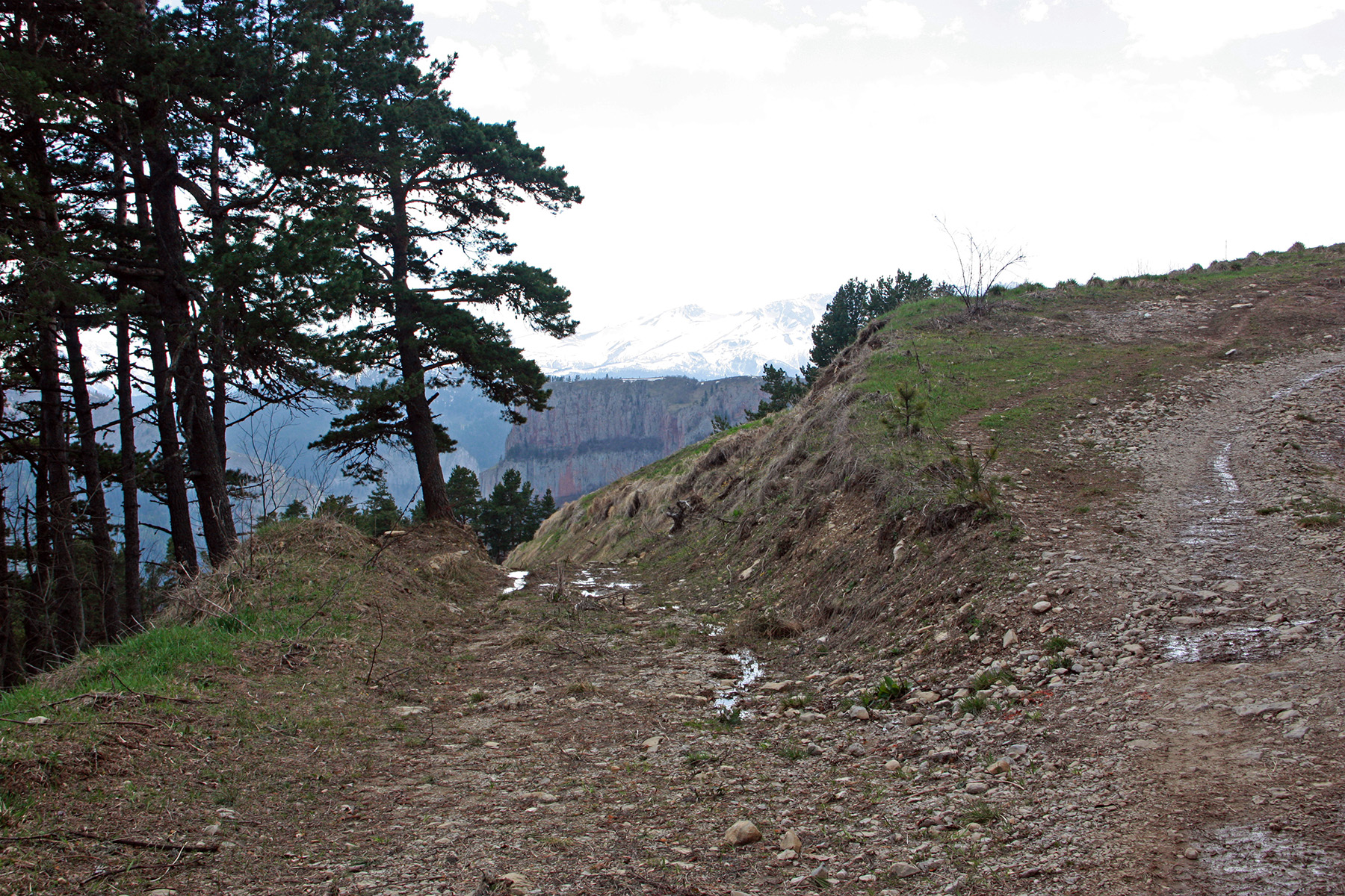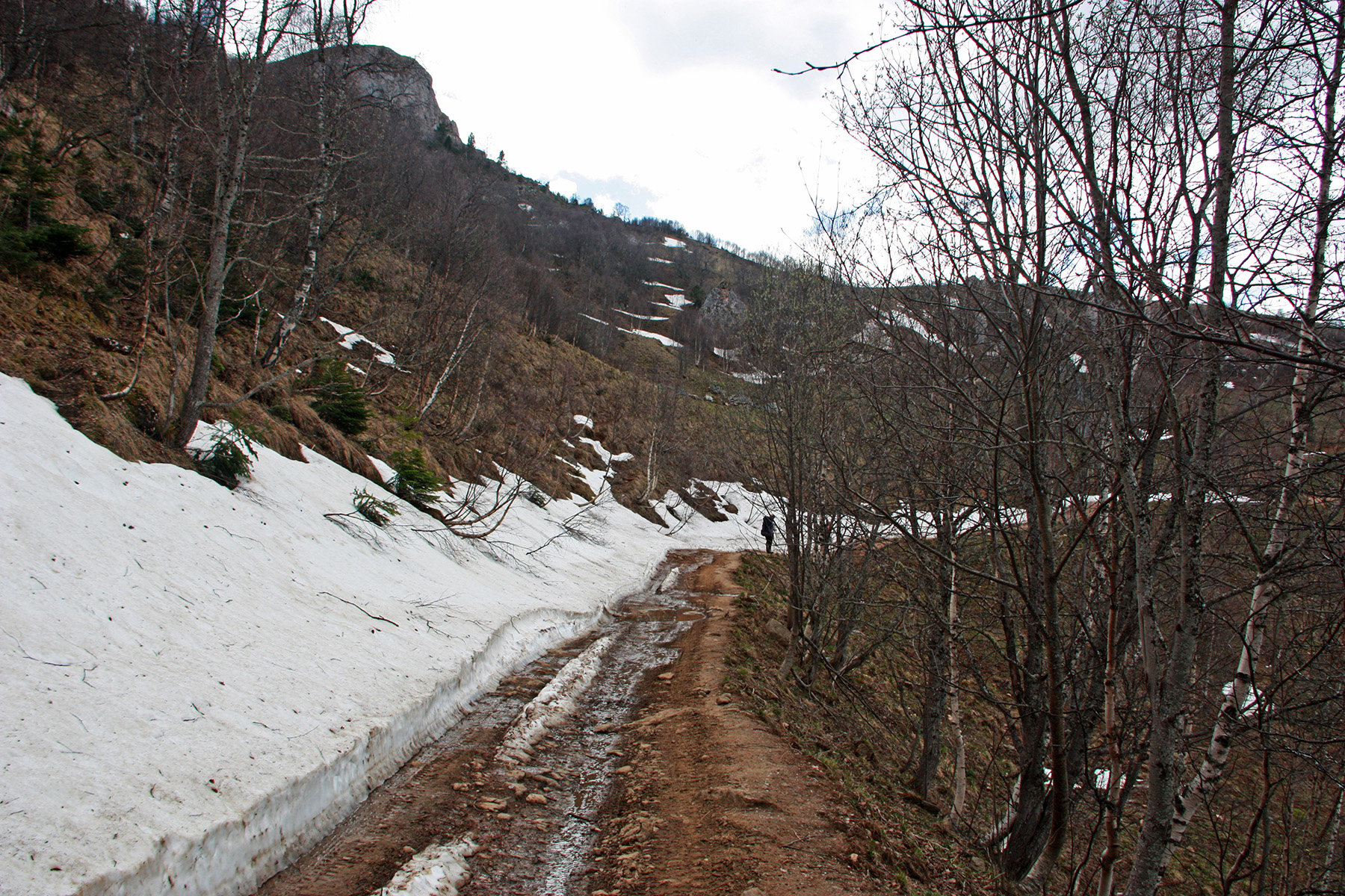 Пока шли по гребню к вершине, внизу по дороге прошла «Нива», в сторону Чай-горы. А с вершины видим, что ей не удалось пройти далеко. Упёрлись в снег на дороге. Он ещё не успел растаять. В общем, дальше только пешком.