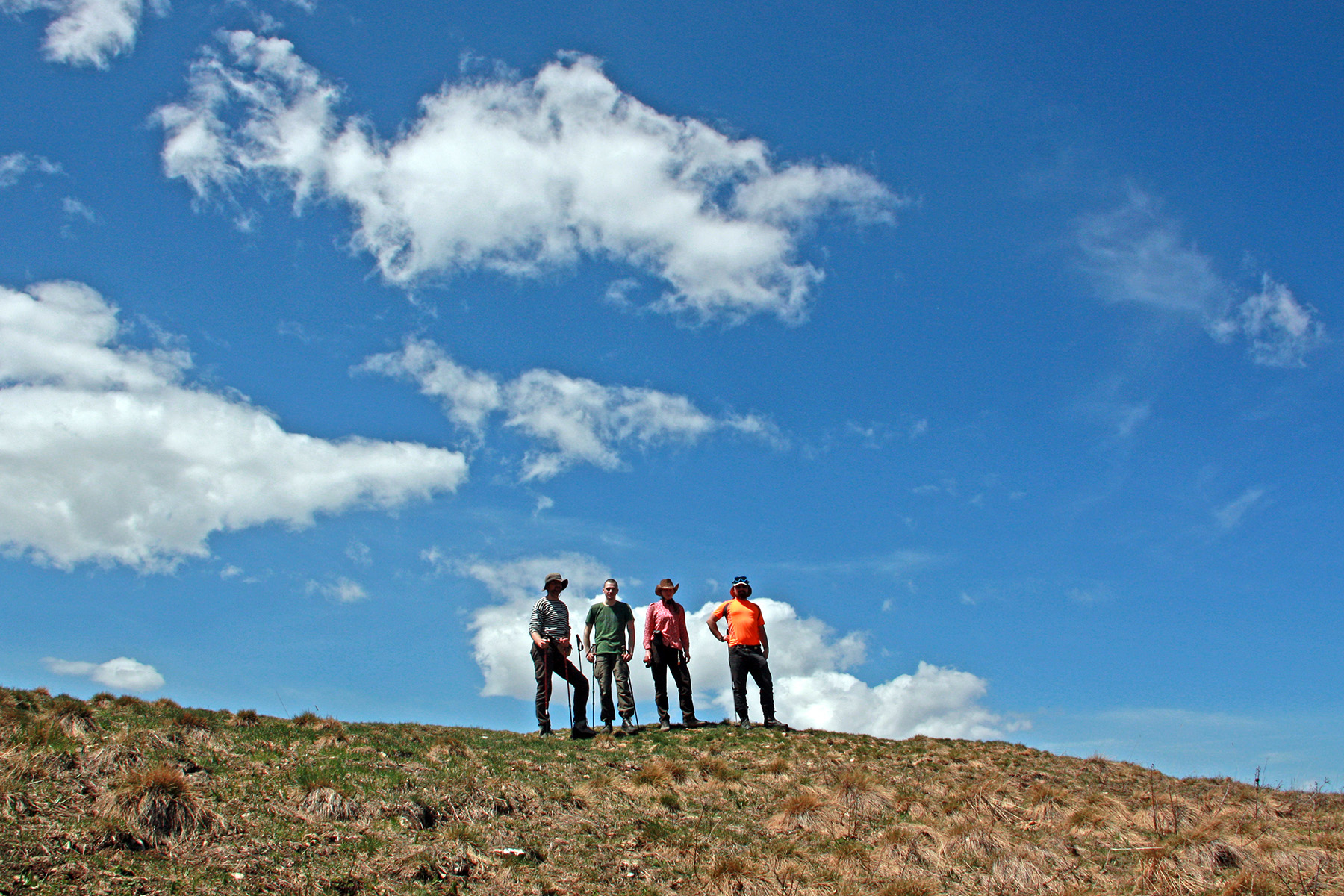 Спускаемся по травянистым склонам. Тропы не видим, ходим по склону влево-вправо, выбирая, где удобнее. Направление держим на родник. В нижней части пути, навстречу нам поднимаются несколько человек. Те, «из кузова», спрашивают, мол, до вершины далеко? Говорим, что ещё минут 20-30, если в темпе. Часть возвращается, 2 или 3 продолжают «восхождение».