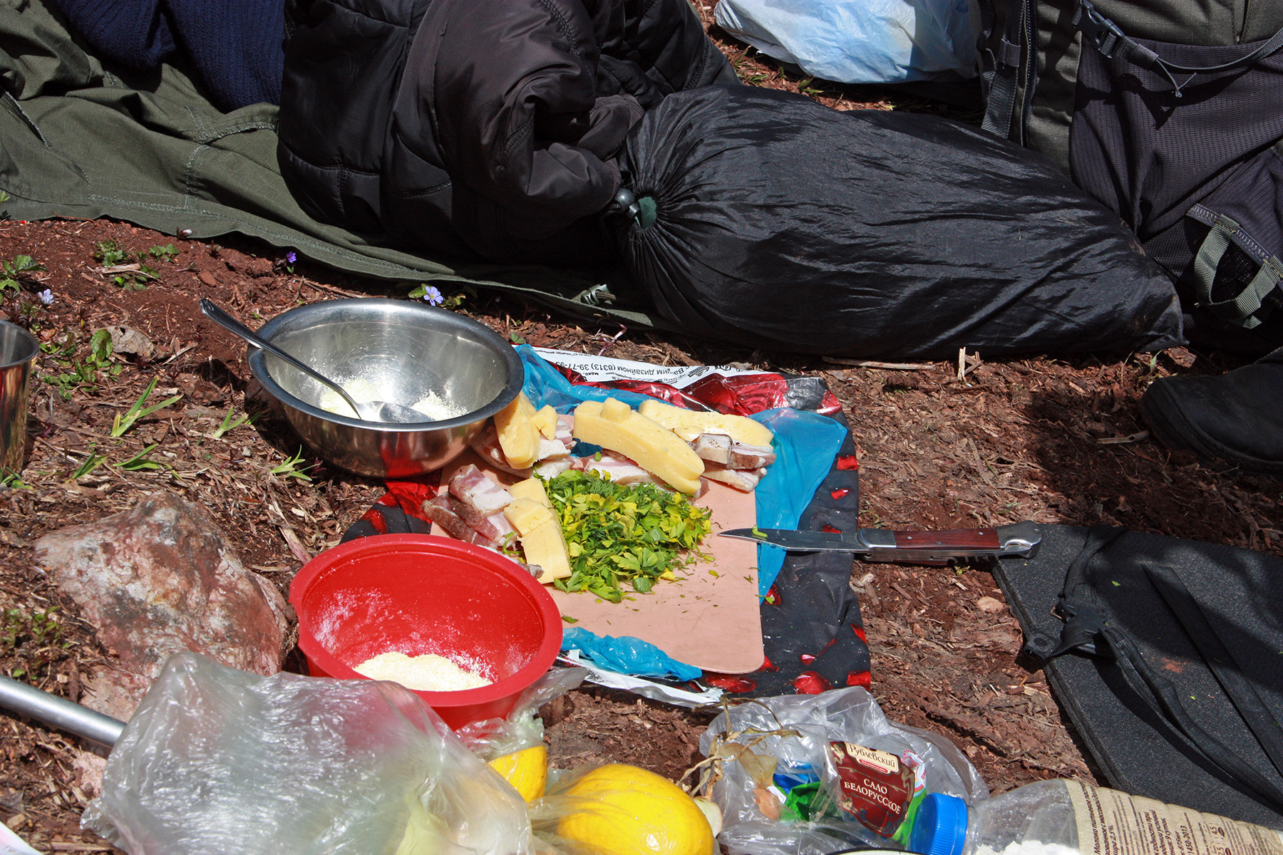 Далее «свободный график», кто спать, кто дремать, кто гулять. Ограничений нет. Я в палатку, подремать. Дождь начинался и заканчивался, группы проходили, наши шастали вокруг. К четырём народ затребовал чайку. Пожалуйста. Только решили для быстроты вскипятить на горелке.