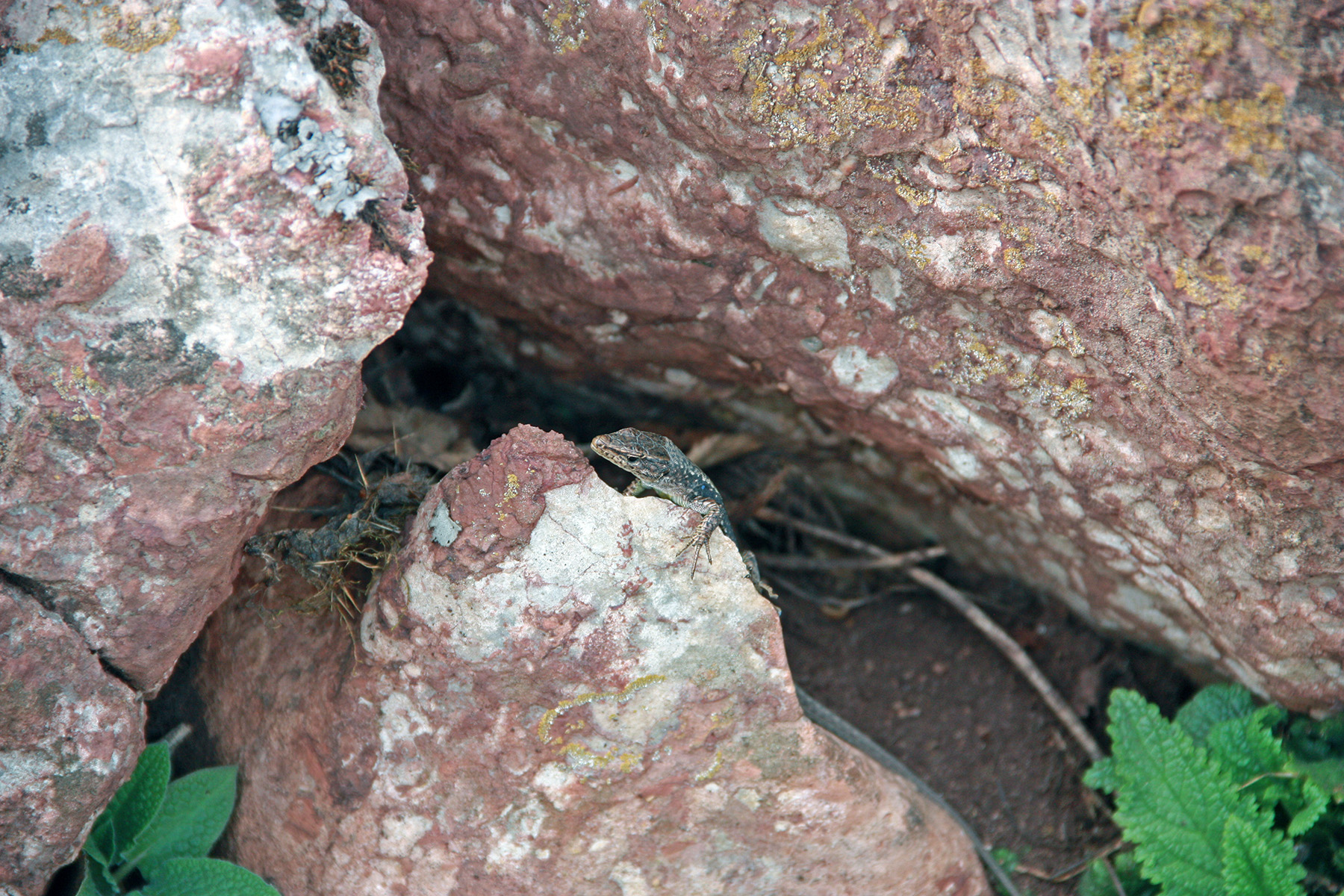 Со вкусом обедаем на виду у «из кузова». Они сидят в кузове, на солнцепёке, ждут тех, кто пошёл на вершину. А наше «быстренько» растянулось на 1-40. Кушали, болтали, перекладывали рюкзаки. Приглашали местных ящериц на фотосессию. Те кокетничали и не соглашались.