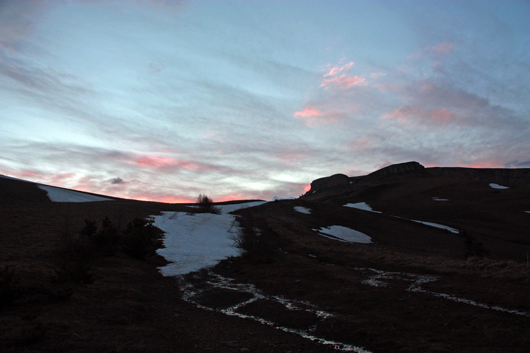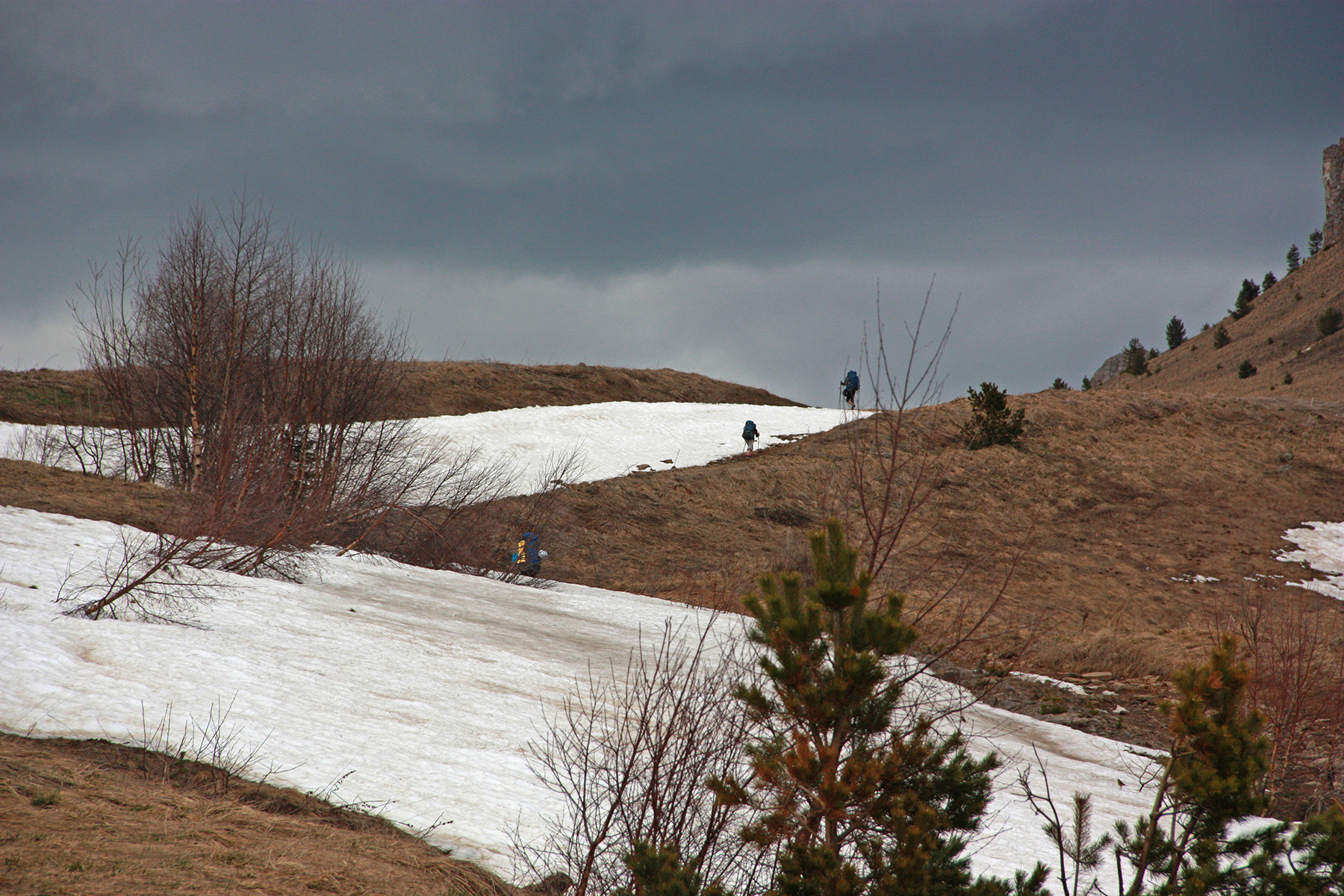Где-то я просчитался с потребным временем на прохождение к плато перед Ачешбоками. Впереди как минимум ещё 2 перехода. Над головой зреет что-то дождливое. Если начнётся в течении ближайшего часа, то вымокнем сильно. А если стать сейчас, то и дров можно поискать. Была бы вода.