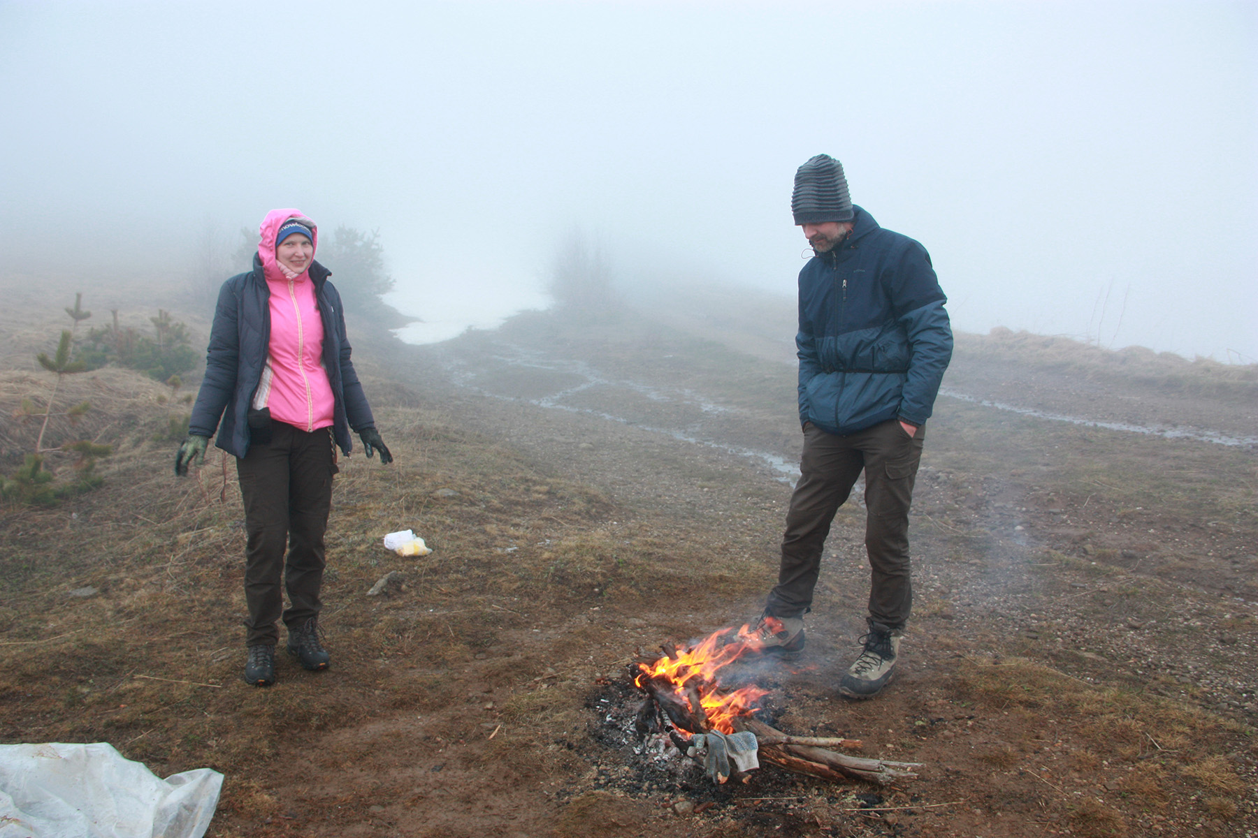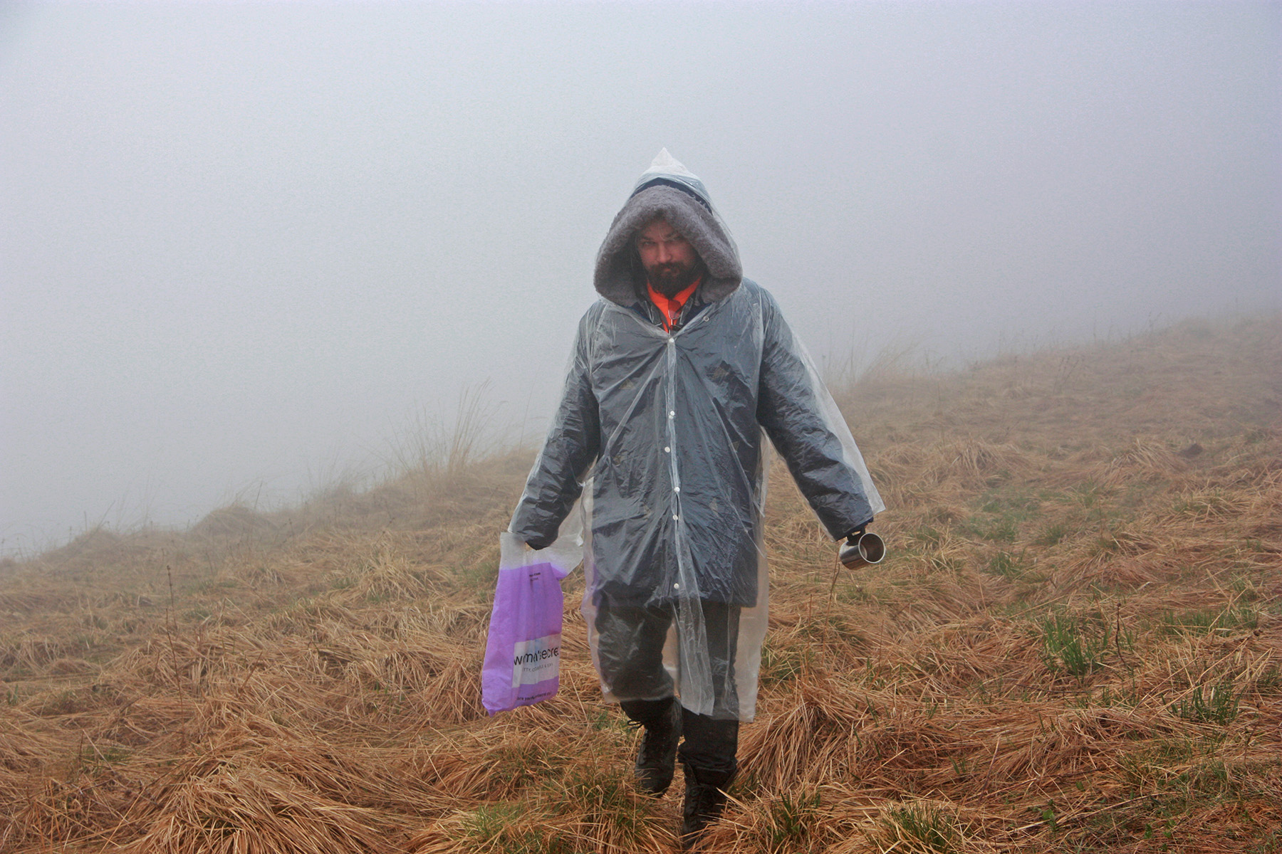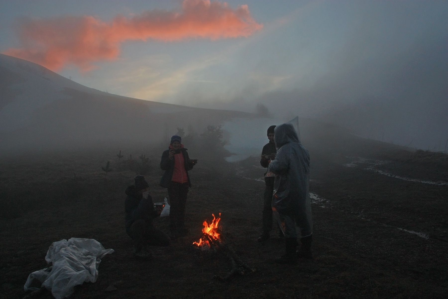 17-42. Мимо проходит группа с собакой. Тоже, в сторону Шапки. По времени им дойти только до родника под Шапкой. Дальше темнота накроет. Они проходят, а нас пока накрывает туманом.