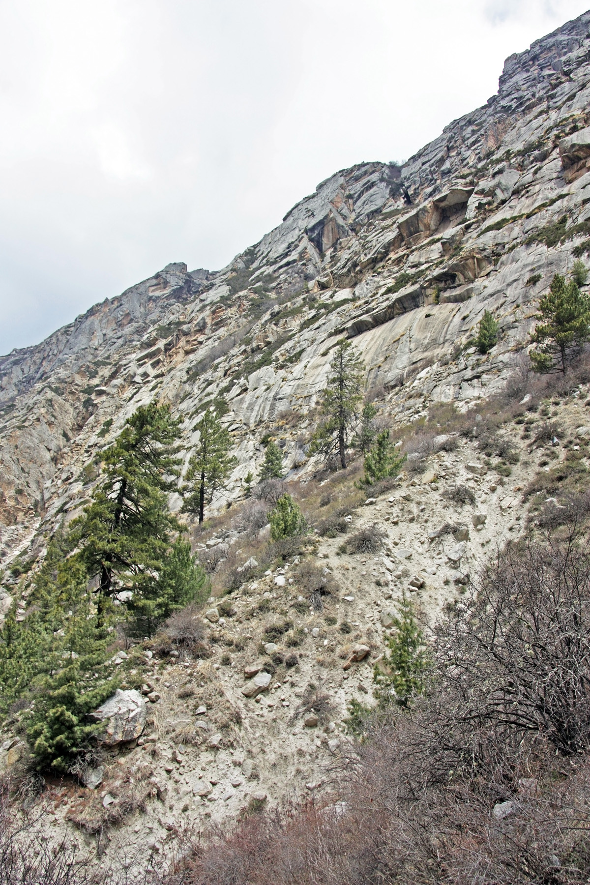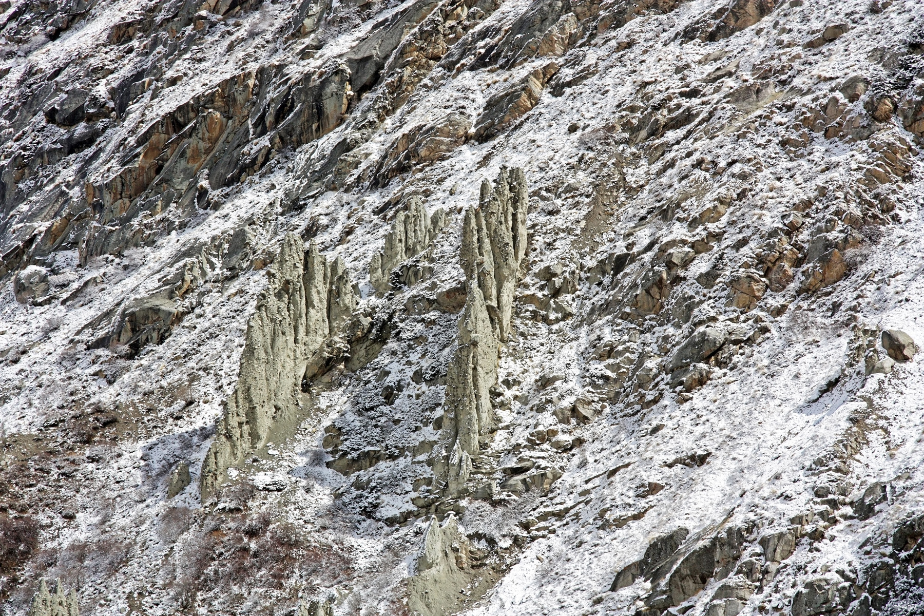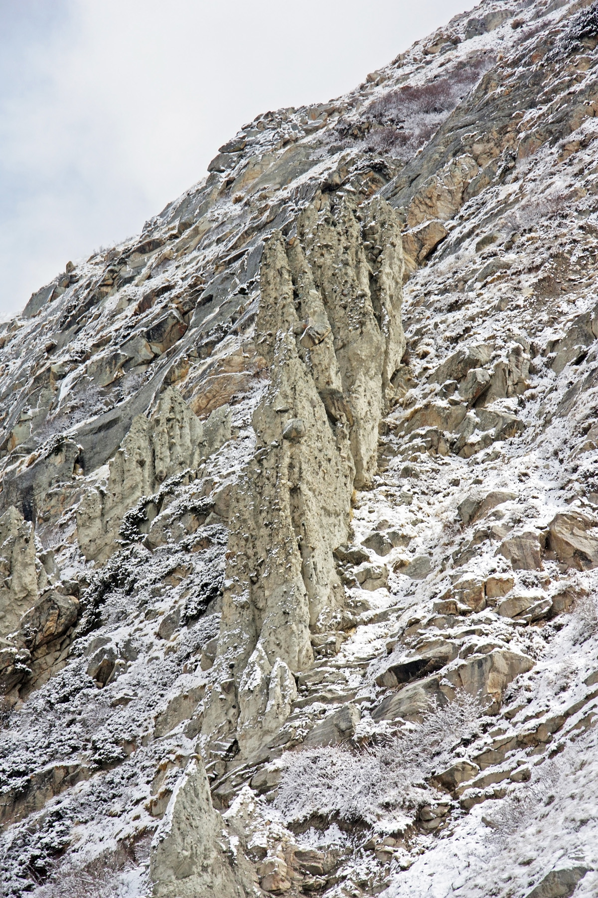В 9-30 замечаю, что лес, в котором мы нашли приют, стал освобождаться от снега. Теплеет, солнышко греет. И мы подходим к проходу в гряде моренных останцев. Стоят стеной, над тропой. Не частое явление в горах. У нас на Кавказе мне подобное встречалось в ущелье Ирик (Баксан), Чараксу (Чегем). Есть подобное в «долине нарзанов» около Джилы-Су. Но выглядит не так впечатляюще.
