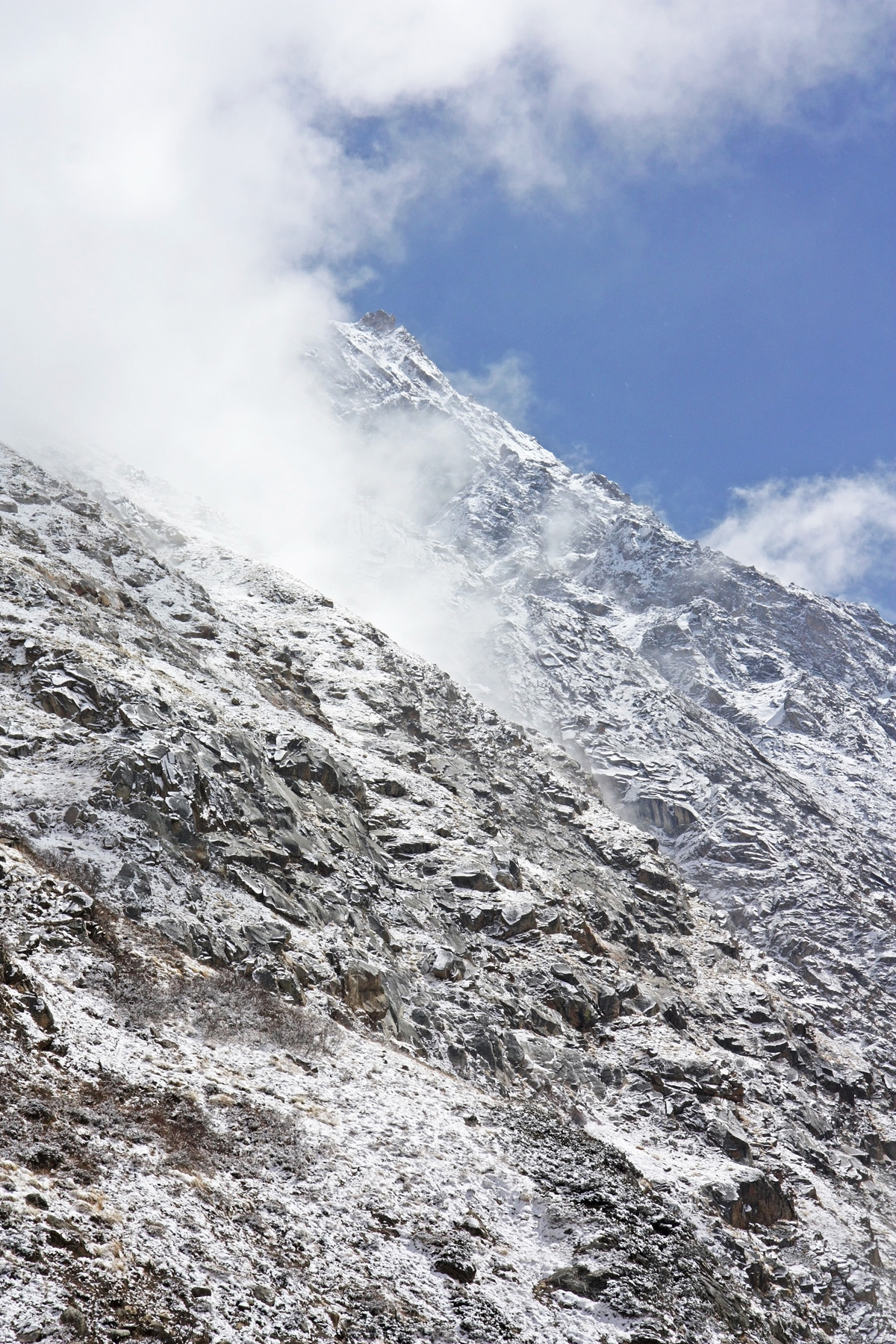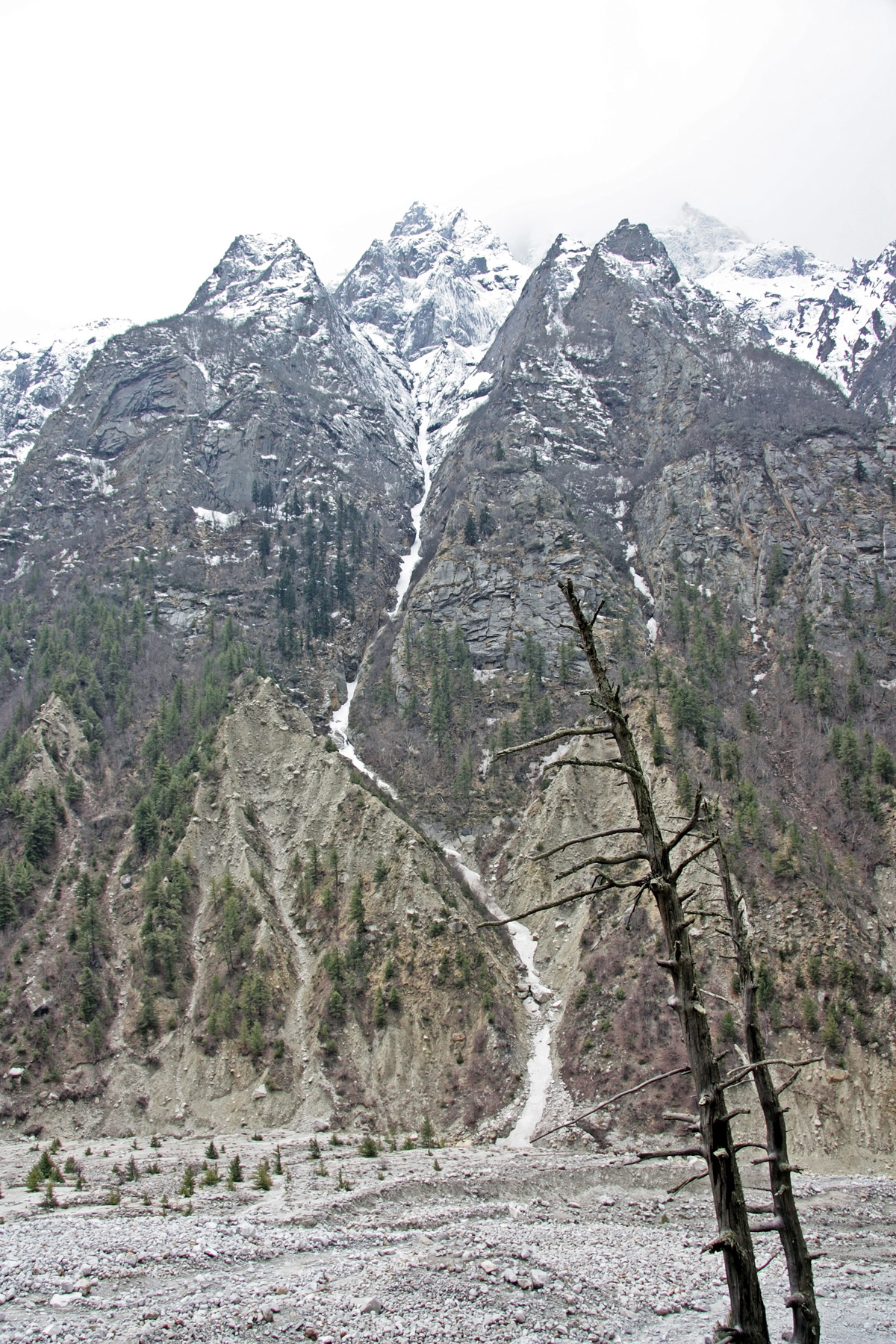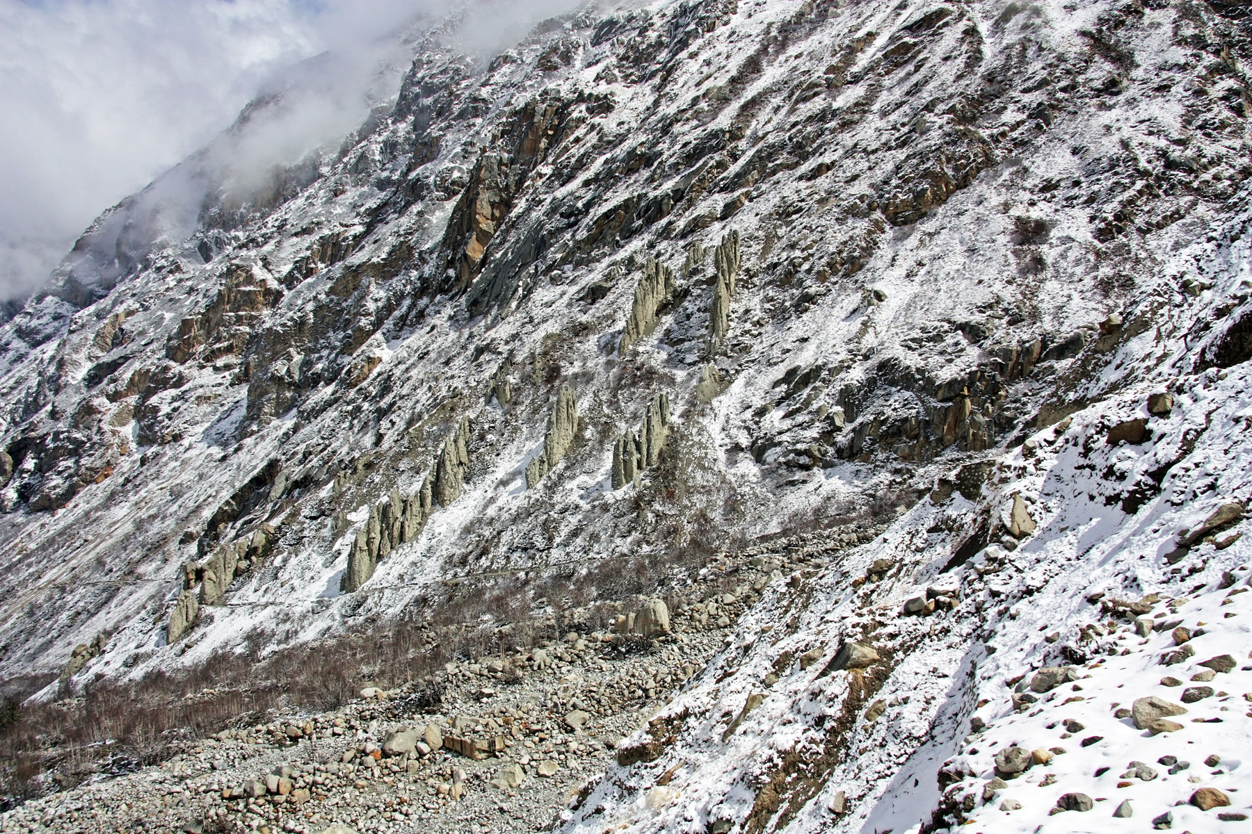Постепенно подходим к мощному выносу обломочного материала из ущелья на левом борту долины Бхагиратхи. Там находится ледник Bhrigupanth. Слева от ущелья прячется в облаках вершина Nandi Paravt. Делаю панораму. Утренние горы, в свежем снегу, прекрасны. Время 10-07.