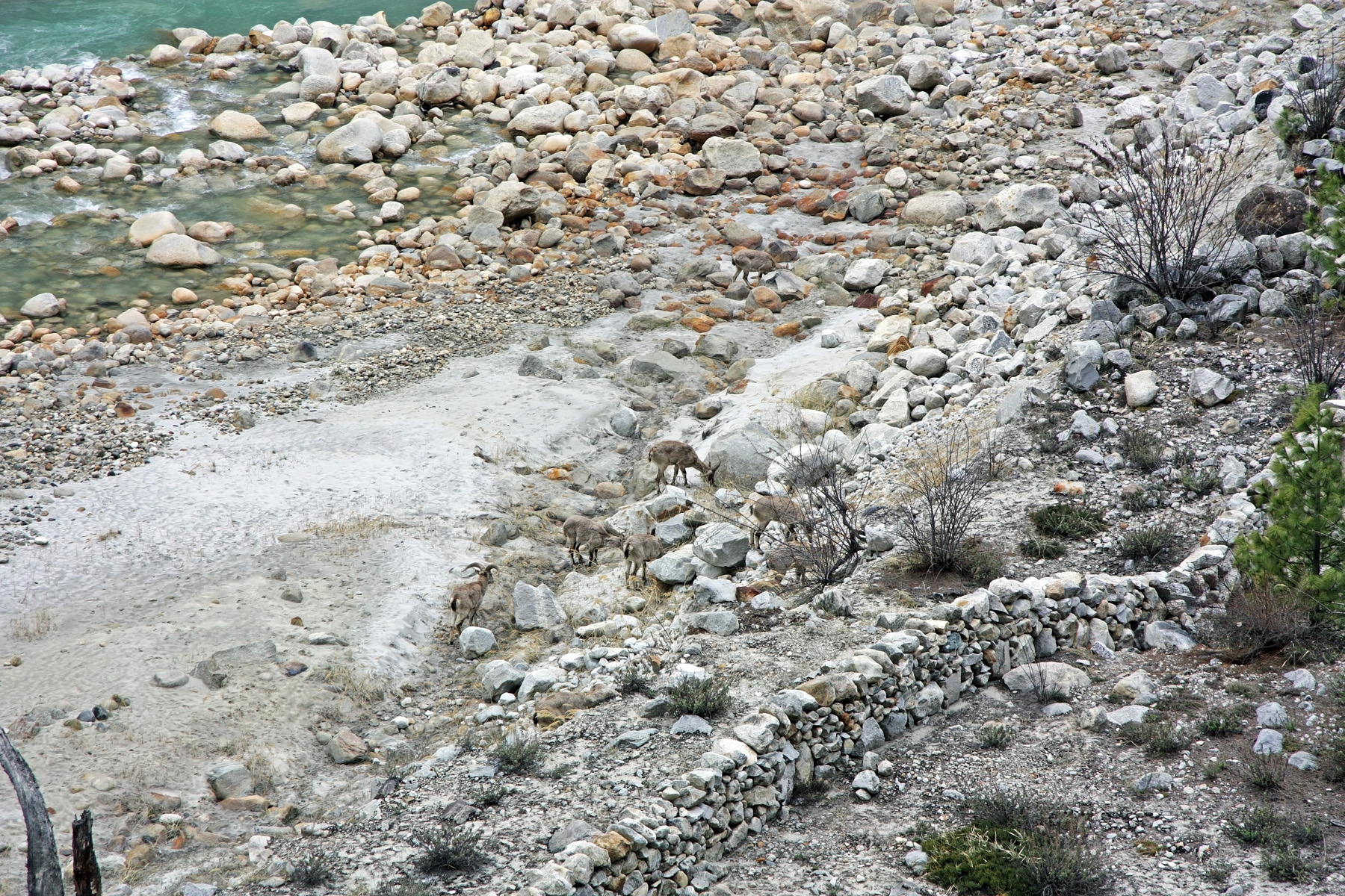 За 25 минут пересекаем весь этот селевой конус, и с другой стороны, на стационарном участке тропы, садимся на привал. Здесь внизу, подходы к тропе отгорожены от реки стенкой, сложенной из камней. А за стенкой пасётся стадо голубых баранов. По местному «нахуры». Сидим, фотографируем.