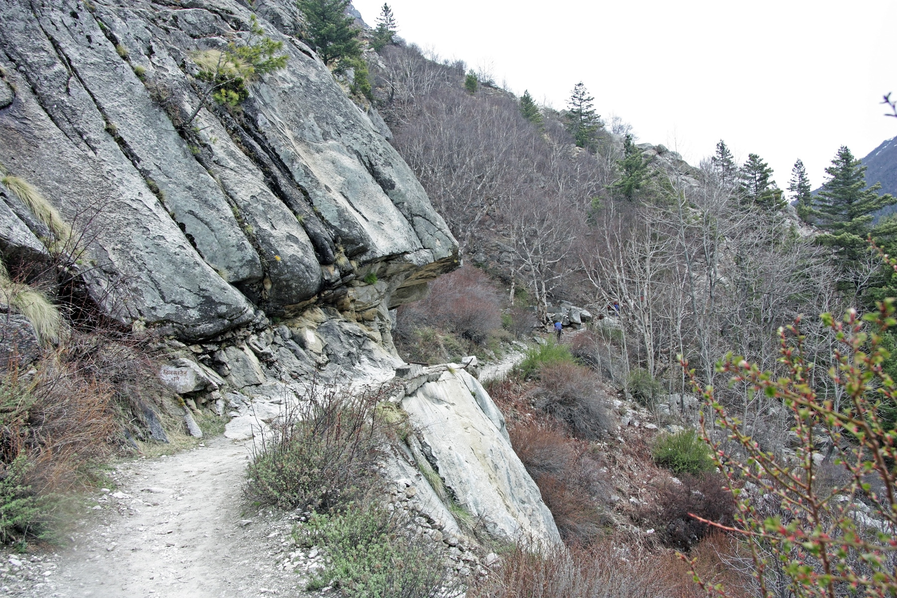 В 11-19 подходим к селевому выносу из бокового ущельица. Река из него зовётся «Deo Gad». В узкой части видно несколько защитных стенок. Через вынос протоптана тропа. Хорошо протоптана, за счёт количества паломников. Но не капитальная, как предыдущий участок. Подвержена частым изменениям из-за селевых сходов. Похоже, есть служба, следящая за состоянием тропы, и «перетаптывающем» её.