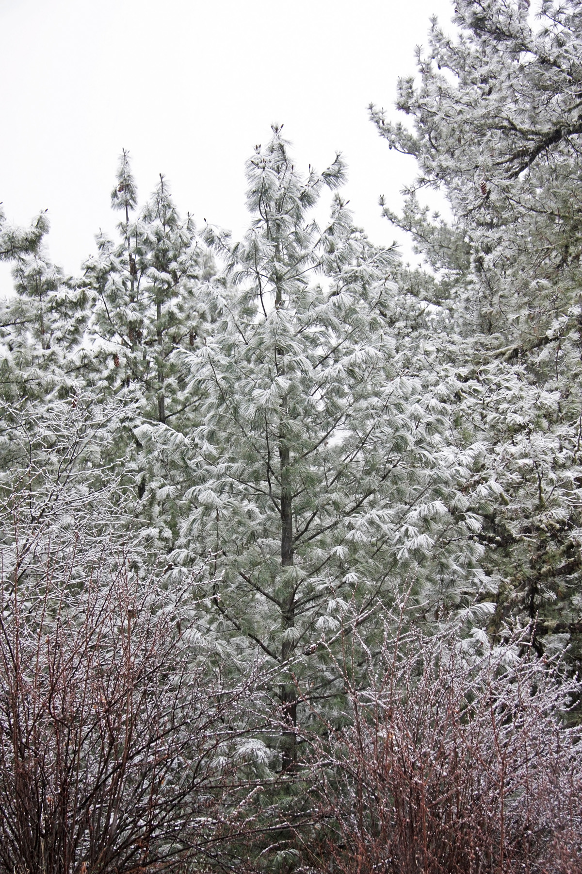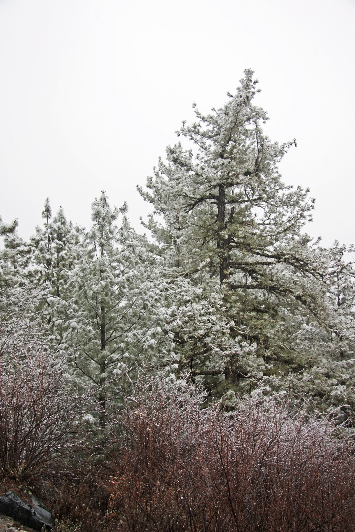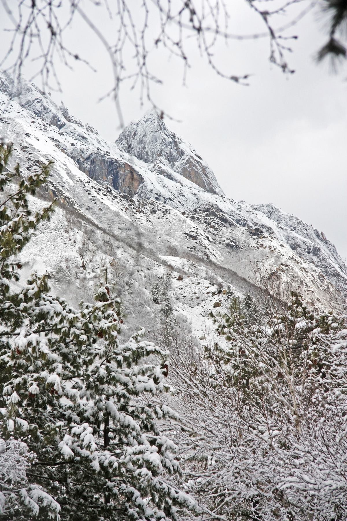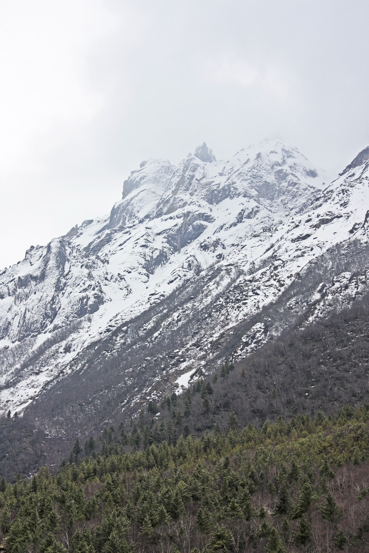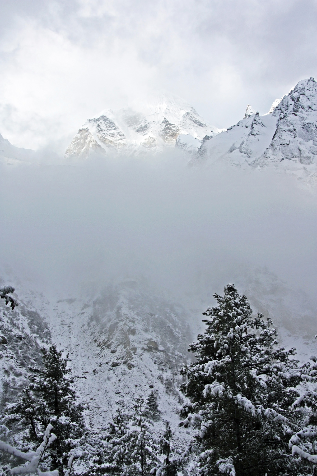 Снимать есть чего, заснеженные горы, заснеженные склоны. Ущелье в свежевыпавшем снегу. Снег на тропе, реку в заснеженном русле. Погода к этому времени улучшилась, перестал накатывать туман. Над головой сформировалось устойчивое «голубое окно». Но гребни и боковые ущелья ещё закрыты облачностью.