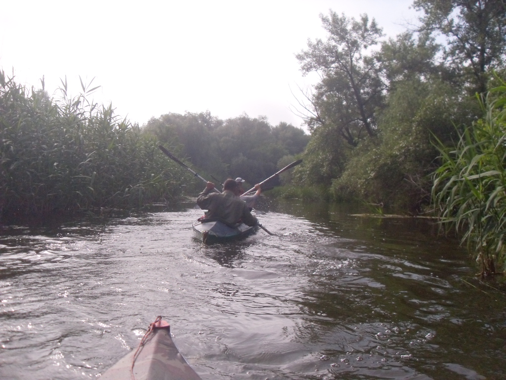 Выплыли на оперативный простор. Догнали спортсменов-туристов, но те не дали тихо просочиться перед ними. Ну что, гоняться так гоняться! В результате оба экипажа ушуршали в камыши. Байдарки задним ходом вытаскивали подоспевшие товарищи. Первое байдарочно-транспортное происшествие.