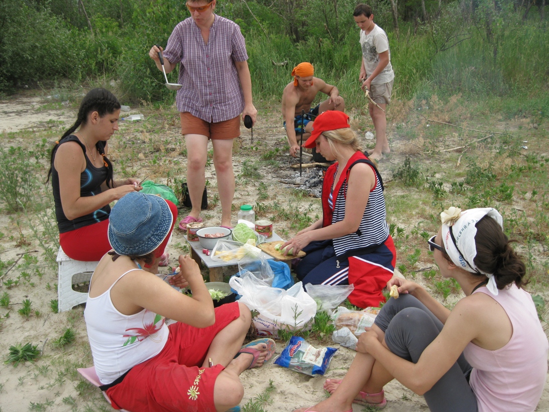 11 июня. Вечер: а ничего так у нас получается грести…. Мы в середине пелотона уже – обогнали школьников и пожилых с барышнями. Маячат перед нами спины спортсменов-туристов! Ну ничего, завтра мы вам покажем. На ночлег устроились на о. Поречный (т.4). Здесь, говорят, живут дикие лошади. Парнокопытных мы не увидели, а вот следов их (разнообразных) – великое множество. И вообще, черт с ней, с донской водой! Термическая обработка убивает все бактерии, так что чаек с костра пила вместе со всеми.