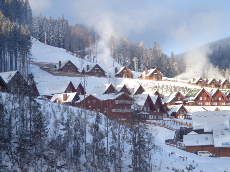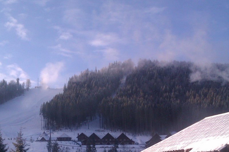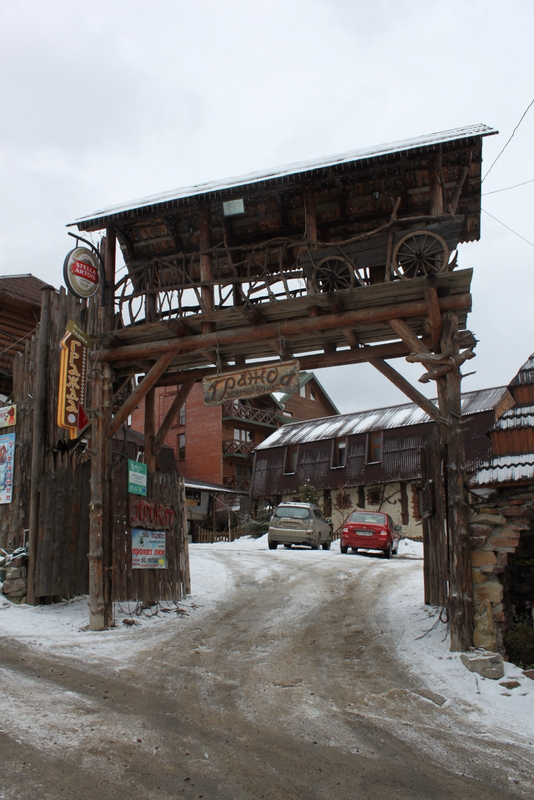 Поселок Буковель достаточно большой, но практически все строения – это либо шале самого поселка, либо частные гостиницы. Людям, которые привыкли к частному сектору, а-ля квартиры, придется жить в соседней деревне, что добавить трудностей с перемещениями. Зато ландшафт выглядел очень симпатично, даже в отсутствие солнца. Вдалеке работали снеговые пушки, а вокруг прогуливался туристический народ.