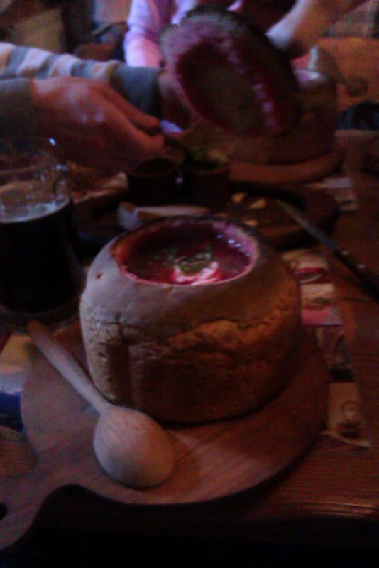 Мы побросали вещи, и пошли обедать в ближайший ресторан, который оказался весьма необычным. Погружение в Украину прошло вместе с борщом в булке, салом и девушкой официанткой, которая пыталась добиться от нас отзывов на украинском. Вообще все, что говорили, было вполне понятно, за исключением некоторых сложных фраз или когда говорили очень быстро.
