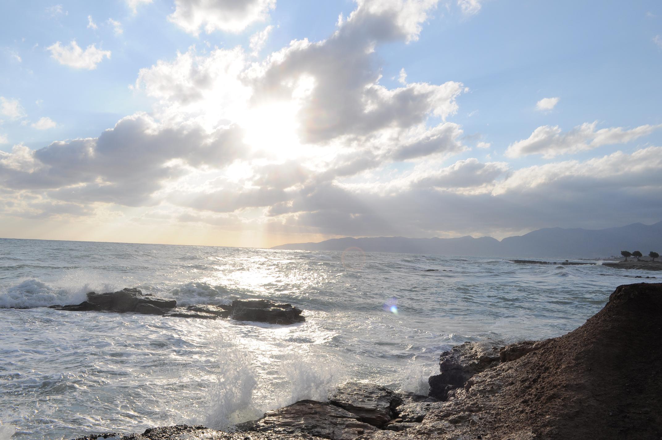 Самолет снижается над морем, Крит кажется в стороне и ощущение, что садиться сейчас будем на воду, время 6 утра, мягкая посадка, и мы прибываем в город Ираклион (Heraklion), который носит имя известного нам героя Геракла и является негласной столицей Крита. Доезжаем до города Херсонисосс (да, здесь действительно мало спят), он расположен километрах в 30 от Ираклиона, и забыв про усталость направляемся к морю, которое нас встречает искрящимися волнами и солеными брызгами.