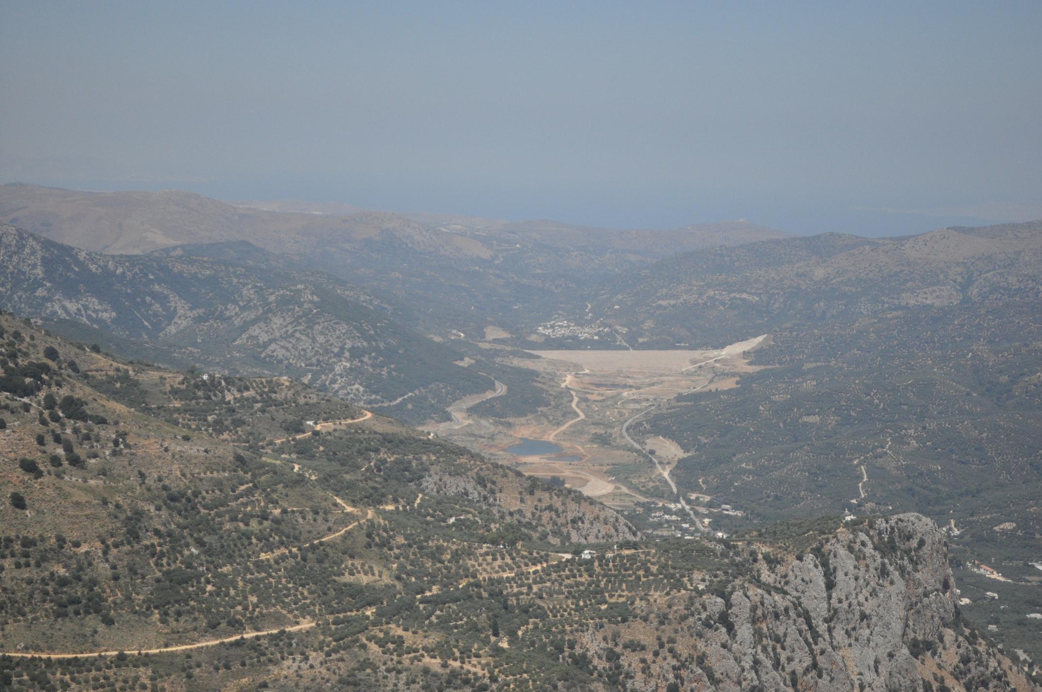 Плато находится в низу, горы образуют чашу, когда-то давно здесь было озеро, поднявшись вверх пешком мы попадаем в пещеру Зевса, по преданию мать Зевса спрятала его здесь от отца Крона- который поедал своих детей и горная коза вскармливала его молоком, глубина пещеры около 150метров.